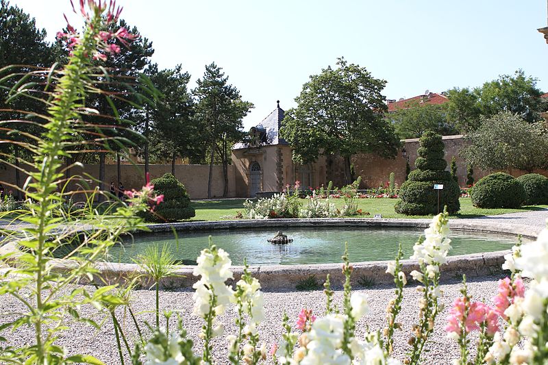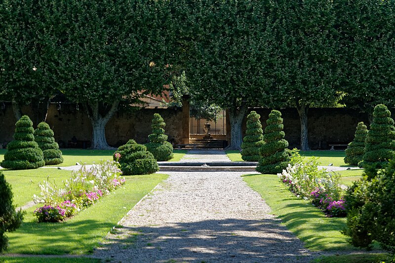 Le jardin à la française, reconstitué d'après des gravures du XVIIe siècle et ouvert au public, est centré sur une fontaine circulaire ornée d'un putti; des pavillons d'angle subsistent, dont l'un transformé en chapelle au XIXe siècle, et les extérieurs étaient dès l'origine ceints de murs crénelés pour protéger la propriété.
