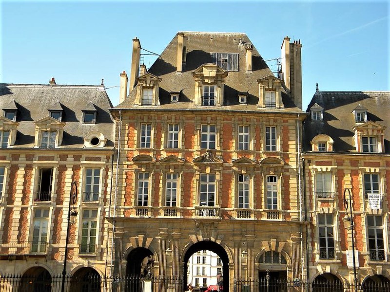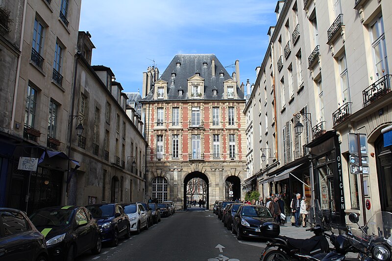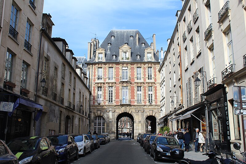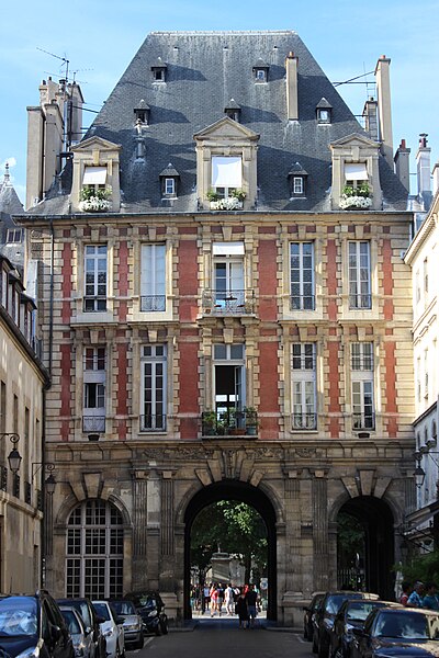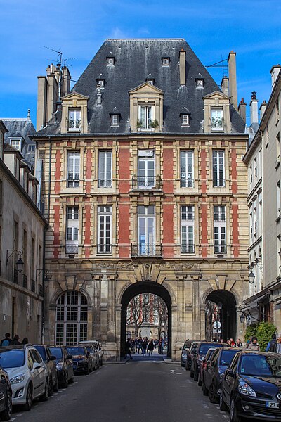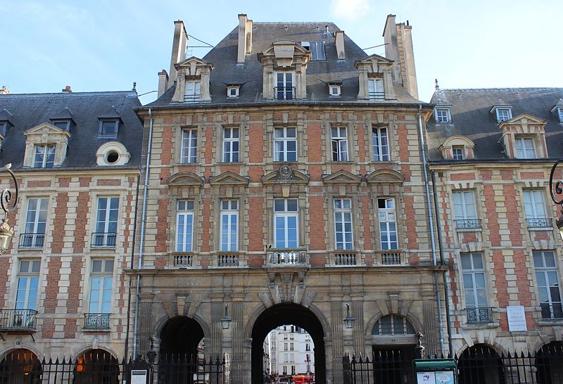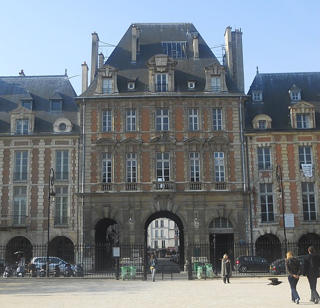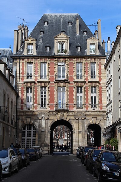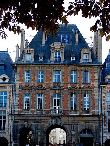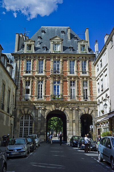 Le Pavillon du Roi occupe la partie centrale du côté sud de la place Royale, devenue place des Vosges, au 1 place des Vosges, et fait face à la statue équestre de Louis XIII. Construit au début du XVIIe siècle, entre 1605 et 1608, il a été financé par la couronne et réalisé sous la maîtrise d’ouvrage de la surintendance des bâtiments du roi ; la maçonnerie fut assurée par le maître maçon Jonas Robelin et la conception est attribuée à Louis Métezeau. Destiné à servir d’entrée principale à la place, dans l’axe de la rue de Birague qui reliait la place à la rue Saint-Antoine, le roi n’y a toutefois jamais résidé. Le pavillon est resté propriété royale jusqu’à la Révolution, puis a connu de nombreux propriétaires et locataires au cours des siècles suivants. Il jouxte l’Hôtel Coulanges (1 bis) et forme, avec le Pavillon de la Reine en vis‑à‑vis au nord, l’ensemble principal de la place ; ces deux pavillons sont plus élevés que les autres bâtiments qui l’entourent. Comme les autres pavillons, il comporte deux étages carrés en brique et pierre et une haute toiture en pavillon, mais s’en distingue par sa plus grande hauteur et par son rez‑de‑chaussée en pierre percé de trois arcades inégalement hautes, scandées de pilastres doriques cannelés évoquant un arc de triomphe. Le premier étage était à l’origine l’étage noble occupant tout le pavillon ; au XVIIe siècle il comprenait une grande salle centrale traversante, un cabinet à l’ouest et, à l’est, deux cabinets séparés par une petite pièce centrale. Transformé ensuite en immeuble locatif puis en copropriété, cet étage a subi d’importantes modifications, surtout au XIXe et au début du XXe siècle, avec cloisonnements et création d’entresols pour répondre à la demande locative. Des travaux entrepris en 2018 ont permis de dégager des plafonds à poutres et solives originels et de mettre au jour, dans les trois pièces orientales, des décors peints à l’huile bien conservés, datables de la première moitié du XVIIe siècle. Le décor le plus élaboré se situe dans l’ancien cabinet sud‑est : les solives portent des motifs blancs et ocres sur fonds rouges, bleus et ocres, alternant cuirs découpés à rosace centrale et anges en buste ou entrelacs enrichis de tiges florales. Le plafond de l’ancienne petite pièce centrale présente, en camaïeu de brun et d’ocre, des motifs floraux stylisés alternant avec des cartouches de formes variées. Dans l’ancien cabinet nord‑est, seules les poutres de rive sont ornées, en camaïeu d’ocre et de brun, de motifs stylisés et de dentelures, tandis que les solives reçoivent une couche monochrome brune similaire à la préparation des parties décorées. Cette peinture monochrome, que l’on retrouve sur les autres plafonds de l’étage, dans l’ancienne grande salle et l’ancien cabinet ouest, peut être interprétée soit comme une couche préparatoire pour un décor peint non réalisé, soit comme une finition en faux bois destinée à uniformiser les éléments. Les parties extérieures de l’édifice sont classées au titre des monuments historiques depuis 1956 et certaines parties intérieures ont été inscrites en 2022.