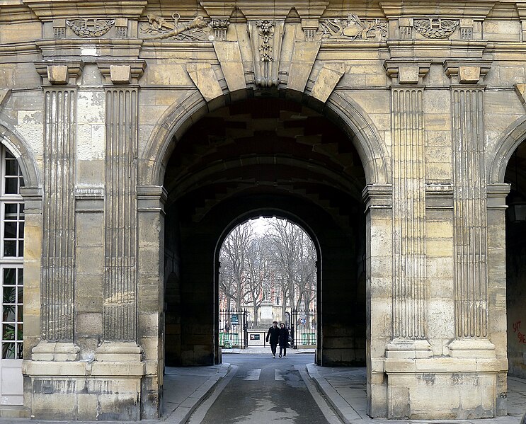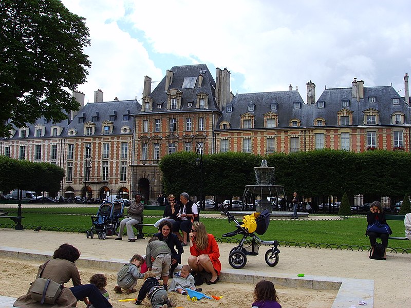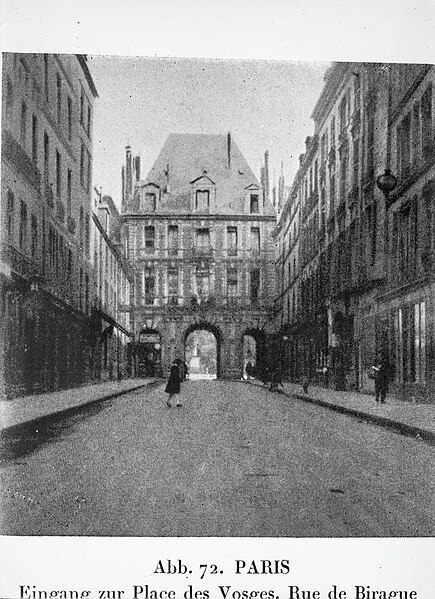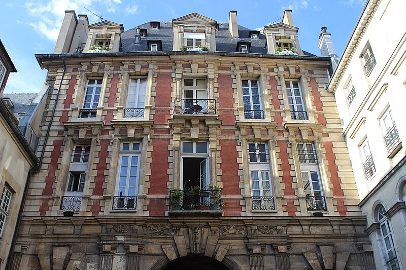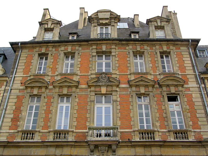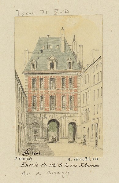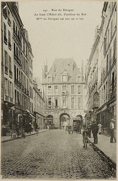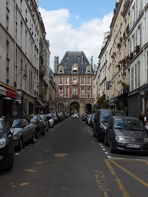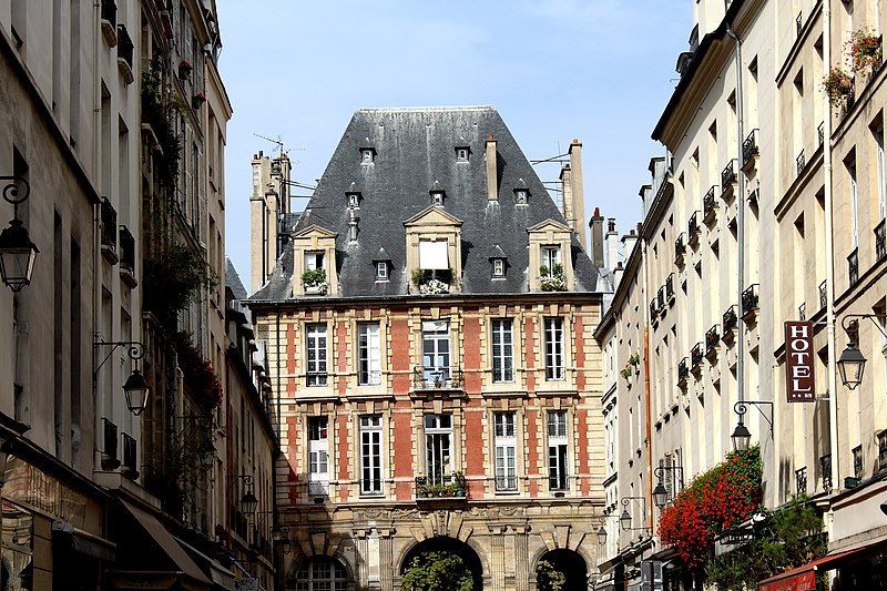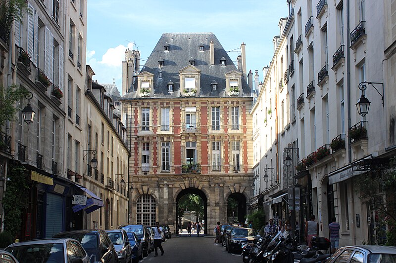 Le Pavillon du Roi occupe la partie centrale du côté sud de la place Royale, devenue place des Vosges, au 1 place des Vosges, et fait face à la statue équestre de Louis XIII. Construit au début du XVIIe siècle, entre 1605 et 1608, il a été financé par la couronne et réalisé sous la maîtrise d’ouvrage de la surintendance des bâtiments du roi ; la maçonnerie fut assurée par le maître maçon Jonas Robelin et la conception est attribuée à Louis Métezeau. Destiné à servir d’entrée principale à la place, dans l’axe de la rue de Birague qui reliait la place à la rue Saint-Antoine, le roi n’y a toutefois jamais résidé. Le pavillon est resté propriété royale jusqu’à la Révolution, puis a connu de nombreux propriétaires et locataires au cours des siècles suivants. Il jouxte l’Hôtel Coulanges (1 bis) et forme, avec le Pavillon de la Reine en vis‑à‑vis au nord, l’ensemble principal de la place ; ces deux pavillons sont plus élevés que les autres bâtiments qui l’entourent. Comme les autres pavillons, il comporte deux étages carrés en brique et pierre et une haute toiture en pavillon, mais s’en distingue par sa plus grande hauteur et par son rez‑de‑chaussée en pierre percé de trois arcades inégalement hautes, scandées de pilastres doriques cannelés évoquant un arc de triomphe. Le premier étage était à l’origine l’étage noble occupant tout le pavillon ; au XVIIe siècle il comprenait une grande salle centrale traversante, un cabinet à l’ouest et, à l’est, deux cabinets séparés par une petite pièce centrale. Transformé ensuite en immeuble locatif puis en copropriété, cet étage a subi d’importantes modifications, surtout au XIXe et au début du XXe siècle, avec cloisonnements et création d’entresols pour répondre à la demande locative. Des travaux entrepris en 2018 ont permis de dégager des plafonds à poutres et solives originels et de mettre au jour, dans les trois pièces orientales, des décors peints à l’huile bien conservés, datables de la première moitié du XVIIe siècle. Le décor le plus élaboré se situe dans l’ancien cabinet sud‑est : les solives portent des motifs blancs et ocres sur fonds rouges, bleus et ocres, alternant cuirs découpés à rosace centrale et anges en buste ou entrelacs enrichis de tiges florales. Le plafond de l’ancienne petite pièce centrale présente, en camaïeu de brun et d’ocre, des motifs floraux stylisés alternant avec des cartouches de formes variées. Dans l’ancien cabinet nord‑est, seules les poutres de rive sont ornées, en camaïeu d’ocre et de brun, de motifs stylisés et de dentelures, tandis que les solives reçoivent une couche monochrome brune similaire à la préparation des parties décorées. Cette peinture monochrome, que l’on retrouve sur les autres plafonds de l’étage, dans l’ancienne grande salle et l’ancien cabinet ouest, peut être interprétée soit comme une couche préparatoire pour un décor peint non réalisé, soit comme une finition en faux bois destinée à uniformiser les éléments. Les parties extérieures de l’édifice sont classées au titre des monuments historiques depuis 1956 et certaines parties intérieures ont été inscrites en 2022.