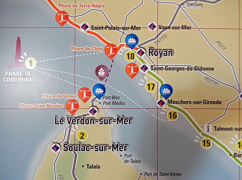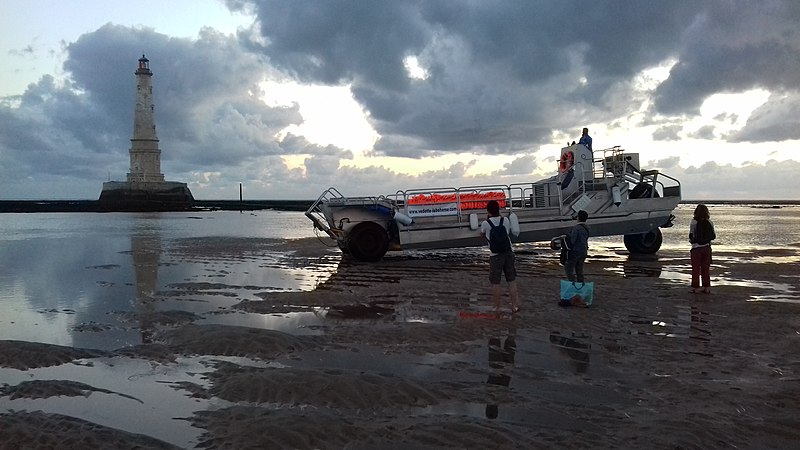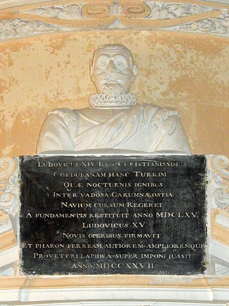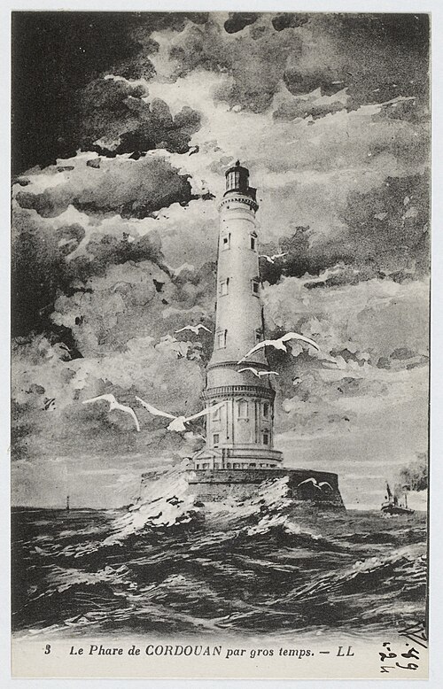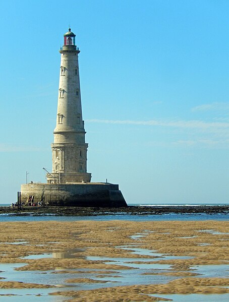 Le phare de Cordouan se dresse sur le plateau de Cordouan, à sept kilomètres en mer, à l'entrée de l'estuaire de la Gironde, à la limite entre l'océan Atlantique et les côtes de la Charente‑Maritime et de la Gironde. Il balise l'accès aux deux passes de l'estuaire et sécurise la navigation dans cette zone. Des moines y allumaient un feu dès la fin du XIe siècle, et une tour attribuée au « Prince Noir » est attestée au XIVe siècle. Le phare actuel a été commandé par le maréchal de Matignon et confié à l'architecte Louis de Foix ; les travaux, commencés en 1584, se sont achevés en 1611 sous la conduite de ses successeurs. De 1606 à 1611 fut édifié un soubassement abritant logements et dépendances pour les gardiens et les ouvriers. L'édifice conserve un portail à colonnes doriques orné des figures de la Victoire et de Mars donnant sur un vaste vestibule, puis un escalier à vis logé dans une tourelle ronde. Le premier étage abrite l'"appartement du roi", décoré d'un ordre corinthien et ouvert sur une galerie extérieure ; le second étage contient une chapelle de plan circulaire, ornée de pilastres à chapiteaux corinthiens et coiffée d'une coupole. Au XVIIIe siècle la tour fut surélevée par Joseph Teulère, qui conserva les deux premiers niveaux et éleva une superstructure sobre de style Louis XVI jusqu'à porter le feu à 60 m au‑dessus des hautes mers. L'optique et l'éclairage ont connu plusieurs évolutions : lanterne de fer avec réchaud au charbon en 1727, réflecteurs paraboliques en 1782, premier appareil lenticulaire de Fresnel expérimenté en 1823, puis électrification du site en 1948. Le phare a été modernisé à plusieurs reprises au XXe siècle (groupes électrogènes, renouvellement des lampes) et automatisé en 2006 ; l'ensemble des équipements de signalisation a été rénové et l'ampoule actuelle est une halogénure métallique de 250 W. Pour protéger le socle contre la houle, une cuirasse de béton armé a été construite en 2005 autour du bouclier sud‑ouest, puis de lourants travaux de restauration ont été menés entre 2013 et 2022 pour un montant total d'environ dix millions d'euros. Propriété de l'État, le phare est administré par la direction interrégionale de la mer Sud‑Atlantique et, depuis 2010, la valorisation touristique et le gardiennage sont confiés au syndicat mixte SMIDDEST en collaboration avec l'association pour la sauvegarde du phare de Cordouan. En 2009 est apparue à proximité une formation battue par la mer dite « Île sans nom ». Inscrit sur la liste du patrimoine mondial de l'UNESCO en juillet 2021, Cordouan est le plus ancien phare de France encore en activité et l'un des plus hauts : tour blanche en pierre de Saintonge de 68 mètres, diamètre de base d'environ 16 mètres. Le feu se situe à 60 mètres de hauteur et porte à 22 milles en secteur blanc et à 18 milles pour les secteurs rouge et vert ; il fonctionne en occultations et comporte des secteurs colorés adaptés à la navigation. La tour comporte six niveaux aménagés : vestibule et logement des gardiens au rez‑de‑chaussée, l'appartement dit « du Roi », la chapelle — unique chapelle consacrée dans un phare — la « salle des Girondins », la salle des contrepoids, la salle des lampes, la chambre de quart et enfin la lanterne ; un escalier de 301 marches permet d'atteindre le sommet (huit marches supplémentaires mènent à la lanterne et ne sont pas accessibles au public). L'accès au phare s'effectue essentiellement à marée descendante par une poterne et une chaussée qui se découvre à mi‑marée ; les visiteurs sont transférés depuis leur embarcation vers de petits canots à fond plat puis accueillis dans la cour intérieure. Entré en service en 1611, Cordouan a accueilli des générations de gardiens ; après l'automatisation, le gardiennage a perduré jusqu'en 2012 sous gestion d'État puis est assuré par le SMIDDEST, qui maintient une présence pour l'entretien et l'accueil touristique. Le monument reçoit des visiteurs chaque année (environ 24 000 en 2020), mais seules une trentaine de personnes peuvent se trouver simultanément dans les parties supérieures.