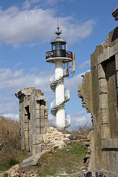 Après la Seconde Guerre mondiale, un feu provisoire a été installé à la pointe d'Alprecht en 1947 sur une structure métallique légère à base carrée ; il a fonctionné jusqu'en 1962. Le bâtiment de service et celui du gardien ont été rebâtis en béton dès 1960, ce qui explique leur position totalement désolidarisée de la tour. Le phare permanent, entièrement métallique, a été érigé en 1961-1962 pour remplacer le feu provisoire et est entré en service en juin 1962. De type original, il privilégie l'efficacité tout en proposant une esthétique fondée sur l'inversion de la typologie traditionnelle : l'escalier, alors qu'il est habituellement enfermé dans une tour cylindrique ou carrée, se situe à l'extérieur et s'enroule autour d'un pilier central. La lanterne conserve néanmoins l'aspect traditionnel hérité du XIXe siècle. L'automatisation a été réalisée en 1977 par l'installation d'une optique à trois panneaux. Le bâtiment est également désigné comme phare du Portel et se trouve sur la commune du Portel, au cap d'Alprech, à proximité du fort d'Alprech. Il fait l'objet d'une inscription au titre des monuments historiques depuis le 30 décembre 2010. Les Archives nationales conservent, sous la côte CP/F/14/17523/1, sept plans du phare d'Alprech élaborés entre 1842 et 1905, dont deux ne sont pas datés. Plusieurs notices et ressources en ligne, notamment la notice IA62001157 de la base Mérimée, documentent le phare.