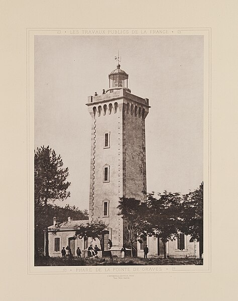 Le phare de la Pointe de Grave, situé sur le côté sud de l’embouchure de la Gironde, signale l’un des points les plus exposés de l’estuaire. En moins de cinquante ans, sept constructions se sont succédé en raison de l’érosion et des contraintes du littoral. Un fanal provisoire sur échafaud est installé en 1823, puis une tour en maçonnerie de 18 mètres munie d’un appareil lenticulaire est élevée, mais l’érosion rapide met ses fondations à nu et contraint à déplacer le feu sur un poteau provisoire. En novembre 1830, une tour démontable en charpente est édifiée pour permettre des reclassements selon l’évolution du trait de côte ; elle sera reculada et remplacée à plusieurs reprises. En 1837 le feu est supprimé et remplacé par un petit fanal fixe sur un échafaud de 12 mètres. Une nouvelle tour en maçonnerie, allumée en 1839, est à son tour détruite par la mer, puis une autre tour en maçonnerie est allumée en janvier 1842 avant d’être de nouveau remplacée par une structure sur échafaudage, déplacée encore en 1848. Le phare actuel est bâti entre 1859 et 1860 et mis en service le 15 août 1860 ; il assure depuis la signalisation de la pointe de Grave. Les chantiers successifs furent marqués par des contestations et des difficultés d’exécution : l’entrepreneur chargé d’un des premiers travaux signala des lacunes dans le cahier des charges et par la suite un adjudicataire obtint finalement des indemnités reconnues par voie d’expertise et confirmées par le Conseil d’État. Le coût des travaux de la construction finale est indiqué à 69 700 francs, l’optique à 31 500 francs. Le phare actuel se présente comme une tour carrée en maçonnerie lisse, peinte en blanc avec chaînes d’angle en pierres apparentes et le sommet peint en noir. La lanterne à vitrage plan en cuivre protège un feu à occultations, avec secteurs blanc, rouge et vert, et une portée de 17 milles en blanc. La tour est flanquée des logements des gardiens et reliée à des bâtiments en retour d’équerre formant un U. On accède à la lanterne par un escalier de 107 marches menant à la plate-forme. Le phare a été électrifié en 1937 et automatisé en 1955. Le musée du phare de Cordouan et des Phares et Balises occupe des locaux jouxtant la tour, et le site est ouvert aux visites principalement en été. Le phare de Grave fait l’objet d’une inscription au titre des monuments historiques depuis le 6 novembre 2009.