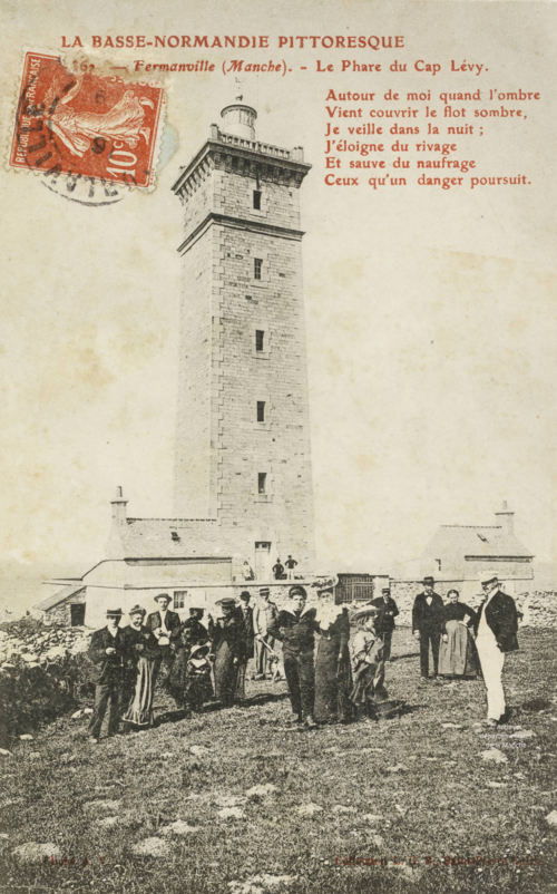 Le phare du Cap Lévi se situe sur la commune de Fermanville, dans la Manche, et marque la pointe qui ferme à l'est la rade de Cherbourg, ainsi que les hauts-fonds de Biéroc où se forment de puissants courants. À la suite de nombreux naufrages, la construction d’un phare fut décidée et le projet de 1850 fut dessiné par l’ingénieur J. de Serry sous la supervision de Charles‑Félix Morice de la Rue; la construction débuta en 1854. Le premier phare, construit en granites rose de Fermanville et gris de Montfarville et achevé par l’entrepreneur Baude après un litige avec Lévesque, fut allumé le 31 décembre 1858 et servit de relais entre les phares de Goury et de Gatteville‑Barfleur. D’origine quadrangulaire, cette tour de 31,70 m (hauteur focale 33 m, hauteur au dessus de la mer 35 m) comportait une tourelle demi‑cylindrique pour l’escalier et une lanterne sous coupole ; son feu initial était un feu fixe blanc à éclats rouges de 4e ordre. En 1901, l’installation d’une cuve à mercure permit d’installer une optique à éclats rouges de portée accrue (30 km par temps clair, 12 km par temps de brume). Après avoir successivement utilisé huile végétale, huile minérale et vapeurs de pétrole, le phare fut électrifié en 1937. Pendant la Seconde Guerre mondiale, la Kriegsmarine utilisa la tour comme poste d’observation, son feu fut démonté en 1941 et, en juin 1944, la tour fut dynamitée par les troupes allemandes en retraite ; un feu provisoire fut installé sur les ruines. Les plans de reconstruction furent confiés aux architectes René Levavasseur et Jean‑Paul et Jacques Chauliat, qui reprirent la base carrée en lui donnant des faces incurvées vers l’intérieur ; la nouvelle tour, maçonnée en granite rose, fut édifiée en 1947 à environ 100 mètres en arrière de l’emplacement primitif et mise à feu en juillet 1948. Cette seconde tour, de section quadrangulaire à faces concaves, comporte un couronnement circulaire vitré abritant la lanterne ; les bâtiments d’habitation et d’exploitation sont séparés de la tour. Sa hauteur est donnée dans les sources à 28 m (hauteur focale 33 m, hauteur au dessus de la mer 36,85 m) et son feu, à éclats rouges de cinq secondes, a été équipé en 1948 d’une optique de 3e ordre et portée portée à 20 milles nautiques ; l’optique a depuis évolué pour une focale de 0,375 m. Le phare a été automatisé en 1975 et l’ouvrage est inscrit au titre des monuments historiques par arrêté du 11 mai 2009.