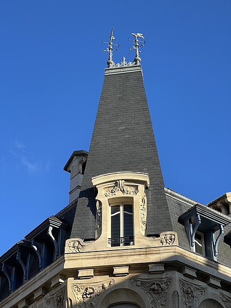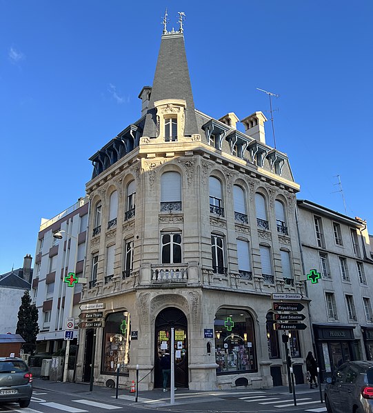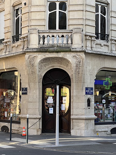 L'immeuble, construit entre 1902 et 1904 pour Victor Jacques qui y installe son officine au rez-de-chaussée, occupe l'angle de la rue de la Commanderie et de la rue Jeanne-d'Arc à Nancy. Il est attribué à l'architecte Lucien Bentz, ancien élève de l'école des Arts et Métiers de Châlons puis ingénieur de l'École Centrale des Arts et Manufactures de Paris. Le gros-oeuvre a été exécuté par l'entreprise nancéienne Dancelme frères. Le décor sculpté est dû à Auguste Vautrin, formé dans l'atelier de Paul Cayotte ; la date et les noms de l'architecte et du sculpteur figurent sur la façade de la rue Jeanne-d'Arc, sous le bandeau couronnant le premier niveau. Les verrières de l'imposte de la porte rue de la Commanderie et de la cage d'escalier ont été réalisées par le peintre verrier Jacques Gruber. L'édifice s'élève sur quatre niveaux, dont un étage de combles, et sa flèche a perdu ses épis de faîtage et sa crête. L'architecture n'est guère marquée par l'Art nouveau en dehors de la décoration d'Auguste Vautrin, qui met en scène des plantes médicinales. Le mobilier de la pharmacie, réalisé par l'ébéniste-sculpteur Justin Feretz (ou Ferez), disciple d'Eugène Vallin, a longtemps été considéré comme détruit avant d'être retrouvé et mis aux enchères en avril 2014. Les façades et toitures sur rues sont inscrites au titre des monuments historiques par arrêté du 15 juin 1977.