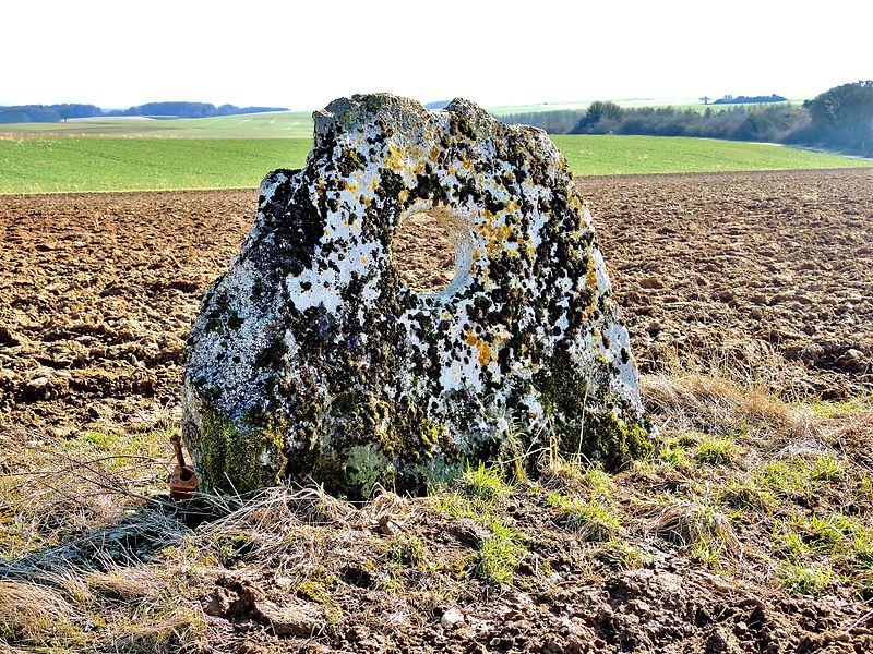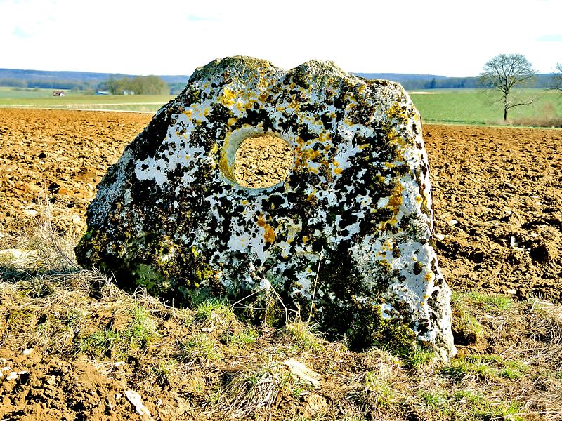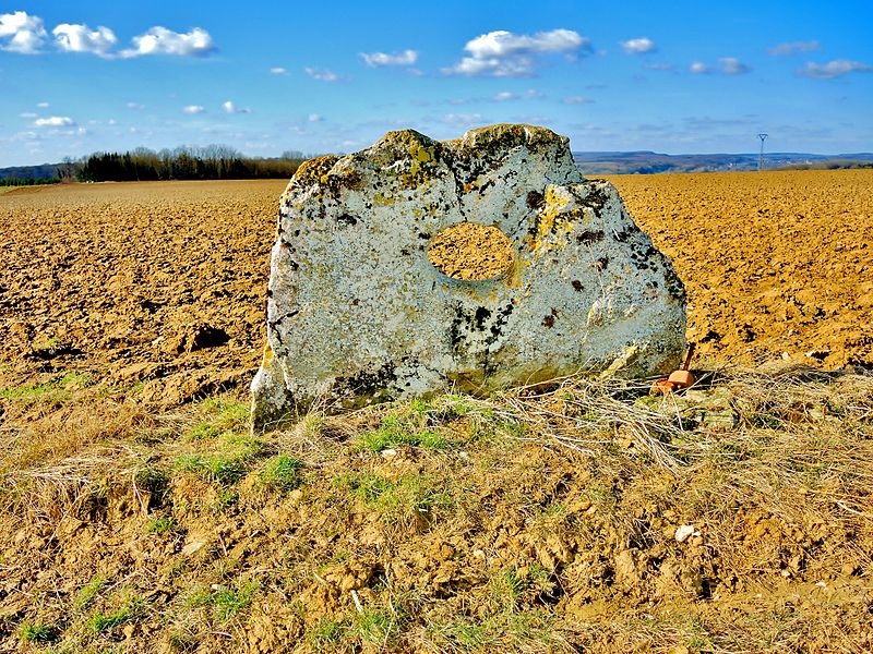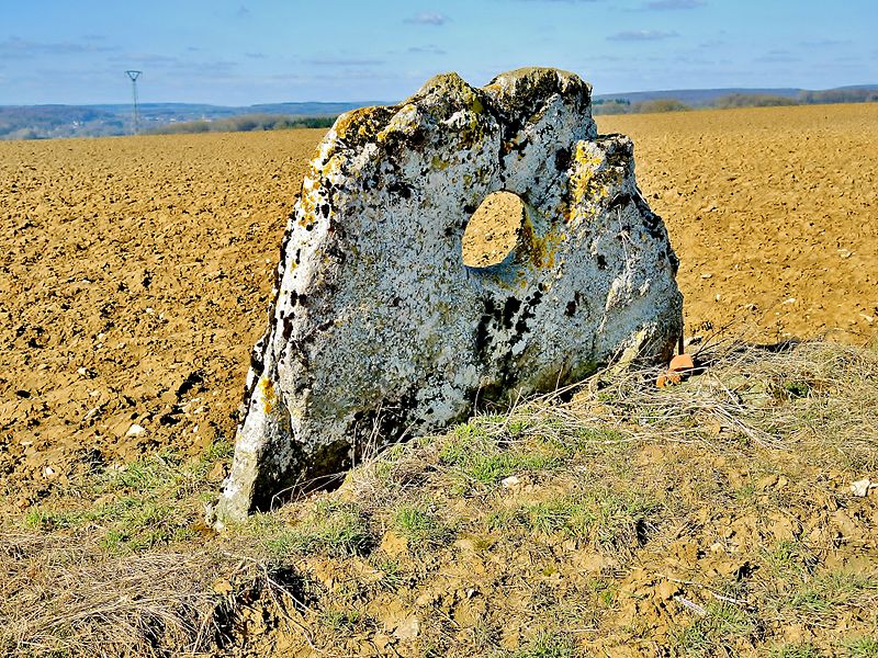 Ce fragment, appelé dalle-hublot, provient d'un dolmen élevé au point culminant d'un plateau dominant la rive gauche de la Saône à 250 m d'altitude.