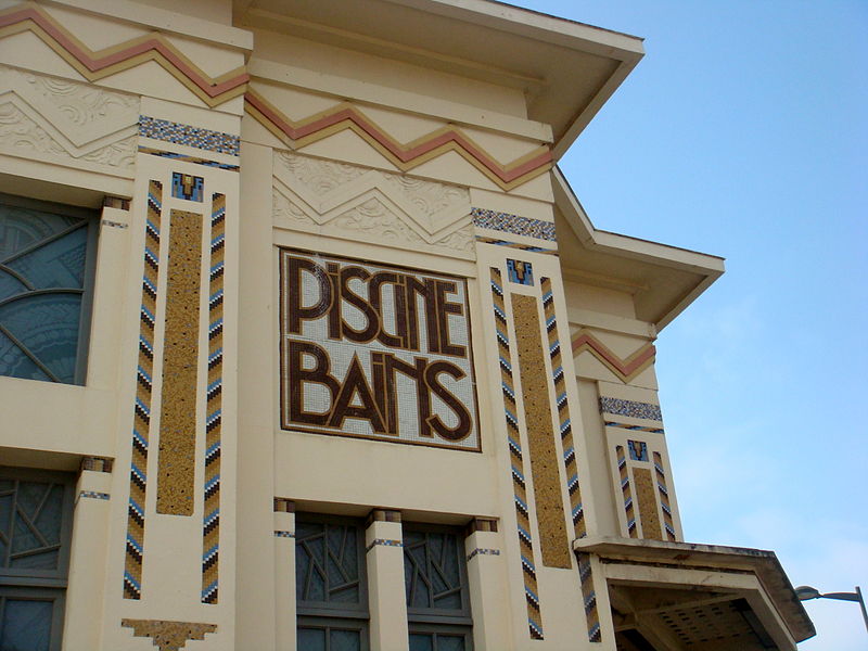 La piscine municipale de Bègles, dite « Les Bains », a été décidée par la municipalité socialiste en 1925 et réalisée entre 1930 et 1932 par l'architecte et ingénieur de la commune Armand Blanchard. Construite en béton armé, elle comprend un bâtiment pour la piscine couverte — la première piscine publique couverte de l'agglomération bordelaise —, un bâtiment pour les bains-douches et un vestibule commun. L'édifice a été inauguré le 4 décembre 1932. La technique du béton armé a permis une large utilisation du verre et de revêtements céramiques, et les murs extérieurs sont ornés de motifs de briques, de mosaïques, de frises en bas-relief et d'une frise à chevrons. La signalisation en lettres stylisées en mosaïque indiquait « PISCINE-BAINS » et « NATATION-DOUCHES », et un motif bordé d'une guirlande stylisée surplombait la porte avec la mention « Ville de Bègles » et l'année « 1932 ». Les céramiques sont l'œuvre de la société Castiaux frères ; les peintures et vitreries ont été réalisées par la maison Bime ; les sculptures par Vignal et les plaques émaillées par Duvigneau. Le hall d'accueil est pavé d'une mosaïque figurant des formes géométriques ondulantes et des lignes brisées ; à l'origine, une grande table octogonale en béton lissé et coloré, entourée de sièges pour la buvette, occupait le centre et a été supprimée vers 1960. La coupole qui couvre la salle, traitée comme un vitrail par l'emploi de pavés de verre multicolores, a suscité des critiques dans la presse d'opposition, notamment L'Union sociale qui écrivait le 15 juillet 1932 : « Au beau milieu de notre territoire, fief trois fois saint de l'Internationale, ils ont planté, sous le fallacieux prétexte de coiffer un temple de l'hygiène, cet immense casque à pointe ». Les pavés colorés de la coupole ont été perdus, mais l'auvent de l'entrée a conservé des éléments de vitrage aux thèmes solaires ou végétaux. Une baie permet d'apercevoir le bassin et une porte vitrée mène aux bains-douches, qui comprennent des cabines de déshabillage, des cabines de bains-douches et des sanitaires ; la lumière pénètre par de larges baies ouvertes. Les bains-douches sont toujours utilisés, tandis que la verrière et le buffet d'eau Art déco ont disparu. La piscine a été inscrite aux Monuments historiques en 1991 en raison de sa valeur architecturale représentative du style Art déco. Fermée en 1996 pour insécurité structurelle et non-conformité aux normes, elle a ensuite fait l'objet d'un projet de réhabilitation proposé par l'architecte Patrick Bouchain, combinant respect de l'existant et équipements neufs. Rouverte en 2006 sous le nom « Les Bains », elle offre un nouveau bassin couvert de 25 mètres en inox, baigné par la lumière naturelle d'une toiture en shed et de façades vitrées. Une mosaïque au fond du pédiluve reproduit une anamorphose de l'artiste contemporain allemand Marin Kasimir. L'eau est déchlorée avant évacuation par un dispositif expérimental de phytoremédiation et chauffée grâce à des panneaux solaires et à une récupération de calories. L'ancien bassin a été transformé par une structure en bois en forme de vagues, devenue aire de jeu, et des équipements complémentaires ont été ajoutés : espace de détente (sauna, hammam, soins du corps), patio et jardin. L'ancien hall d'entrée en angle du bâtiment est devenu un espace de restauration biologique et l'accès pour les personnes handicapées a été aménagé par une ouverture dans la façade nord.