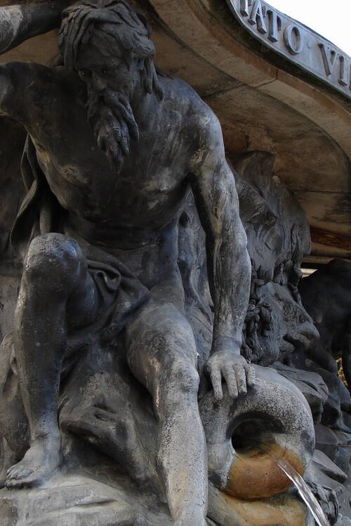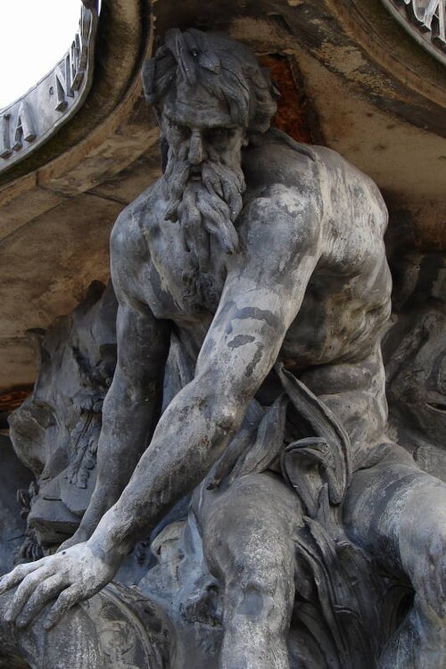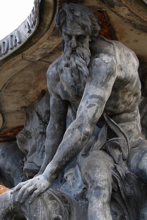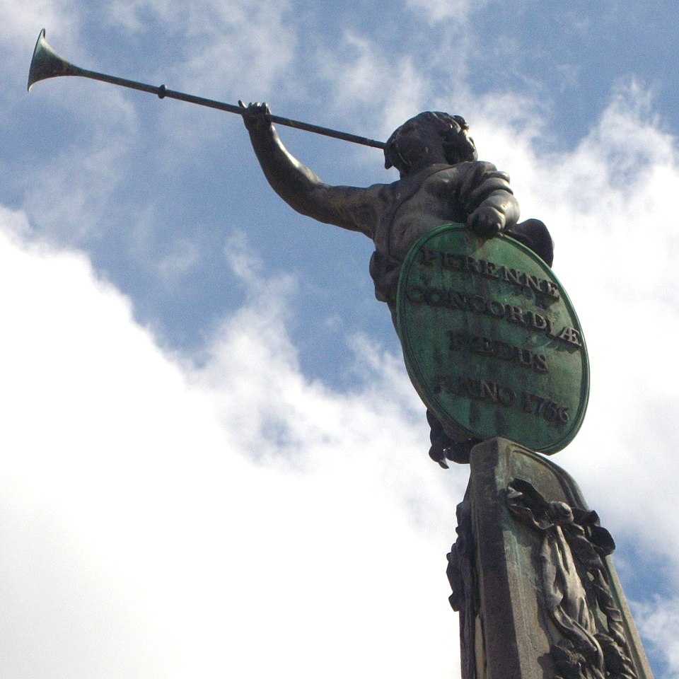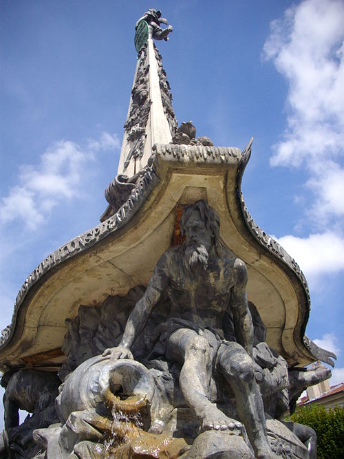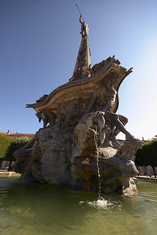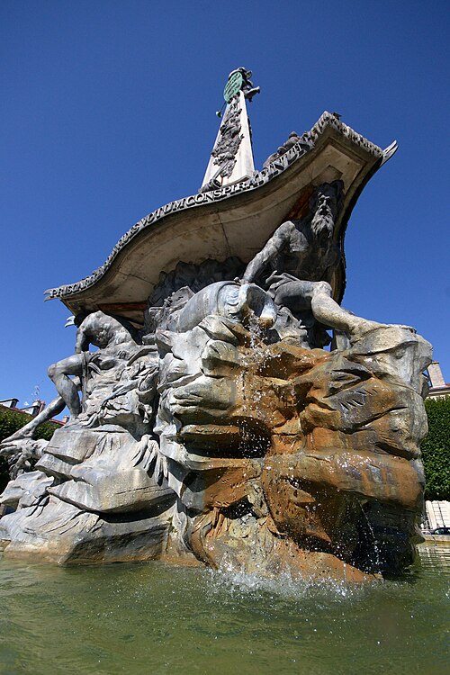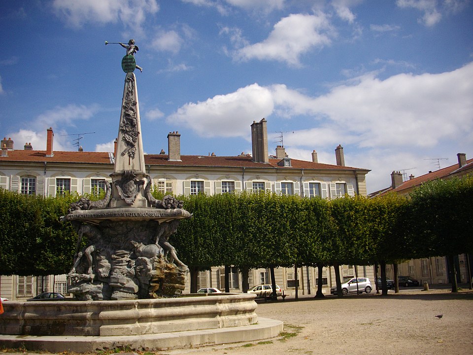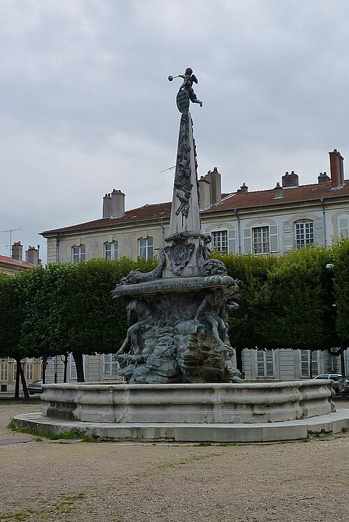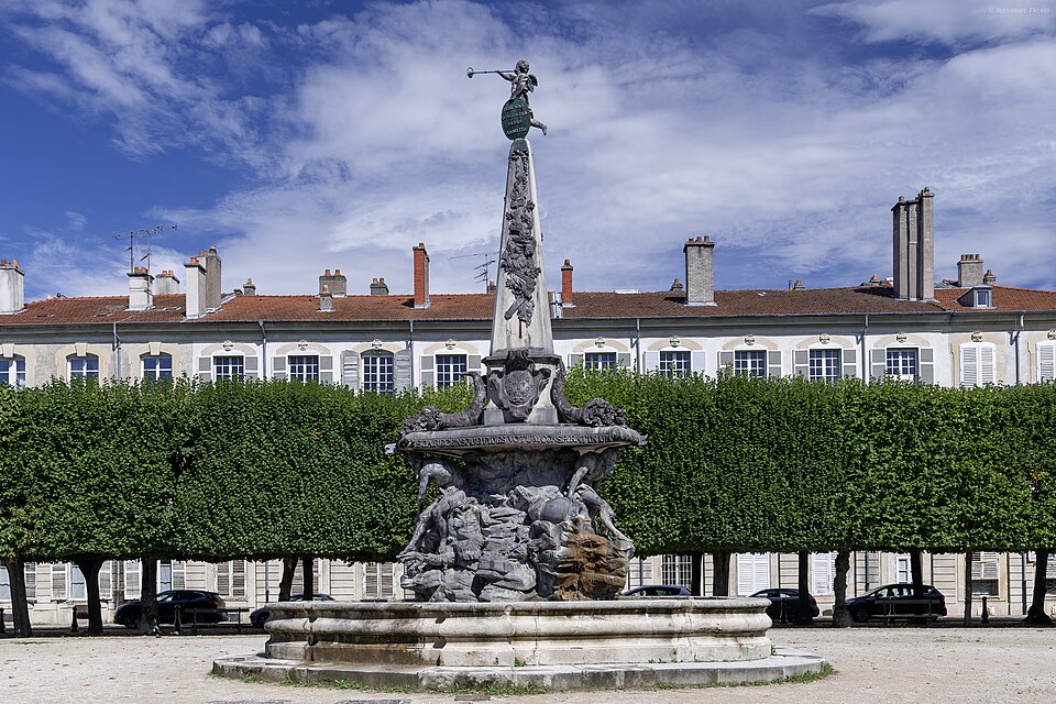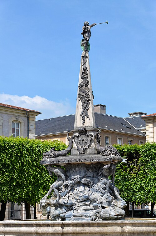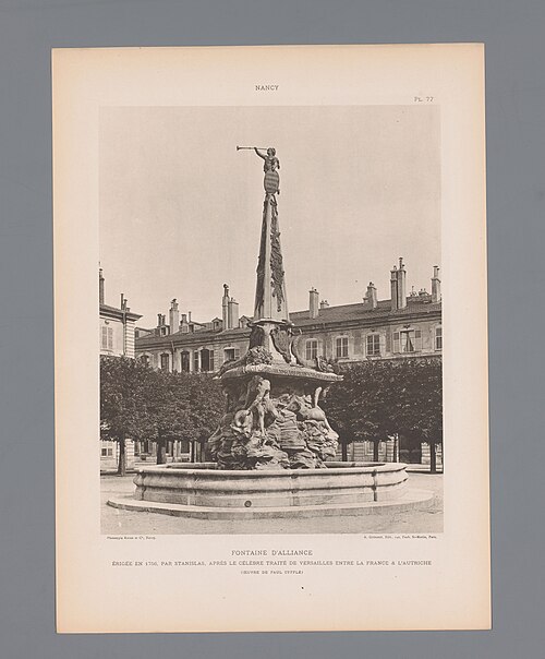 La fontaine, conçue par le sculpteur Paul‑Louis Cyfflé pour commémorer le traité, devait à l'origine être installée place de la Carrière. Son bassin, à plusieurs lobes, reçoit l'eau que versent trois vieillards barbus représentant l'Escaut, la Meuse et le Rhin ; la partie basse en plomb expose des figures allégoriques déversant l'eau dans un bassin de pierre, tandis qu'un obélisque de pierre domine l'ensemble, surmonté d'un génie soufflant dans un clairon et tenant un médaillon. Il est indiqué que Cyfflé se serait fortement inspiré de la fontaine des Quatre Fleuves de Bernini à Rome. La fontaine porte plusieurs devises latines célébrant l'alliance : sur le médaillon sommital « Perennæ Concordiæ Fœdus Anno 1756 », deux mains unies décorées des écus de France et d'Autriche accompagnées de « Publicam spondent salutem », deux mains brandissant un faisceau de flèches avec « Optato vincta discordia nexu », et un écu réunissant fleurs de lys et croix de Lorraine portant « Prisca recensque fides votum conspirat in unum ».