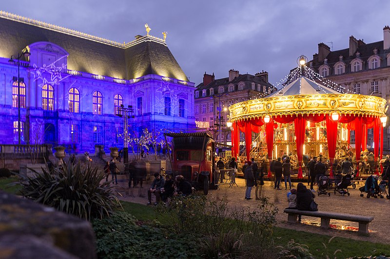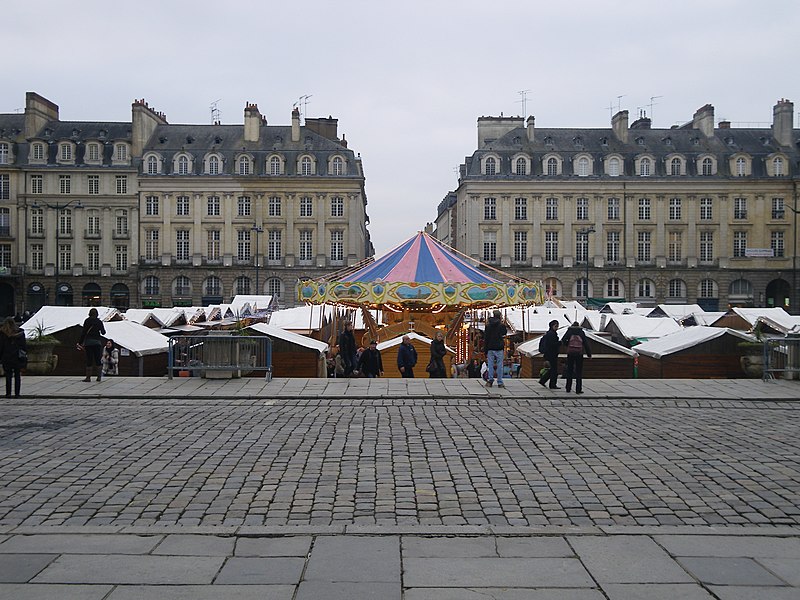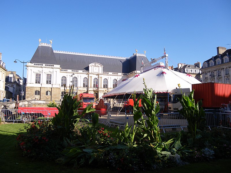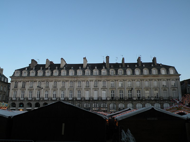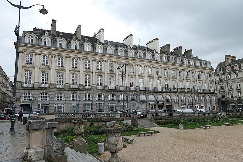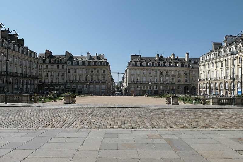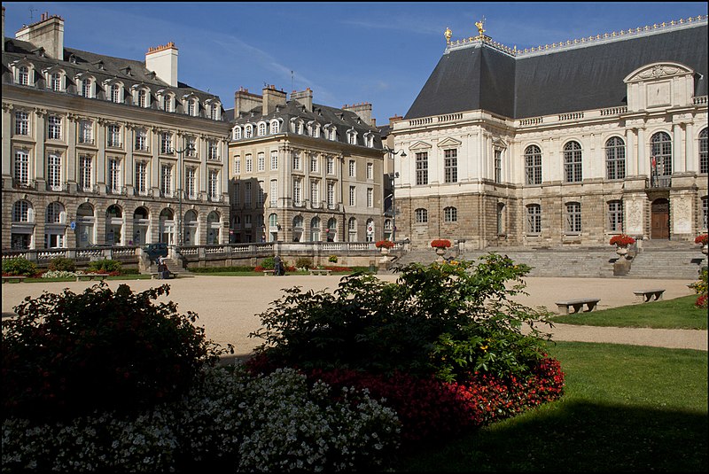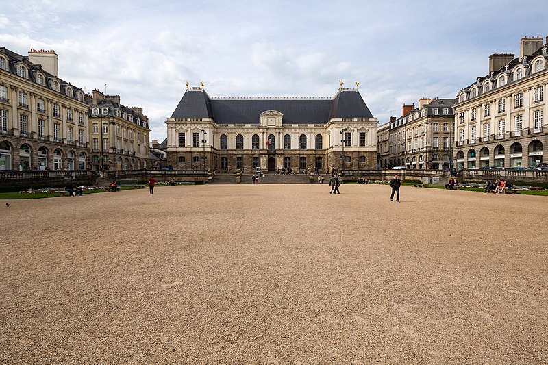 La place du Parlement-de-Bretagne, située dans le centre-ville de Rennes à proximité de la place de la Mairie et au sud de la place Hoche, a été créée lors de la reconstruction de la ville après un incendie qui en ravagea une partie. Le palais du Parlement de Bretagne, attribué à Salomon de Brosse, échappa au sinistre et devint l’élément central d’un vaste projet urbanistique visant à composer les trois autres côtés de la place et à encadrer une statue équestre de Louis XIV. Les plans initiaux furent dressés par l’ingénieur Robelin puis modifiés en 1725 par Jacques Gabriel, premier architecte du Roi ; une gravure attribuée à Huguet laisse supposer que l’ordonnance actuelle diffère de la conception primitive. Les façades qui bordent la place présentent un soubassement de rez-de-chaussée et d’entresol sous arcades, un ordre colossal à pilastres ioniques soulignant les deux étages principaux, et un comble à la Mansart percé de lucarnes en pierre. Le style employé — rez-de-chaussée en granite et étages en tuffeau — est appliqué au palais comme aux immeubles périphériques, dont l’ensemble des façades est protégé au titre des monuments historiques ; l’hôtel de Mucé, au 4 de la place, reste la seule réalisation conservant les plans de Robelin et se distingue donc des constructions de Gabriel. Une statue équestre de Louis XIV, œuvre de Coysevox, fut installée au centre de la place en 1730 puis fondue pendant la Révolution ; elle fut remplacée successivement par un arbre de la liberté puis par un bassin qui subsista jusqu’en 1935, époque à laquelle furent aménagées les balustrades et le jardin. Le nom de la place a évolué : elle s’appelait Place Louis-le-Grand de sa construction jusqu’à la Révolution, fut rebaptisée Place de l’Égalité en 1792, porta plus tard les appellations Place Neuve puis Place Louis le Grand et, jusque dans les années 1970, la place et le bâtiment furent souvent désignés comme place du Palais de Justice et Palais de Justice. Une plaque bilingue en français et en breton porte l’odonyme plasenn Breujoù Breizh, avec quelques variantes locales de toponymie en breton. La place est desservie par la ligne A du métro (station République) et par la ligne B (station Saint‑Germain). Des traces de l’ancienne ligne 3 du tramway, qui traversait la place jusqu’en 1938, sont encore visibles au pied du palais, et le sol de la place est classé au titre des monuments historiques depuis l’arrêté du 29 octobre 1942. Lieu de mémoire et de rassemblement, la place accueille de nombreuses manifestations et animations culturelles, notamment lors des Tombées de la nuit, du festival Mythos et du marché de Noël.