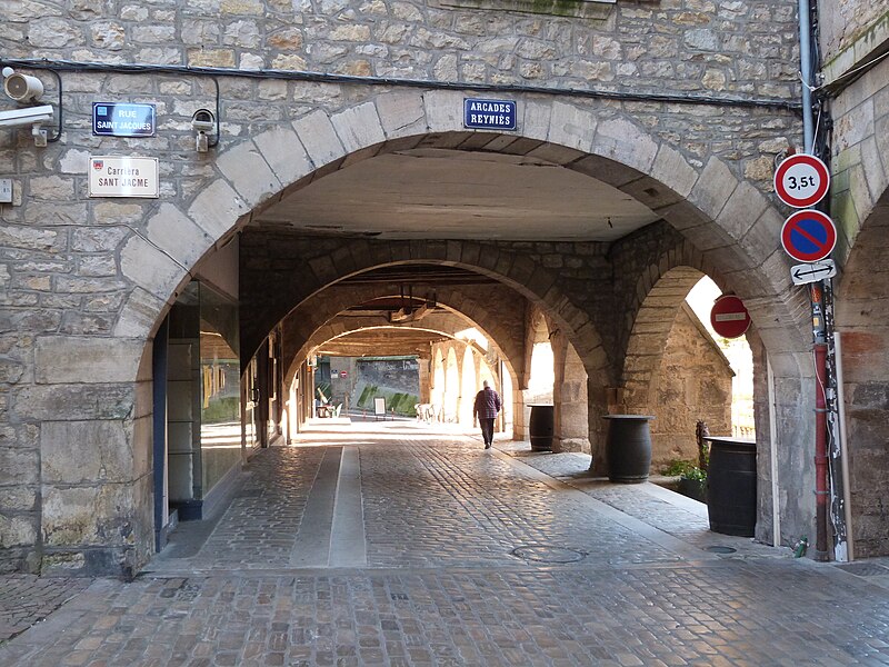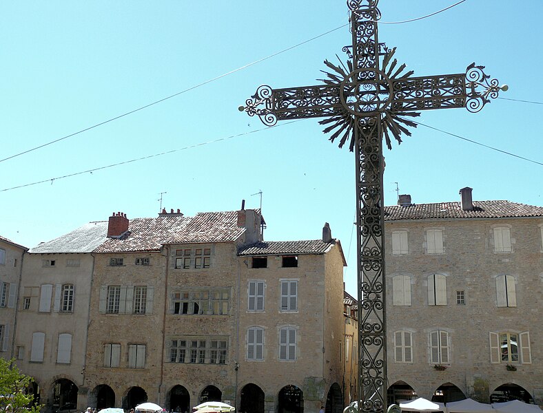 La bastide, créée par Alphonse de Poitiers en 1256 en bordure de l'Aveyron, devient le siège d'un archiprêtré en 1302. En 1463, la sénéchaussée du Rouergue obtient le droit de frapper monnaie royale. Cité de riches marchands, la bastide se singularise par une église dont le porche empiète largement sur le sol de la place, situation rare pour une bastide. La place, de plan losangé, est bordée d'arcades qui se rejoignent aux angles en un étroit passage. Elle est complétée par une croix en fonte, dominée par la balustrade des couverts de Reyniès. À l'origine, le relief de la place différait sensiblement de son profil actuel : une déclivité importante descendait du nord au sud et d'ouest en est, et le seuil d'entrée de la collégiale se trouvait environ 80 cm plus haut. Pour des raisons de confort et d'embellissement, les consuls portent un projet de nivellement. En 1744, le conseil de ville décide la suppression de la halle et des poids publics édifiés sur la place, malgré l'opposition du juge mage Darribat de Salvagnac, et prévoit une rénovation du pavage. Les travaux de nivellement et de construction de la terrasse sont approuvés en décembre 1747, puis l'assemblée de ville adopte le plan en mai 1748 en prévoyant le réemploi des matériaux des anciens remparts, notamment les pierres des tours et portes dites du Guiraudet et de Savignac. L'ancienne halle ne sera pas reconstruite et les poids publics seront abrités sous le couvert haut. Un élément de pierre placé au sommet de l'escalier porte une inscription rappelant l'achèvement des travaux en 1752 (IM120003944). Cette inscription reste en place mais est partiellement masquée depuis l'installation de la grande croix en fer forgé en 1844 (IM12003940). Lors d'une restauration de la place Notre-Dame et de ses abords, le dallage de la terrasse a été remplacé et un motif en galet figurant les armoiries de la ville a été posé, tandis que plusieurs balustres très endommagées ont été remplacées. Des travaux de pavage ont été réalisés en 2013. Les toilettes publiques aménagées au début du XXe siècle sous la terrasse, côté ouest, ont été condamnées à l'occasion de ces travaux.