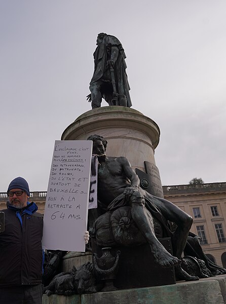Lors de la Révolution la statue royale fut abattue en août 1792 et divers dispositifs commémoratifs et transformations successives occupèrent le piédestal : une pyramide portant les noms des citoyens tombés à Valmy, puis un trophée, enfin d’autres monuments provisoires jusqu’à la pose de la première pierre du monument actuel en 1818, réalisée avec des marbres italiens initialement destinés à un autre ouvrage, et son inauguration solennelle en 1819. Au XIXe siècle et au début du XXe, la place a connu des débats récurrents sur le maintien ou le remplacement de la statue et a servi de lieu de marché aux fleurs ; le monument fut longtemps entouré d’une grille, enlevée vers 1910, ce qui facilita l’usage des marches par des sans‑abri appelés localement « les Louis XV ».