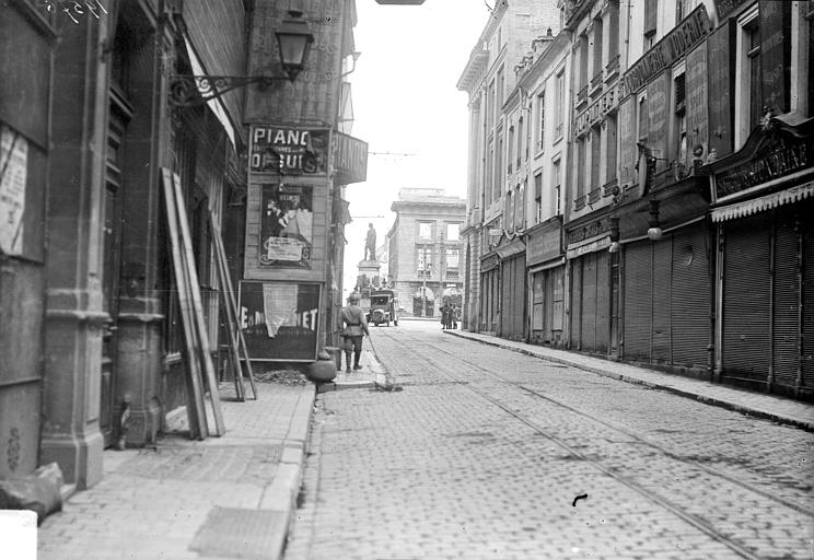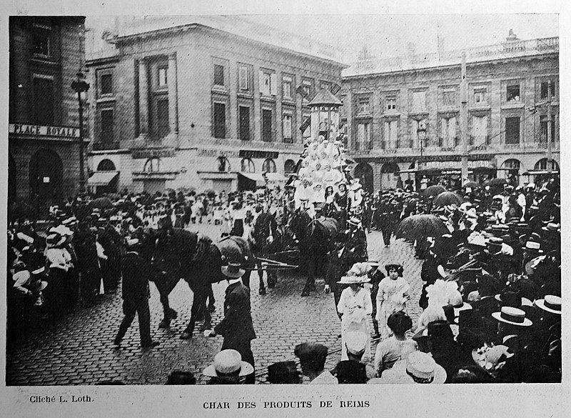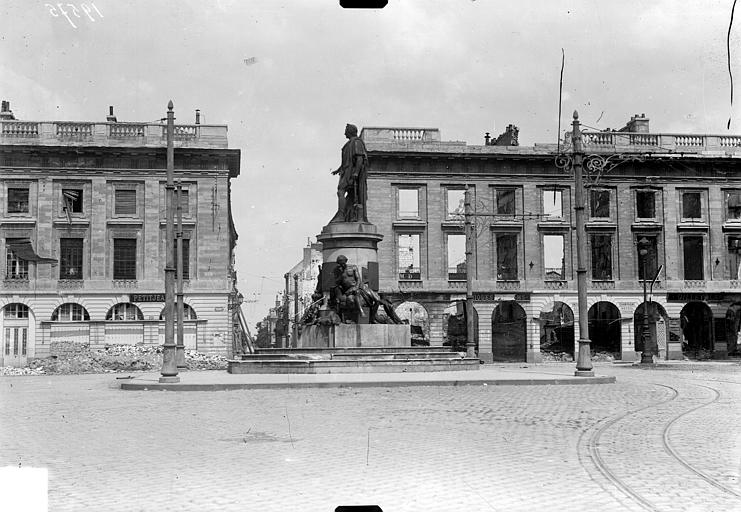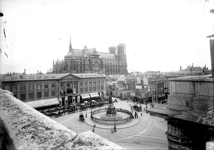 Les destructions de la Première Guerre mondiale ont affecté les hôtels bordant la place : seules les façades conservent majoritairement leur disposition d’origine, tandis que des surélévations ont altéré l’harmonie des étages supérieurs. L’unification architecturale de la place s’est achevée en 1910 avec la construction de l’immeuble d’angle sud‑ouest par la Société Générale. L’ensemble de la place, monument et sol compris, est inscrit au titre des monuments historiques depuis le 28 mars 1952 ; l’ancien hôtel des Fermes, qui abrite l’une des sous‑préfectures de la Marne et dont la partie gauche fut occupée par le magasin Dewachter frères à partir de 1884, fait l’objet d’une inscription distincte depuis le 19 août 1953.