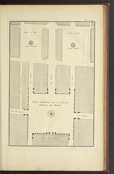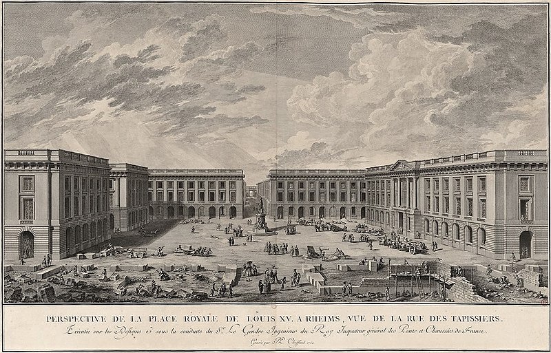 La Place Royale se situe au cœur de Reims et mesure, selon les anciennes mesures, 33 toises sur 38. Elle occupe une partie de l’emprise du forum romain de Durocortorum et reprend les grands axes du cardo et du decumanus, ultérieurement partiellement comblés par des constructions appartenant en grande partie au chapitre de Notre‑Dame, dit Grand Credo, et à la paroisse Saint‑Michel. Au centre de la place s’élevait un monument dédié à Louis XV, œuvre de Jean‑Baptiste Pigalle ; la statue sommitale fut renversée à la Révolution et le bronze destiné à être fondu en canons, tandis que les sculptures du piédestal de Pigalle furent conservées. La statue actuelle, représentant le roi en empereur romain par Pierre Cartellier, a été élevée après ces événements et s’inscrit sur le même piédestal contenant les allégories de Pigalle. La place tient son nom de la présence de cette statue de Louis XV.