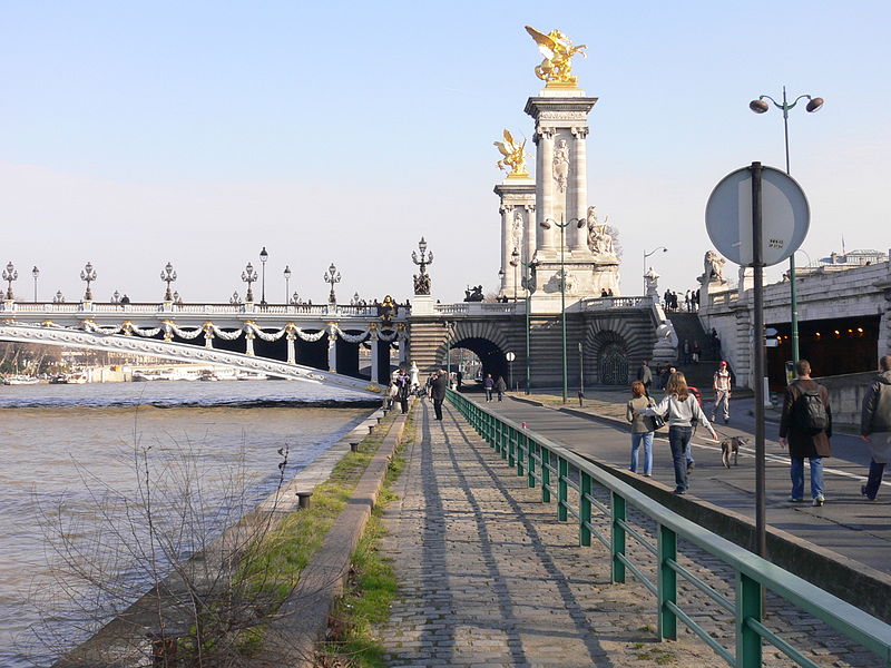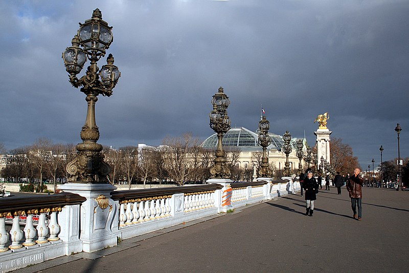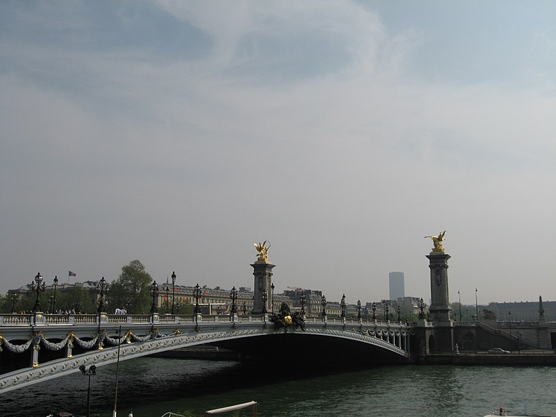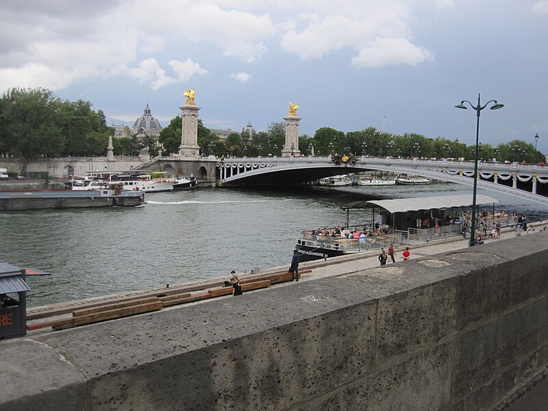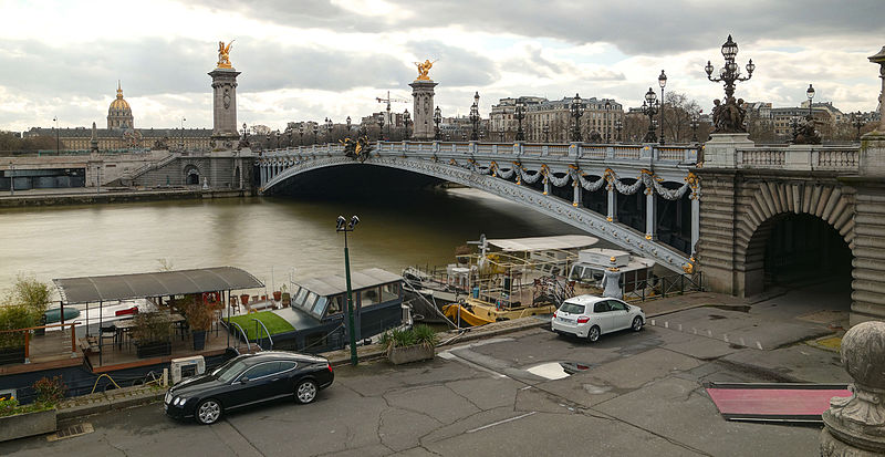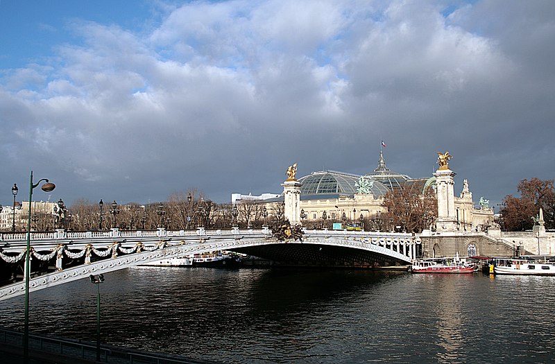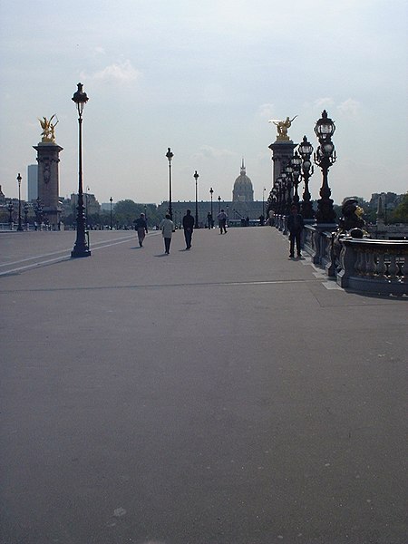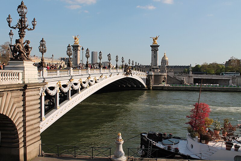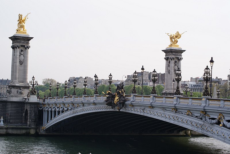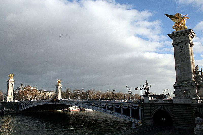 Le pont Alexandre‑III enjambe la Seine entre le 7e et le 8e arrondissement de Paris, reliant l'esplanade des Invalides à l'avenue Winston‑Churchill, à proximité du Petit Palais et du Grand Palais ; il se situe entre le pont de la Concorde et le pont des Invalides et est desservi par la station Invalides (métro lignes 8 et 13) et la gare RER C des Invalides. Il porte le nom du tsar Alexandre III et a été réalisé pour symboliser l'amitié franco‑russe à l'occasion de l'Exposition universelle de 1900 ; la première pierre fut posée le 7 octobre 1896 par le tsar Nicolas II, l'impératrice Alexandra Fedorovna et le président Félix Faure, et l'ouvrage fut inauguré le 14 avril 1900. Les ingénieurs Jean Résal, Amédée Alby et Joseph Grison assurèrent la structure tandis que les architectes Joseph Cassien‑Bernard et Gaston Cousin prirent en charge la décoration. Destiné à prolonger l'axe des Invalides vers les palais de l'Exposition, le pont répondait à des exigences de faible profil pour préserver la vue sur les Invalides, de circulation fluviale non entravée et d'une largeur adaptée à l'avenue prolongée ; le tablier mesure aujourd'hui 45 mètres de large. L'ouvrage est une arche métallique unique de 107 mètres de portée avec trois articulations, reposant sur d'imposantes culées massives qui contiennent des tunnels en pierre pour la circulation de la berge ; la charpente est en acier moulé et associe éléments d'acier et voussoirs de fonte moulée. Les fondations furent réalisées sous caissons pressurisés selon le procédé Triger ; la mise en œuvre donna lieu à vingt‑neuf accidents de décompression plus ou moins graves et à un décès parmi les ouvriers. Le pont, long de 160 mètres pour la totalité de l'ouvrage, est classé monument historique depuis le 29 avril 1975, labellisé « Patrimoine du XXe siècle » et situé dans le périmètre du secteur sauvegardé du 7e arrondissement ainsi que dans le site inscrit « Ensemble urbain à Paris ». Sa décoration, riche et étudiée en regard du rôle urbain de l'ouvrage, repose notamment sur quatre pylônes surmontés de groupes équestres en bronze doré et sur trente‑deux candélabres en bronze réalisés par l'établissement Lacarrière ; ces éléments et de nombreux autres reliefs et statues ont été exécutés par des sculpteurs tels qu'Emmanuel Frémiet, Georges Récipon, Jules‑Félix Coutan, Léopold Morice, Pierre Granet, Jules Dalou, Georges Gardet et Henri Désiré Gauquié, qui signent entre autres les Renommées, les Nymphes de la Neva et de la Seine, les Amours soutenant les lampadaires et les groupes de lions. Les décorations à la base des pylônes évoquent différentes périodes de l'histoire de France et les masques, guirlandes et motifs du tablier accompagnent le rythme des potelets de liaison. Le pont a connu plusieurs changements de couleur avant une restauration unique en 1998 qui lui a rendu son aspect d'origine. Les culées ont aussi accueilli des activités culturelles et nocturnes : la culée rive droite abrita entre 2006 et 2017 la boîte de nuit Showcase puis, en 2017, fut confiée à plusieurs associations qui y ouvrirent Le Génie d'Alex, un centre culturel éphémère ; la culée rive gauche fut occupée de 1999 à 2012 par un squat artistique animé par l'association Les Gardiens du pont, dont l'exploitation fut remise ensuite à un investisseur. Le pont Alexandre‑III apparaît dans de nombreux films, de productions françaises et internationales, et a servi de décor à des scènes emblématiques ; il a également été le lieu de tournage de clips musicaux, notamment celui d'Adele pour Someone like you (2011) et des prises de vues pour Mariah Carey (Say Something, 2006). Enfin, lors des Jeux olympiques de Paris 2024, le pont a constitué le point de départ et d'arrivée des épreuves de triathlon.