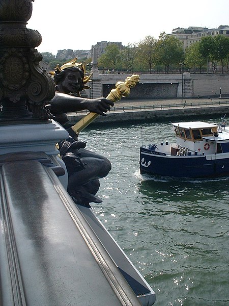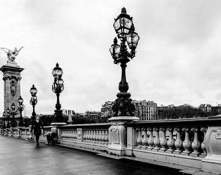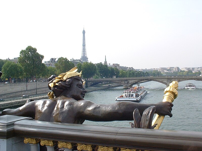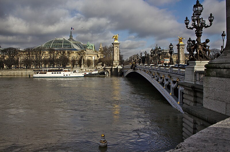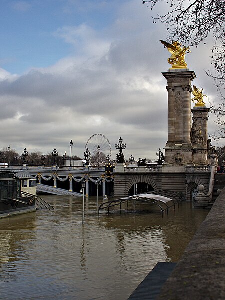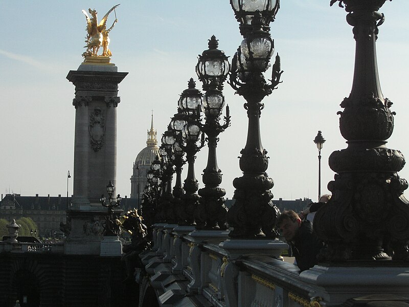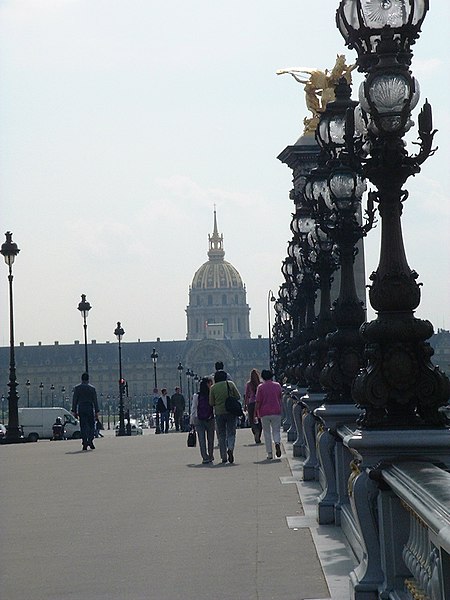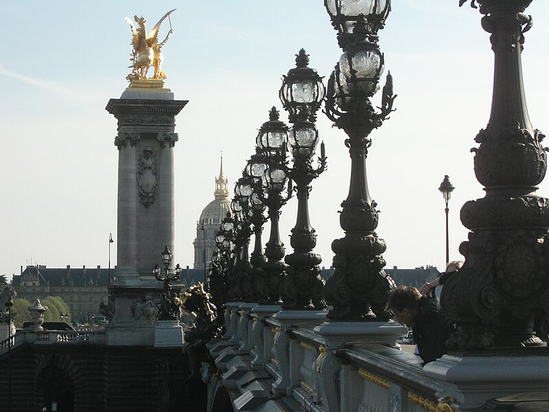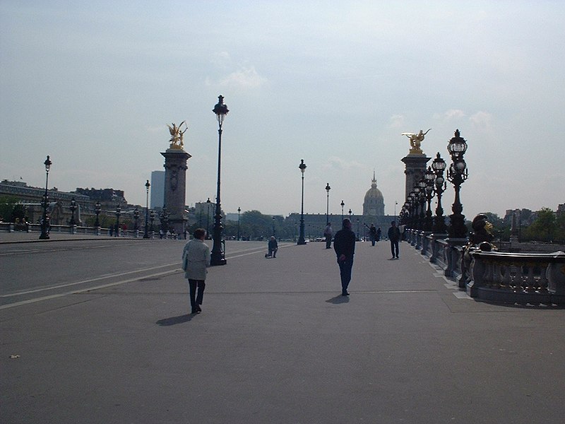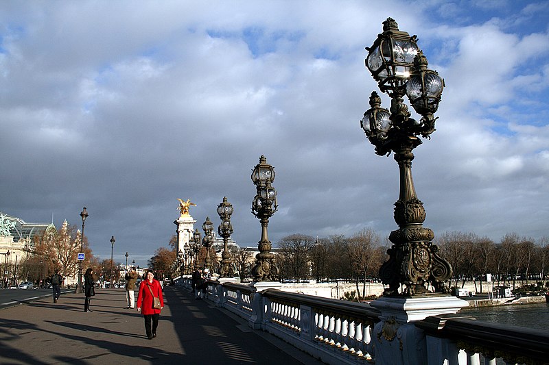 Le pont Alexandre‑III enjambe la Seine entre le 7e et le 8e arrondissement de Paris, reliant l'esplanade des Invalides à l'avenue Winston‑Churchill, à proximité du Petit Palais et du Grand Palais ; il se situe entre le pont de la Concorde et le pont des Invalides et est desservi par la station Invalides (métro lignes 8 et 13) et la gare RER C des Invalides. Il porte le nom du tsar Alexandre III et a été réalisé pour symboliser l'amitié franco‑russe à l'occasion de l'Exposition universelle de 1900 ; la première pierre fut posée le 7 octobre 1896 par le tsar Nicolas II, l'impératrice Alexandra Fedorovna et le président Félix Faure, et l'ouvrage fut inauguré le 14 avril 1900. Les ingénieurs Jean Résal, Amédée Alby et Joseph Grison assurèrent la structure tandis que les architectes Joseph Cassien‑Bernard et Gaston Cousin prirent en charge la décoration. Destiné à prolonger l'axe des Invalides vers les palais de l'Exposition, le pont répondait à des exigences de faible profil pour préserver la vue sur les Invalides, de circulation fluviale non entravée et d'une largeur adaptée à l'avenue prolongée ; le tablier mesure aujourd'hui 45 mètres de large. L'ouvrage est une arche métallique unique de 107 mètres de portée avec trois articulations, reposant sur d'imposantes culées massives qui contiennent des tunnels en pierre pour la circulation de la berge ; la charpente est en acier moulé et associe éléments d'acier et voussoirs de fonte moulée. Les fondations furent réalisées sous caissons pressurisés selon le procédé Triger ; la mise en œuvre donna lieu à vingt‑neuf accidents de décompression plus ou moins graves et à un décès parmi les ouvriers. Le pont, long de 160 mètres pour la totalité de l'ouvrage, est classé monument historique depuis le 29 avril 1975, labellisé « Patrimoine du XXe siècle » et situé dans le périmètre du secteur sauvegardé du 7e arrondissement ainsi que dans le site inscrit « Ensemble urbain à Paris ». Sa décoration, riche et étudiée en regard du rôle urbain de l'ouvrage, repose notamment sur quatre pylônes surmontés de groupes équestres en bronze doré et sur trente‑deux candélabres en bronze réalisés par l'établissement Lacarrière ; ces éléments et de nombreux autres reliefs et statues ont été exécutés par des sculpteurs tels qu'Emmanuel Frémiet, Georges Récipon, Jules‑Félix Coutan, Léopold Morice, Pierre Granet, Jules Dalou, Georges Gardet et Henri Désiré Gauquié, qui signent entre autres les Renommées, les Nymphes de la Neva et de la Seine, les Amours soutenant les lampadaires et les groupes de lions. Les décorations à la base des pylônes évoquent différentes périodes de l'histoire de France et les masques, guirlandes et motifs du tablier accompagnent le rythme des potelets de liaison. Le pont a connu plusieurs changements de couleur avant une restauration unique en 1998 qui lui a rendu son aspect d'origine. Les culées ont aussi accueilli des activités culturelles et nocturnes : la culée rive droite abrita entre 2006 et 2017 la boîte de nuit Showcase puis, en 2017, fut confiée à plusieurs associations qui y ouvrirent Le Génie d'Alex, un centre culturel éphémère ; la culée rive gauche fut occupée de 1999 à 2012 par un squat artistique animé par l'association Les Gardiens du pont, dont l'exploitation fut remise ensuite à un investisseur. Le pont Alexandre‑III apparaît dans de nombreux films, de productions françaises et internationales, et a servi de décor à des scènes emblématiques ; il a également été le lieu de tournage de clips musicaux, notamment celui d'Adele pour Someone like you (2011) et des prises de vues pour Mariah Carey (Say Something, 2006). Enfin, lors des Jeux olympiques de Paris 2024, le pont a constitué le point de départ et d'arrivée des épreuves de triathlon.
