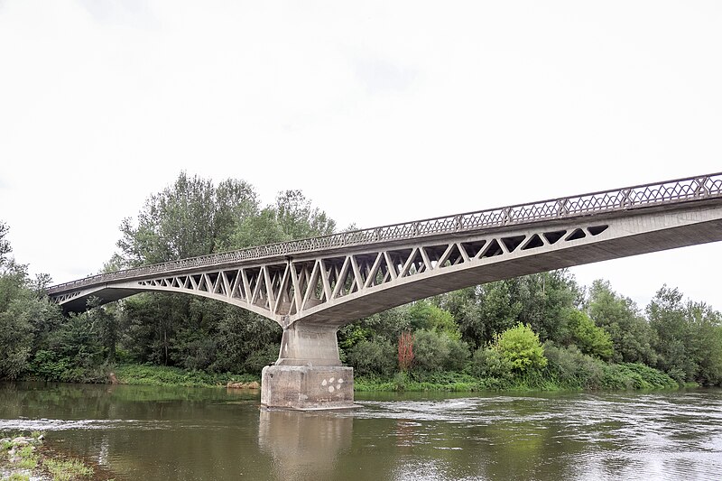 Un premier ouvrage construit à cet emplacement à partir de 1854 remplaça le bac, mais il fut emporté par une crue en 1856 et reconstruit en 1857 ; ce pont suspendu à tablier en planches a servi jusqu'à l'intervention de Freyssinet. Après avoir vu la maquette du projet, Mercier proposa au département de remplacer trois ponts suspendus par des ouvrages en béton armé selon la conception de Freyssinet, le marché étant conclu avec ce dernier pour en assurer le contrôle.