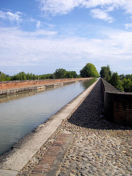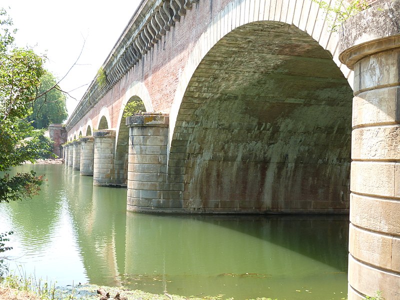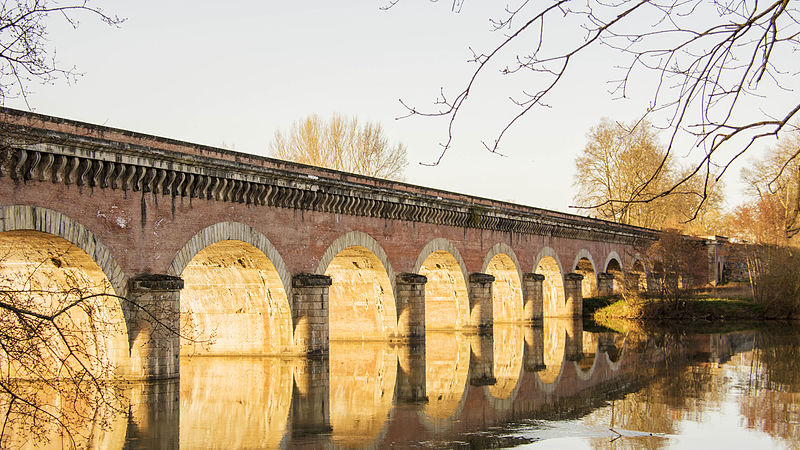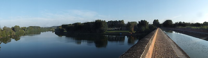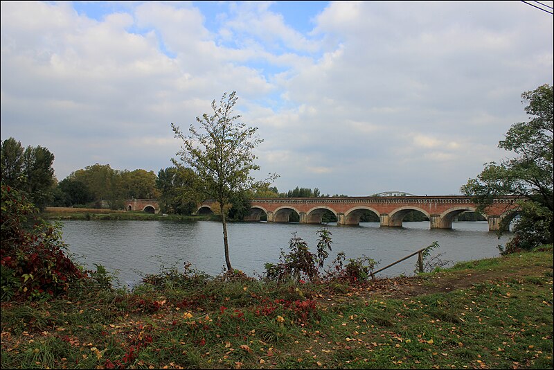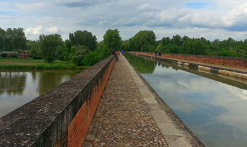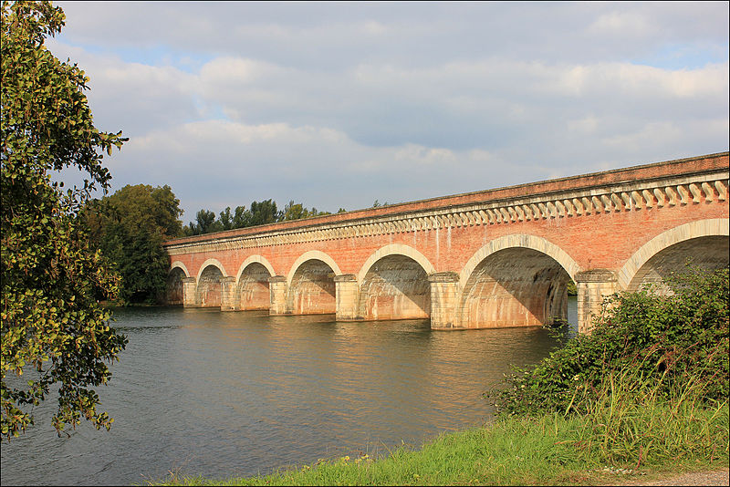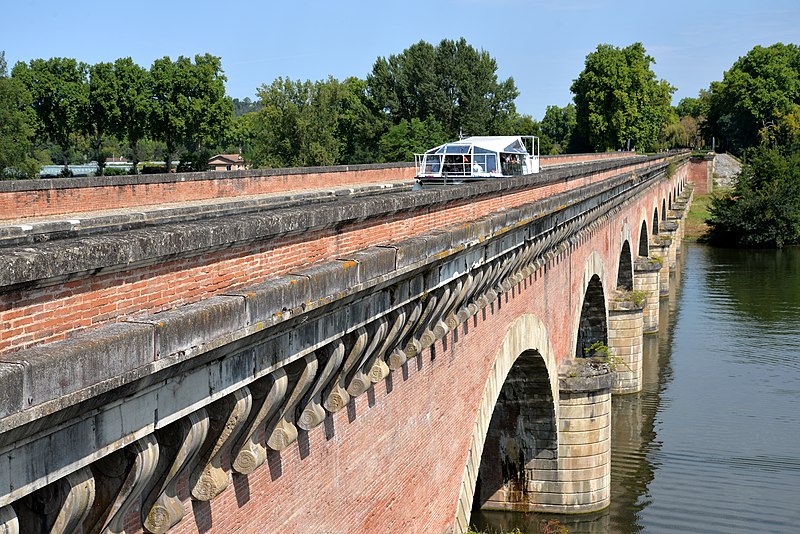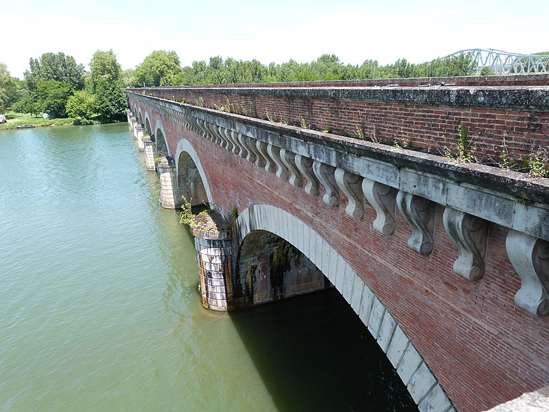 Le pont‑canal du Cacor, situé à Moissac (Tarn‑et‑Garonne, Occitanie), permet la navigation du canal latéral à la Garonne au‑dessus du Tarn. La construction du canal a débuté en 1841 ; le pont‑canal a été édifié au début des années 1840 par l'ingénieur François Terrié, sur le modèle du pont Napoléon, et les travaux ont été exécutés par l'entrepreneur Pierre Causseran. La construction est mentionnée en 1842 et son achèvement est daté des dernières années de la Monarchie de Juillet (1844‑1845). La portion du canal correspondant a été ouverte à la navigation en 1847. L'ouvrage, réalisé en briques de Toulouse et en pierre du Quercy, présente une longueur totale de 356 m, une largeur de 8,35 m et repose sur 14 piles. La maîtrise d'ouvrage est attribuée à Jean‑Baptiste de Baudre, ingénieur des Ponts et Chaussées. À moins de 200 m en amont se trouve le viaduc ferroviaire du Cacor, réalisé en 1857 par la Compagnie des chemins de fer du Midi et du Canal latéral à la Garonne ; entre 1930 et 1932, les trains ont temporairement emprunté l'accotement du pont‑canal pendant le remplacement du viaduc détruit par une crue exceptionnelle du Tarn. Des photographies documentent l'ouvrage près de Moissac, la perspective depuis l'écluse du Cacor, le canal au niveau du pont‑canal et les travaux du chemin de fer temporaire en 1930.