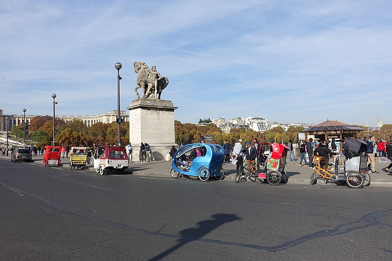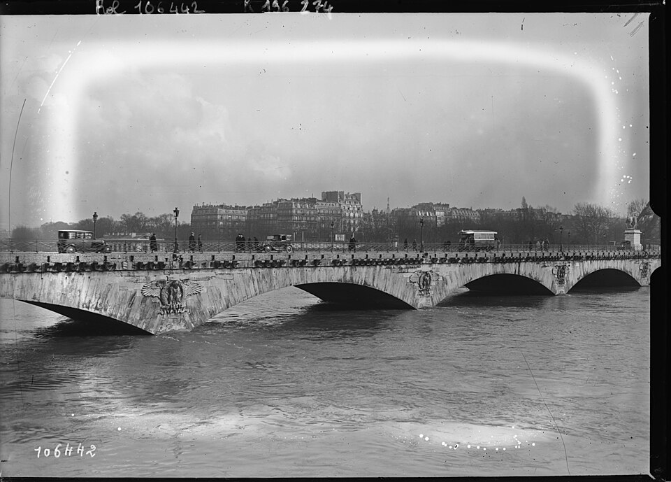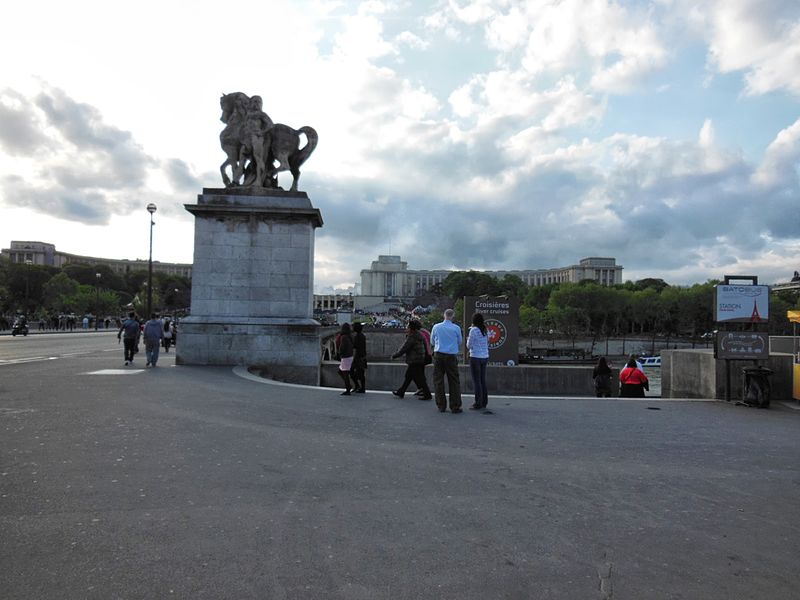 En 1853, quatre sculptures furent installées aux extrémités du pont : sur la rive gauche le Cavalier gaulois d'Auguste Préault et le Cavalier romain de Louis-Joseph Daumas, et sur la rive droite le Cavalier arabe de Jean-Jacques Feuchère et le Cavalier grec de François Théodore Devaulx. Le pont fut couvert lors de l'Exposition universelle de 1889.