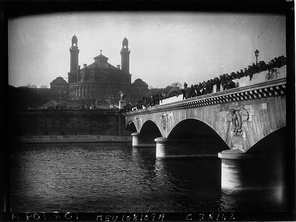 Pour l'Exposition universelle de 1900, le pont fut réservé à l'usage de l'exposition et élargi à 24 mètres par l'adjonction de passerelles métalliques reposant sur les piles originales, œuvres de Jean Résal et Lion pour le dessin et réalisées par Daydé & Pillé ; ces passerelles ne supportaient cependant que des trottoirs élargis et furent progressivement supprimées vers 1920. En 1935, en prévision de l'Exposition universelle de 1937, le pont fut de nouveau élargi, de 14 à environ 35 mètres, par l'adjonction d'éléments en béton et le renforcement des piles existantes.