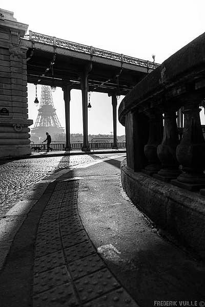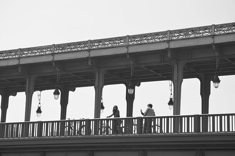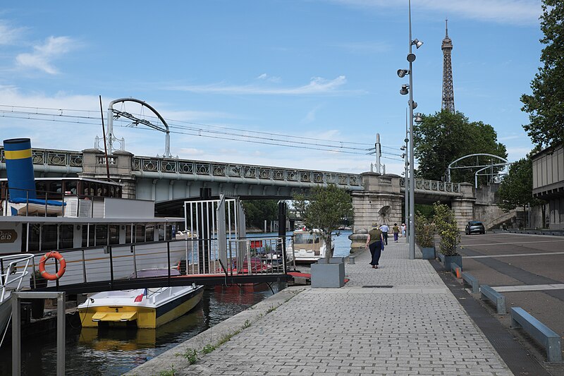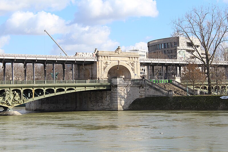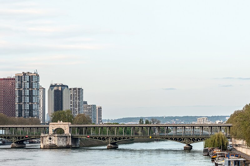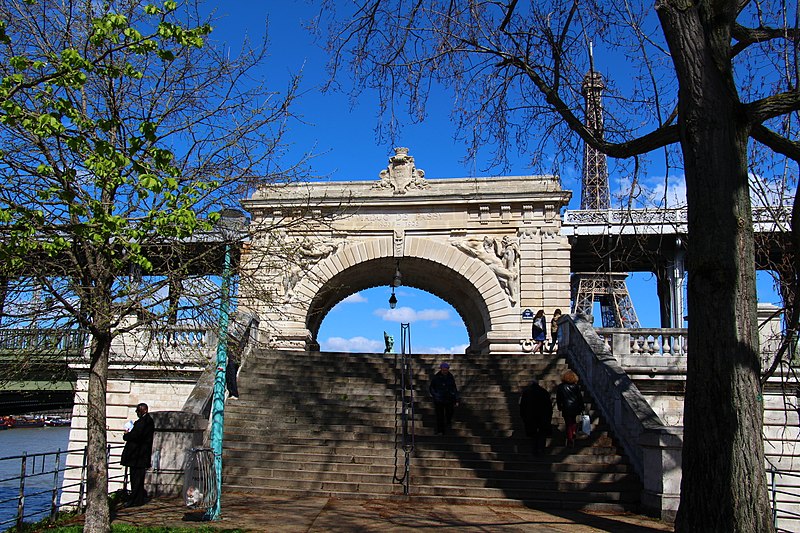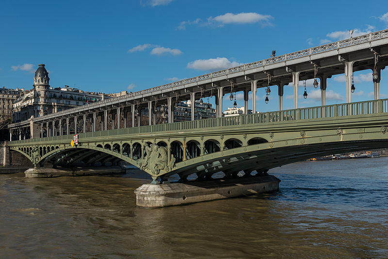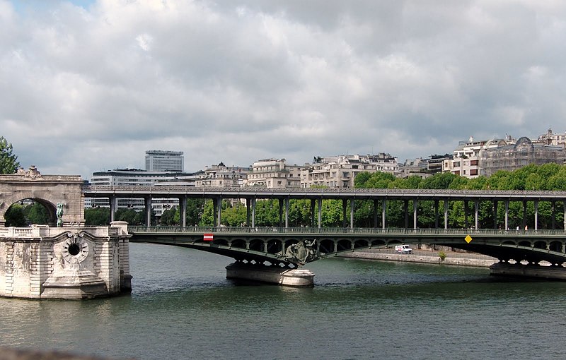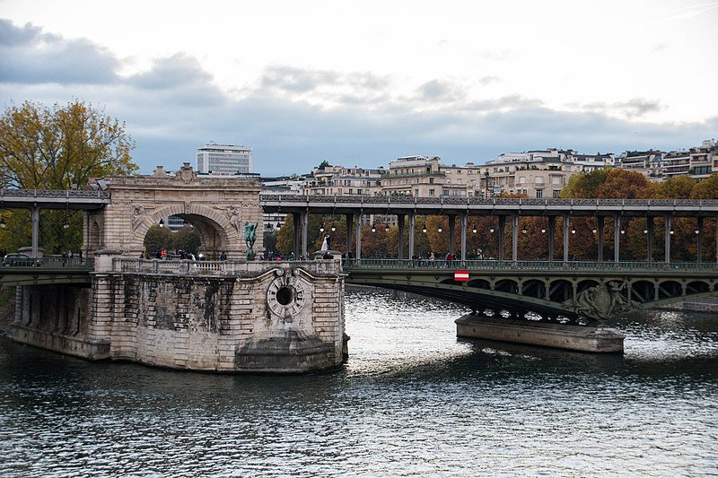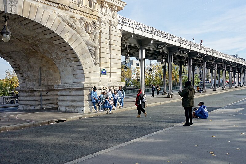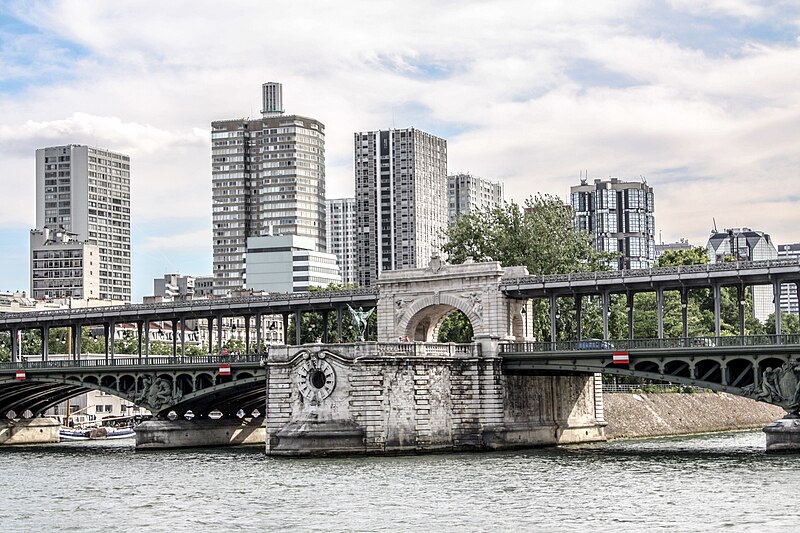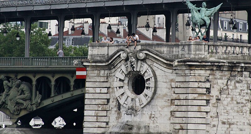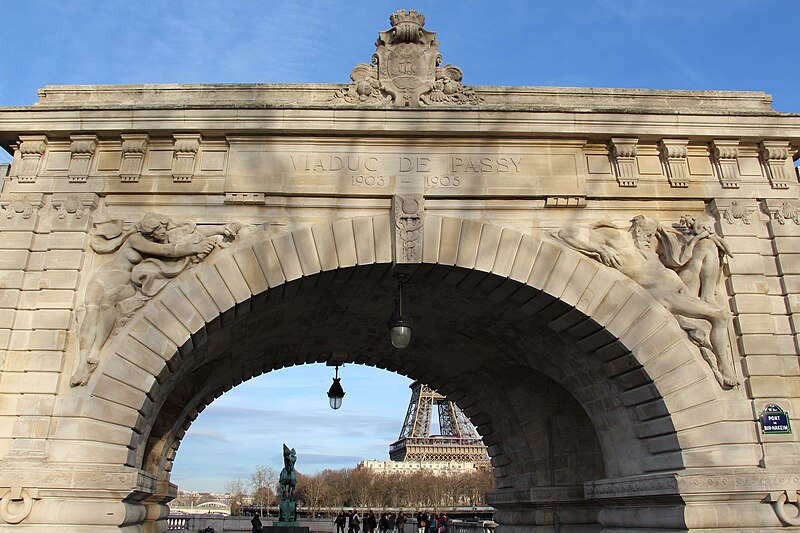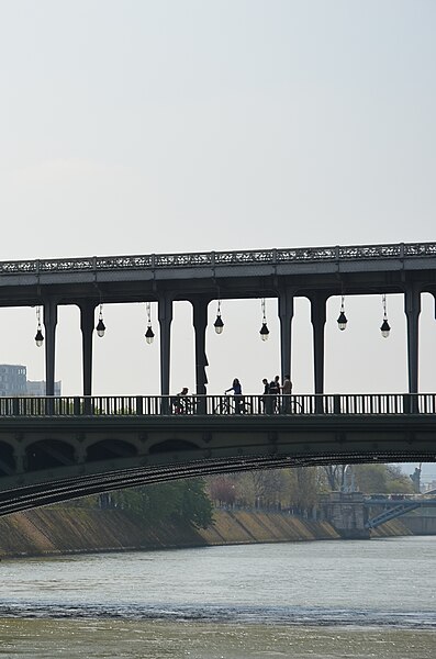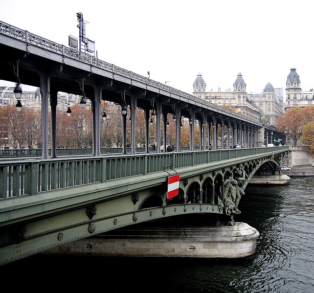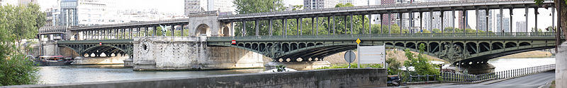 Le pont de Bir-Hakeim, anciennement pont de Passy, franchit la Seine entre les 15e et 16e arrondissements de Paris. Construit entre 1903 et 1905 sur l'emplacement d'une passerelle érigée pour l'Exposition universelle de 1878, il comporte deux niveaux : une chaussée pour véhicules et piétons et, au-dessus, un viaduc qui porte la ligne 6 du métro. L'ouvrage, réalisé par l'entreprise Daydé et Pillé sur les plans de l'ingénieur Louis Biette et de l'architecte Camille-Jean Formigé, traverse la Seine en diagonale et s'appuie sur l'île aux Cygnes, un portique monumental séparant deux travées de longueurs inégales. Les piles en maçonnerie sont ornées de groupes en fonte sculptés par Gustave Michel représentant des nautes et des forgerons-riveteurs, reproduits symétriquement en amont et en aval. Sur l'arche centrale du viaduc figurent quatre bas-reliefs : La Science et Le Travail de Jules Coutan en amont, L'Électricité et Le Commerce de Jean-Antoine Injalbert en aval. À la pointe de l'île aux Cygnes se dresse La France renaissante, d'Holger Wederkinch, offerte par la communauté danoise de Paris en 1930. En 1942, les poteaux métalliques supportant le viaduc supérieur furent modifiés pour accepter des rames plus lourdes et les garde-corps de la voie routière furent également altérés. Le pont présente une partie centrale en porte-à-faux de 12 mètres ; le viaduc ferroviaire est horizontal tandis que la chaussée routière descend de la rive gauche vers la rive droite, entraînant un écart variable entre les deux voies. Le viaduc est généralement soutenu par des colonnades métalliques, sauf au débouché de l'île où il repose sur une arche en maçonnerie. Sous le viaduc se trouve une piste cyclable et, au milieu du pont, des escaliers permettent d'accéder à l'île aux Cygnes, promenade menant au pont de Grenelle et à la réplique de la Statue de la Liberté. Une plaque commémorative au milieu du pont rappelle les exploits de la première brigade des Forces françaises libres lors de la bataille de Bir Hakeim, dont le nom a été donné au pont en mémoire du combat livré en Libye en 1942. Le 18 juin 1949, une cérémonie municipale rebaptisa officiellement l'ouvrage et en fit un lieu de mémoire des Français libres ; un monument en hommage à la 1re division française libre fut ajouté à proximité en 1955. Le terre-plein central piétonnier a été nommé promenade Jean-Paul-Belmondo en mars 2023, en référence à une scène tournée sur le métro du viaduc. Le pont a été le théâtre d'actes de violence : le 24 octobre 1975 l'ambassadeur de Turquie à Paris et son chauffeur y furent assassinés, et le 2 décembre 2023 un touriste y fut mortellement poignardé. Il offre une vue remarquable sur la tour Eiffel et accueille souvent la foule lors des grands événements ; le site est desservi par les stations de métro Passy et Bir-Hakeim. Le pont de Bir-Hakeim a été inscrit au titre des monuments historiques par arrêté du 10 juillet 1986. Son décor et sa silhouette en ont fait un lieu prisé du cinéma, parmi les tournages cités figurent Ascenseur pour l'échafaud, Zazie dans le métro, Le Professionnel, Peur sur la ville, Ronin, Taxi 2, Le Dernier Tango à Paris, Benjamin Gates et le Livre des secrets, Munich et Inception. L'histoire de l'ouvrage comporte aussi des incidents comme la chute d'un obus le 15 juillet 1918.