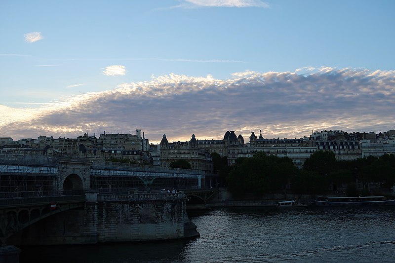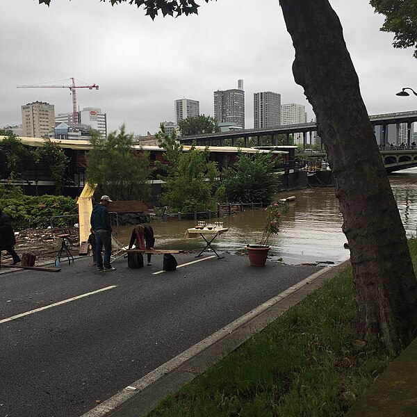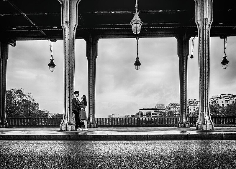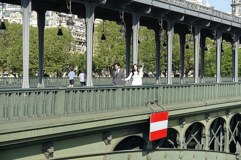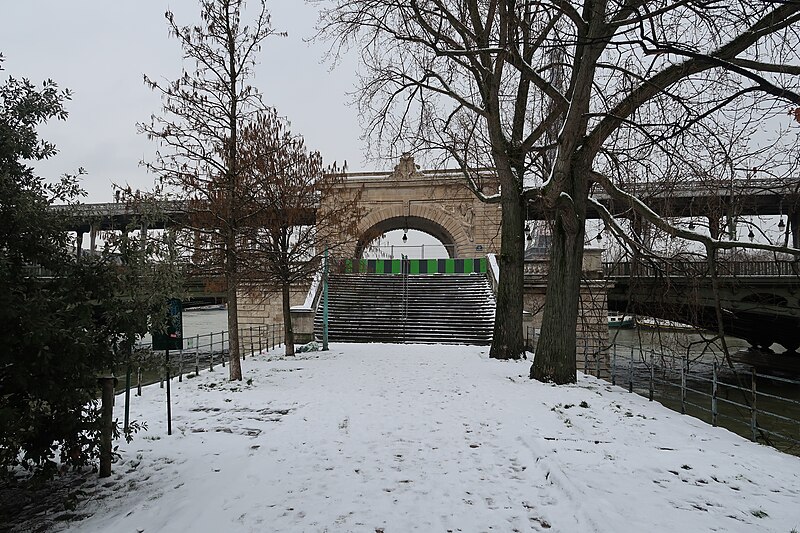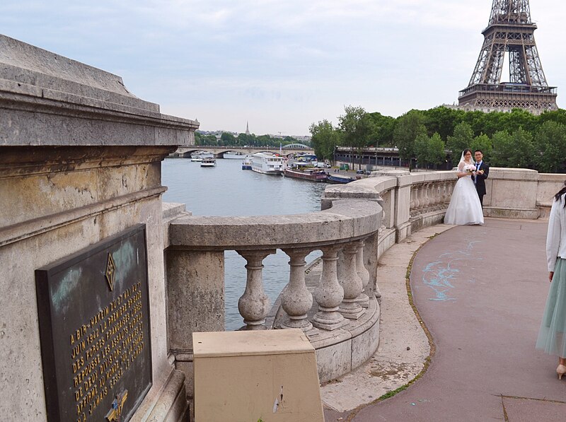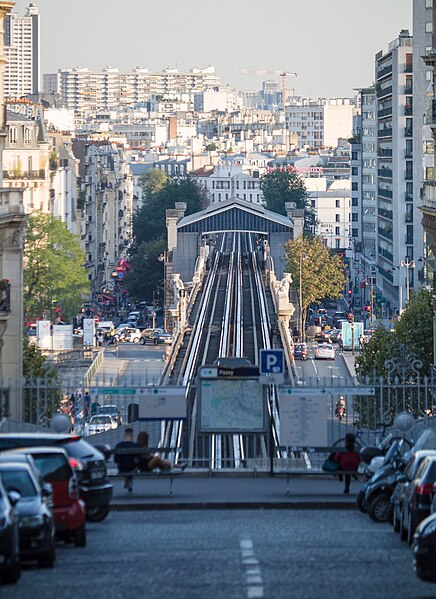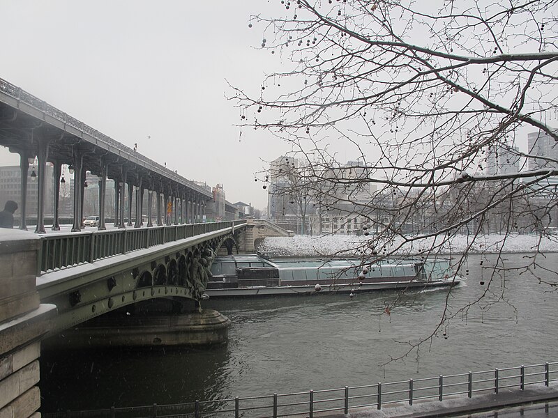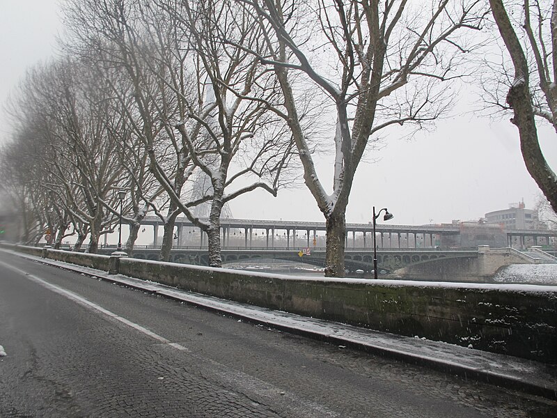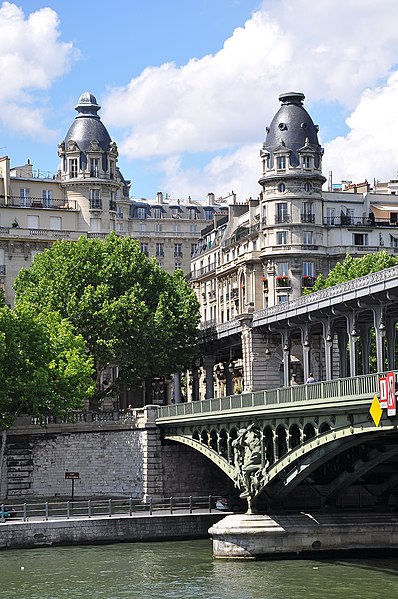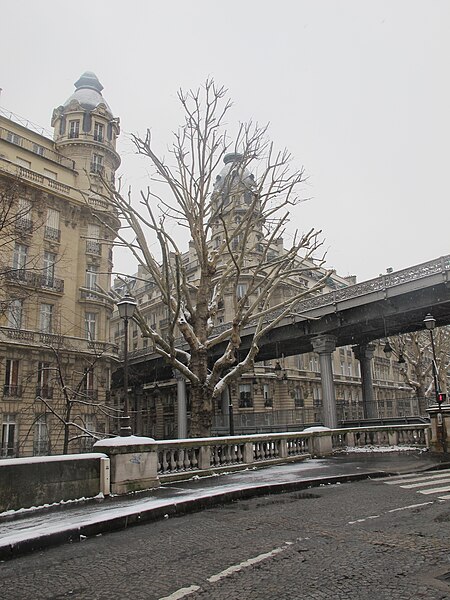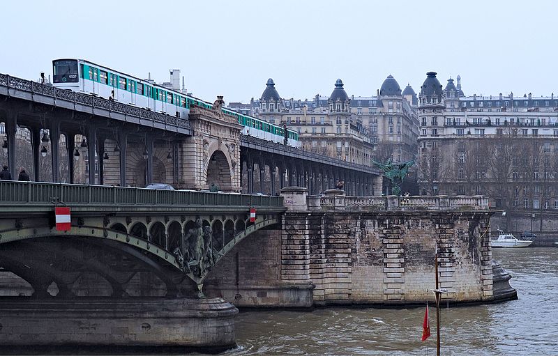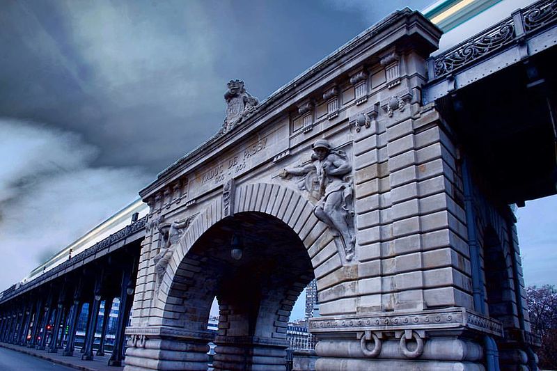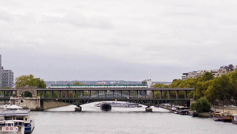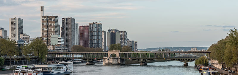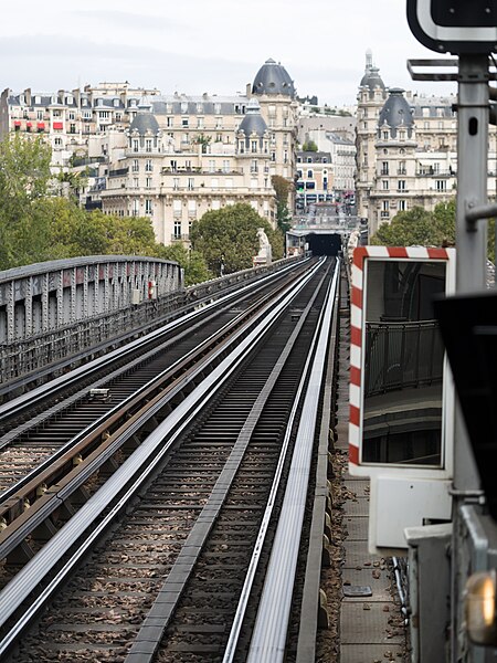 Le pont de Bir-Hakeim, anciennement pont de Passy, franchit la Seine entre les 15e et 16e arrondissements de Paris. Construit entre 1903 et 1905 sur l'emplacement d'une passerelle érigée pour l'Exposition universelle de 1878, il comporte deux niveaux : une chaussée pour véhicules et piétons et, au-dessus, un viaduc qui porte la ligne 6 du métro. L'ouvrage, réalisé par l'entreprise Daydé et Pillé sur les plans de l'ingénieur Louis Biette et de l'architecte Camille-Jean Formigé, traverse la Seine en diagonale et s'appuie sur l'île aux Cygnes, un portique monumental séparant deux travées de longueurs inégales. Les piles en maçonnerie sont ornées de groupes en fonte sculptés par Gustave Michel représentant des nautes et des forgerons-riveteurs, reproduits symétriquement en amont et en aval. Sur l'arche centrale du viaduc figurent quatre bas-reliefs : La Science et Le Travail de Jules Coutan en amont, L'Électricité et Le Commerce de Jean-Antoine Injalbert en aval. À la pointe de l'île aux Cygnes se dresse La France renaissante, d'Holger Wederkinch, offerte par la communauté danoise de Paris en 1930. En 1942, les poteaux métalliques supportant le viaduc supérieur furent modifiés pour accepter des rames plus lourdes et les garde-corps de la voie routière furent également altérés. Le pont présente une partie centrale en porte-à-faux de 12 mètres ; le viaduc ferroviaire est horizontal tandis que la chaussée routière descend de la rive gauche vers la rive droite, entraînant un écart variable entre les deux voies. Le viaduc est généralement soutenu par des colonnades métalliques, sauf au débouché de l'île où il repose sur une arche en maçonnerie. Sous le viaduc se trouve une piste cyclable et, au milieu du pont, des escaliers permettent d'accéder à l'île aux Cygnes, promenade menant au pont de Grenelle et à la réplique de la Statue de la Liberté. Une plaque commémorative au milieu du pont rappelle les exploits de la première brigade des Forces françaises libres lors de la bataille de Bir Hakeim, dont le nom a été donné au pont en mémoire du combat livré en Libye en 1942. Le 18 juin 1949, une cérémonie municipale rebaptisa officiellement l'ouvrage et en fit un lieu de mémoire des Français libres ; un monument en hommage à la 1re division française libre fut ajouté à proximité en 1955. Le terre-plein central piétonnier a été nommé promenade Jean-Paul-Belmondo en mars 2023, en référence à une scène tournée sur le métro du viaduc. Le pont a été le théâtre d'actes de violence : le 24 octobre 1975 l'ambassadeur de Turquie à Paris et son chauffeur y furent assassinés, et le 2 décembre 2023 un touriste y fut mortellement poignardé. Il offre une vue remarquable sur la tour Eiffel et accueille souvent la foule lors des grands événements ; le site est desservi par les stations de métro Passy et Bir-Hakeim. Le pont de Bir-Hakeim a été inscrit au titre des monuments historiques par arrêté du 10 juillet 1986. Son décor et sa silhouette en ont fait un lieu prisé du cinéma, parmi les tournages cités figurent Ascenseur pour l'échafaud, Zazie dans le métro, Le Professionnel, Peur sur la ville, Ronin, Taxi 2, Le Dernier Tango à Paris, Benjamin Gates et le Livre des secrets, Munich et Inception. L'histoire de l'ouvrage comporte aussi des incidents comme la chute d'un obus le 15 juillet 1918.