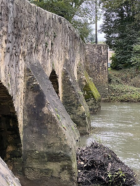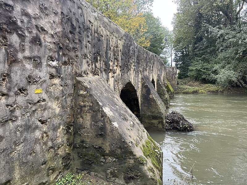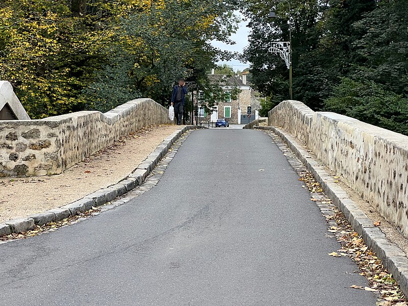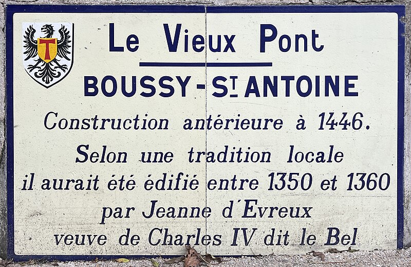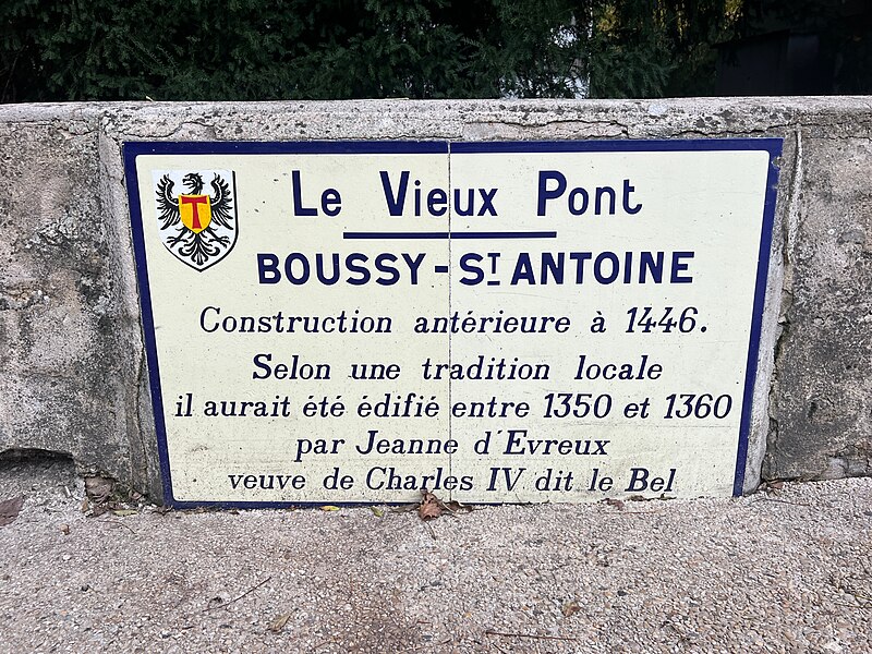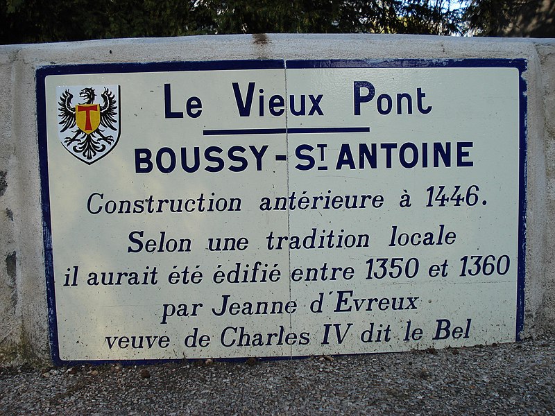 Le vieux pont de Boussy-Saint-Antoine, dit pont de la Reine Blanche ou de la Dame Blanche, est un ouvrage du XIVe siècle qui enjambe l'Yerres. Il est constitué de quatre arches plein cintre : trois principales de plus de quatre mètres de large et une quatrième, plus modeste, destinée à l'évacuation des eaux en cas de crues. Chaque arche repose sur de larges culées flanquées de contreforts. Une plaque apposée sur le parapet indique que le pont est antérieur à 1446 et, selon la tradition locale, qu'il aurait été construit entre 1350 et 1360 par Jeanne d'Évreux, veuve de Charles IV dit le Bel. L'érudit local Charles Motheau rapporte en 1911 que le pont fut édifié vers 1355 à la demande de Jeanne d'Évreux, alors dame de Brie-Comte-Robert, à la suite d'un accident où elle faillit se noyer en traversant le gué de Boussy sur la route de Brie. Selon ce récit, l'Yerres, souvent soudainement gonflée par de fortes pluies, aurait presque emporté sa haquenée lors de son retour d'une visite à sa nièce Navarre à Corbeil. Le pont fait l'objet d'une inscription au titre des monuments historiques depuis le 20 juillet 1972. L'ouvrage a été entièrement restauré durant l'été 2008 pour un montant de 400 000 euros financé par le conseil général de l'Essonne. Il permet aujourd'hui à la départementale 33 de franchir l'Yerres dans les deux sens, avec des feux alternés, et appartient au département de l'Essonne.