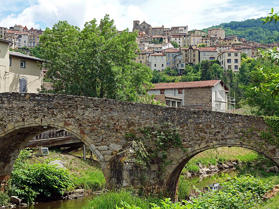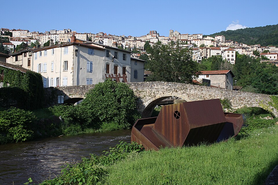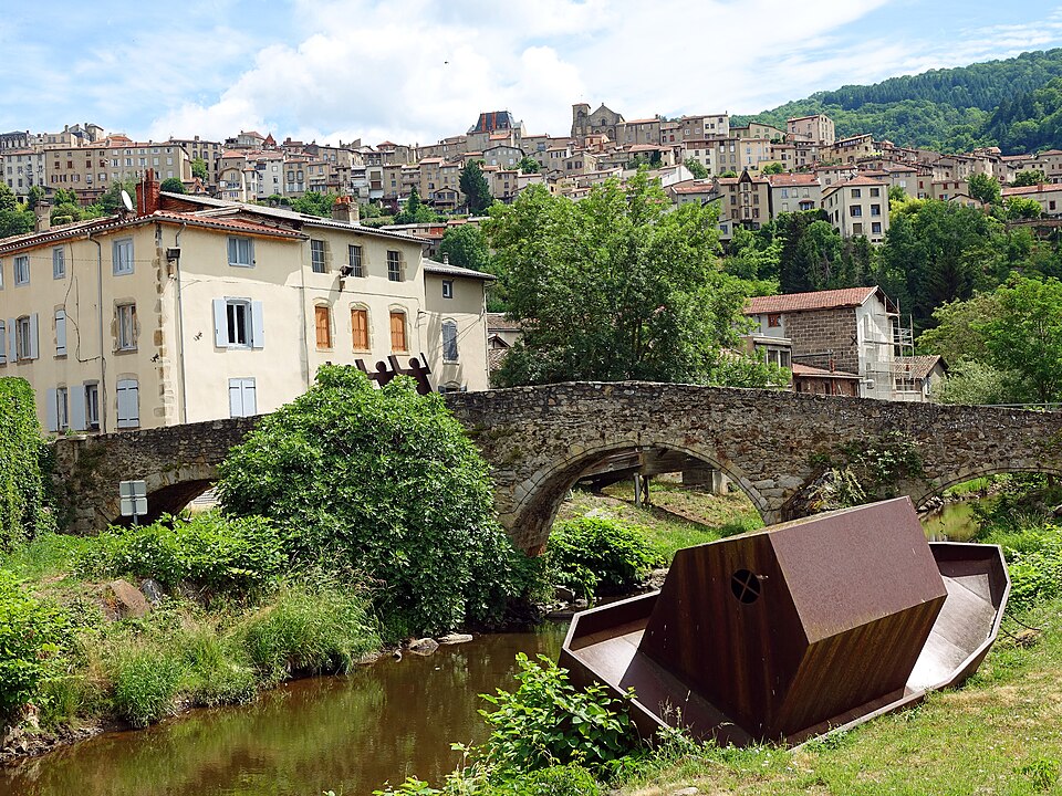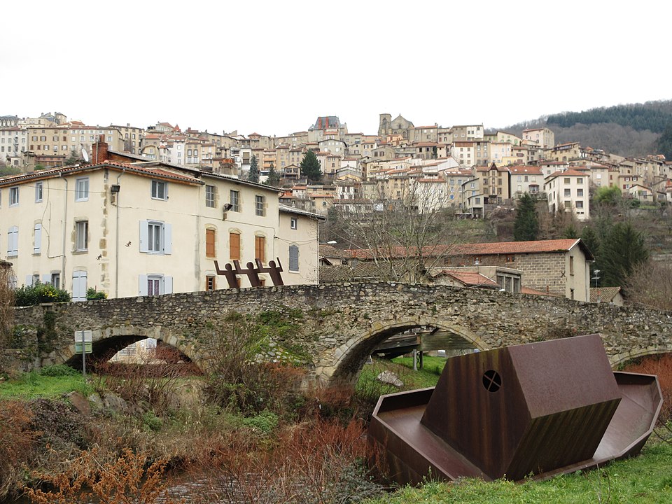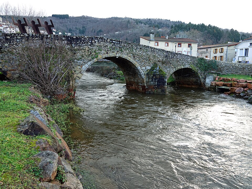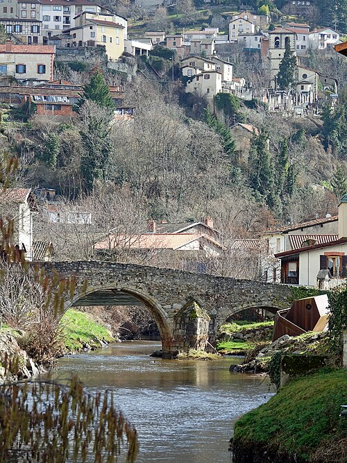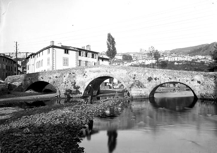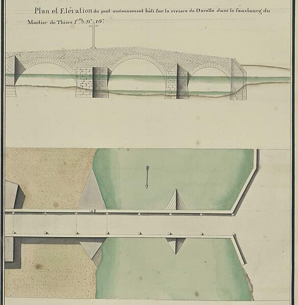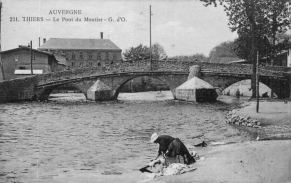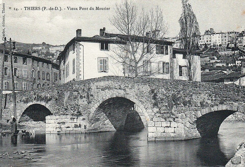 Le pont de Moutier, ou pont du Navire, enjambe la Durolle dans le quartier du Moûtier à Thiers (Puy-de-Dôme). Sa construction est estimée entre le début du XVIe siècle et la première moitié du XVIIe siècle, ce qui en fait l'un des plus anciens de la ville, aux côtés du pont Vielh, du pont Saint-Jean et du pont de Seychalles. Il relie le bas de l'avenue Béranger et de la rue Rouget-de-l'Isle à la rive opposée, au niveau de la rue de Clermont, et la circulation s'y effectue aujourd'hui à sens unique. Jusqu'à la fin des années 1970 il supportait la circulation à double sens, régulée alors par des feux à chaque extrémité, et une passerelle en fer et en bois permet aux piétons d'éviter d'emprunter le tablier. Monument apprécié des habitants et symbole de la ville, il offre un beau panorama sur la ville haute médiévale qui le domine à l'est et il est inscrit aux Monuments historiques depuis 1926. Le nom principal était à l'origine « pont du Moûtier » — appellation conservée sur le cadastre napoléonien de 1836 — mais il est aussi appelé « pont du Navire » dès la première moitié du XXe siècle ; une œuvre métallique en forme de navire, ajoutée en aval lors du Symposium international de sculptures monumentales métalliques de 1985, a renforcé cette dénomination. Dans les documents anciens il apparaît encore sous d'autres noms, tels que « pont Oschon », traduit de l'auvergnat par « pont au chou », ou parfois « pont de Gironde » ; avant l'urbanisation du quartier, le pont menait sur des champs appelés « pré au chou ». La date exacte de sa construction reste inconnue ; une représentation du quartier dans l'Armorial de Revel, au milieu du XVe siècle, montre seulement deux planches jetées sur la Durolle, ce qui indique que le pont de pierre actuel n'existait pas encore à la fin du Moyen Âge. Un plan de 1730 le qualifie déjà d'ancien, d'où l'estimation de sa réalisation entre le XVIe et la première moitié du XVIIe siècle. On attribue souvent au pont le rôle de point de départ d'une navigation de la Durolle vers la Dore, d'où l'appellation « Navire » et la présence d'une place du Navire sur la rive gauche, mais l'existence d'une voie fluviale ancienne au départ du pont demeure incertaine. Des documents des XVIIe siècles attestent toutefois de tentatives visant à rendre navigable la basse Durolle entre 1615 et 1678 : en 1628 le conseil de ville commanda une étude, en 1666 l'intendant débloqua des fonds pour nettoyer le cours d'eau et poser un câble de halage, et une inspection eut lieu en 1678 ; ces projets échouèrent en raison de la non-rentabilité et de la difficulté d'entretien des zones de halage et du lit. La zone portuaire en aval était appelée en patois « viro barco », traduit par « demi-tour des barques » ; l'historien Alexandre Bigay a soutenu l'existence d'un port près du Moutier en s'appuyant sur deux textes de 1640 et 1669, mais d'autres érudits estiment que ces mentions visent plutôt un port sur la Dore. Pour l'exportation, Thiers a principalement utilisé les ports de la Dore à Peschadoires et, surtout, à Puy-Guillaume. Il est possible que des tentatives antérieures de flottage ou de halage aient eu lieu aux périodes médiévale ou antique, mais elles ne sont pas prouvées ; certains historiens voient toutefois dans le navire trois-mâts de l'ancien blason de Thiers un indice de ces activités. Architecturalement, le pont présente une allure trapue et massive, voulue pour résister aux colères de la Durolle. Son tablier, dès l'origine suffisamment large pour les attelages lourds, supporte aujourd'hui des véhicules légers jusqu'à 3,5 tonnes. L'ouvrage est un pont vouté constitué de trois arches plein cintre dissymétriques, qui reposent sur deux piles dotées d'avant-becs et d'arrière-becs massifs ; dans le régime d'écoulement normal, la rivière passe sous deux des trois arches, comme l'atteste le plan de 1730. Une pile plus petite est en pleine rivière, l'autre, plus importante, s'appuie en partie sur une zone sèche de la rive droite qui n'est submergée qu'en cas de fortes crues. Les parties en contact avec l'eau (bas des piles, becs) et les voûtes des arches sont appareillées en pierre taillée, principalement en granite bleu-gris et en arkose jaunâtre ; les élévations jusqu'aux parapets sont maçonnées de façon plus grossière, mêlant appareil irrégulier et tout-venant, témoignant des réparations successives, notamment en 1753 et en 1785. Les culées rive gauche et rive droite sont aujourd'hui noyées dans l'urbanisation du quartier et deviennent invisibles. Des vues amont et aval, y compris des représentations du début du XXe siècle, illustrent son évolution et son insertion dans le paysage urbain.