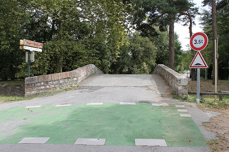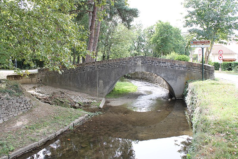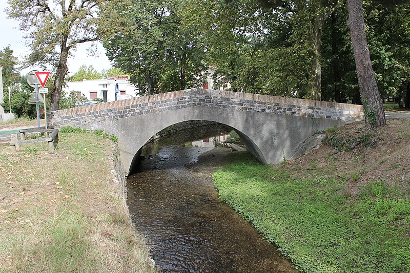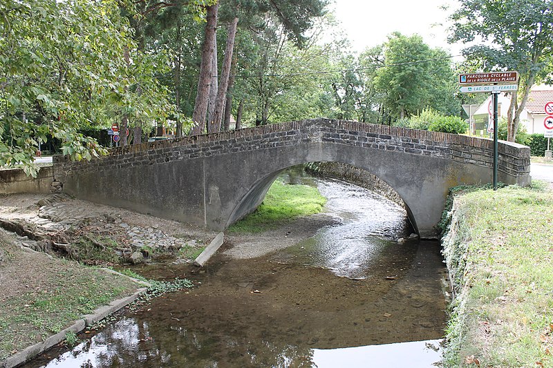 Le pont du Riat, en dos d'âne, est associé à un abreuvoir et à un lavoir. Il évoque les ponts de la fin du XVIIe siècle, typiques des ouvrages de la rigole, bien qu'il ait été remanié au XIXe siècle. Il a probablement été construit lors de l'établissement de la Rigole de la Plaine à la fin du XVIIe siècle, la carte de Cassini montrant la route franchissant la rigole à cet endroit. Un devis daté du 8 thermidor an V (26 juillet 1797) porte les réparations ordonnées par le ministre de l'Intérieur d'après une lettre du 22 prairial adressée à l'ingénieur du canal. Le pont, alors désigné Pont del Reyats, devait subir plusieurs travaux, notamment la reconstruction complète des bahuts en maçonnerie de moellons (33 m de long sur 0,32 m de large) et l'enduit intégral des parapets et des têtes ; le montant était évalué à 70,76 livres. Dans son rapport du 10 mars 1899, l'ingénieur ordinaire signale la demande du maire de Revel pour une réparation urgente du pont et de l'abreuvoir attenant, également utilisé comme lavoir. Il signale le mauvais état de l'ouvrage, notamment un tablier d'une épaisseur de 40 cm au lieu des 60 cm attendus et la disparition des parapets, et confirme l'urgence de travaux différés depuis quinze ans. Il préconise d'engager dès que possible les réparations nécessaires et rappelle que l'entretien de l'abreuvoir incombe à la commune. À la fin de 1900, des devis établis par M. de Volontate, ingénieur en chef, et M. Ader, ingénieur, permettent d'engager les travaux. Les travaux sur l'abreuvoir comprenaient la reconstruction du radier pavé disloqué. La commune de Revel demande le 22 décembre 1901 l'autorisation d'édifier un lavoir public côté gauche en amont, immédiatement contigu à l'abreuvoir et au pont. Le conducteur des Ponts et Chaussées, M. Viguié, est chargé de la surveillance des travaux qui débutent en juillet 1902. La plate-forme du lavoir est établie pour partie sur le fond de la Rigole et pour partie sur le talus ; elle possède une bordure en pierre de taille raccordée en amont au perré maçonné d'un mètre de haut et en aval aux maçonneries de l'abreuvoir. Depuis lors, la commune verse à l'administration du Canal du Midi une redevance annuelle d'un franc pour l'abreuvoir et d'un franc pour le lavoir. En 1928, le lavoir est intégralement couvert sur 20 mètres par un appentis constitué de fermes métalliques et de tôles ondulées. Le 22 janvier 1980, le maire de Revel informe l'administration du Canal qu'il renonce à l'occupation temporaire du lavoir public, démoli le mois suivant. Des vestiges des bordures en pierre de taille et du perré bordant le talus sont encore visibles de nos jours.