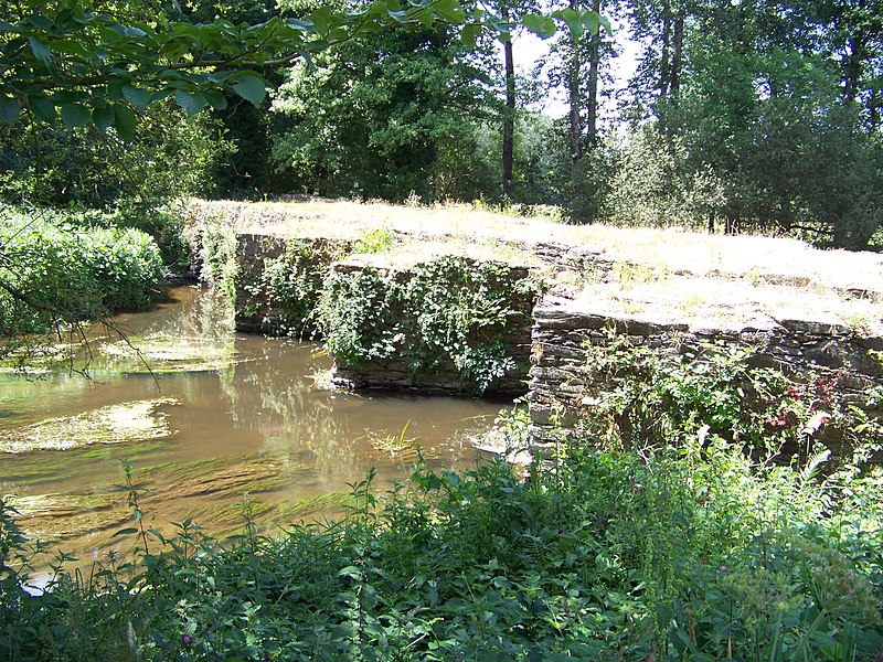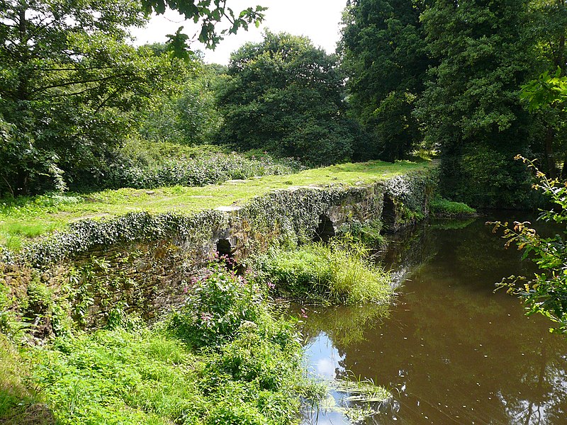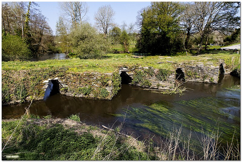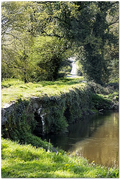 Le pont gaulois dit de Sainte-Catherine se situe entre Plounévézel (lieu-dit Kergonan, Finistère) et Treffrin (Côtes-d'Armor), en Bretagne. Son origine est attribuée aux périodes gauloise et du Haut Moyen Âge ; il s'appuie sur l'ancienne voie romaine reliant Carhaix à Lannion. Classé au titre des Monuments historiques le 22 juin 1964, il est décrit comme un ouvrage primitif. Construit en pierres sèches de schiste gris-bleu, il comporte trois arches de portées inégales et quatre éperons, et sa longueur totale est d'environ soixante mètres. Les arches, en encorbellement et de forme triangulaire, sont montées avec des pierres plates imbriquées et empilées horizontalement ; elles se rejoignent au sommet sous une dalle plate qui forme le tablier. La hauteur mesurée du fond de la rivière au sommet de l'arche centrale est de 3,20 m ; le tablier a une épaisseur de 0,90 m. Les parapets mesurent 0,40 m de hauteur pour 0,60 m de largeur.