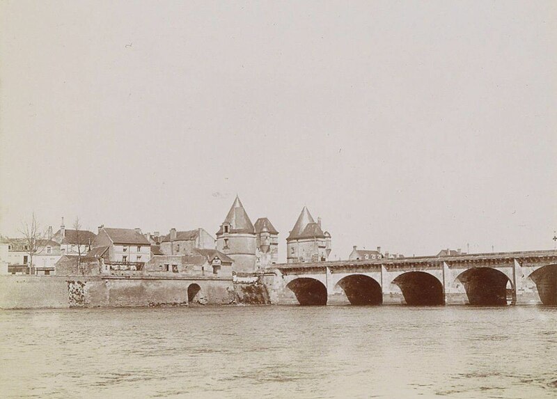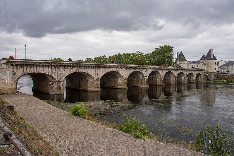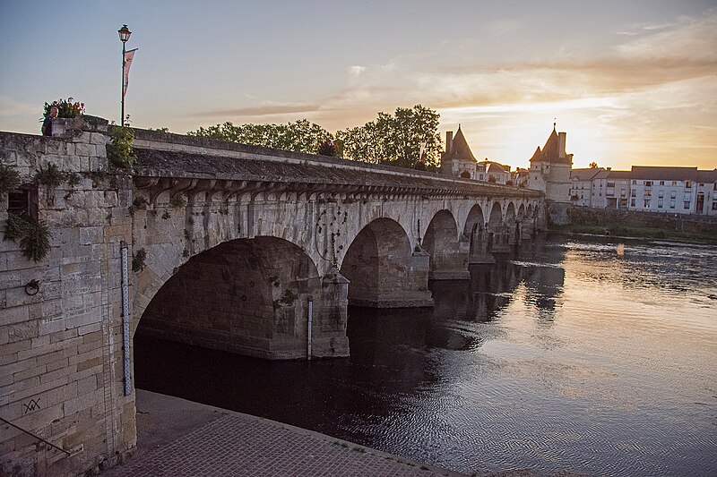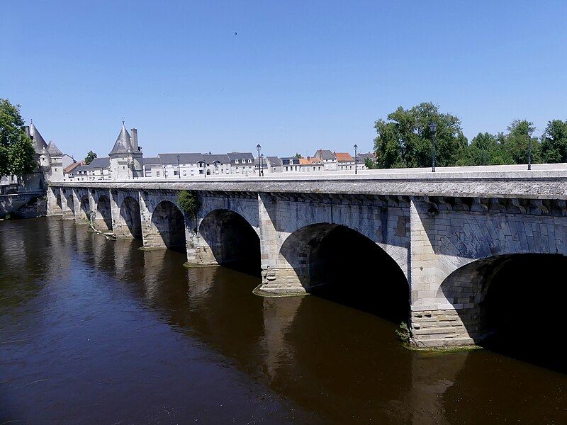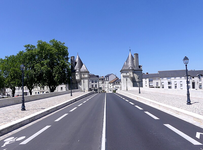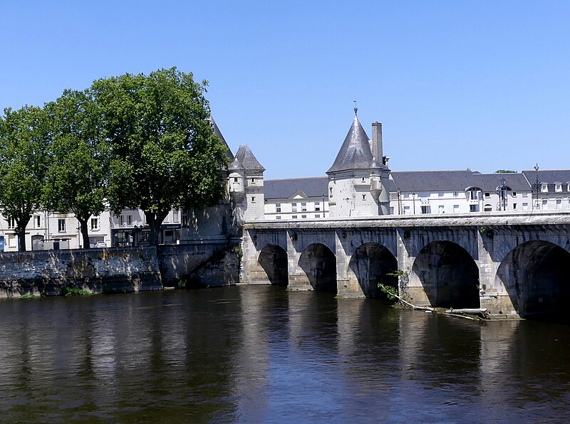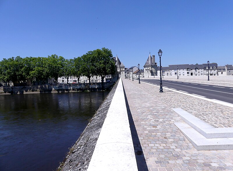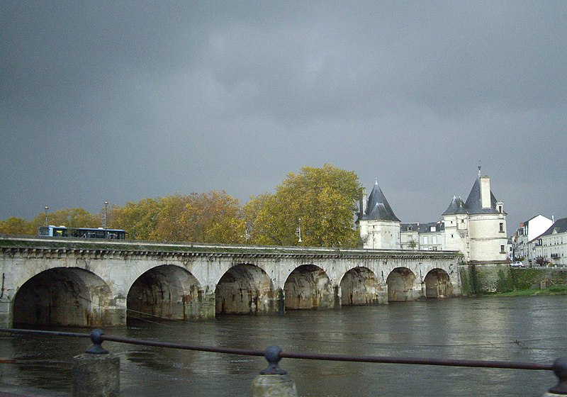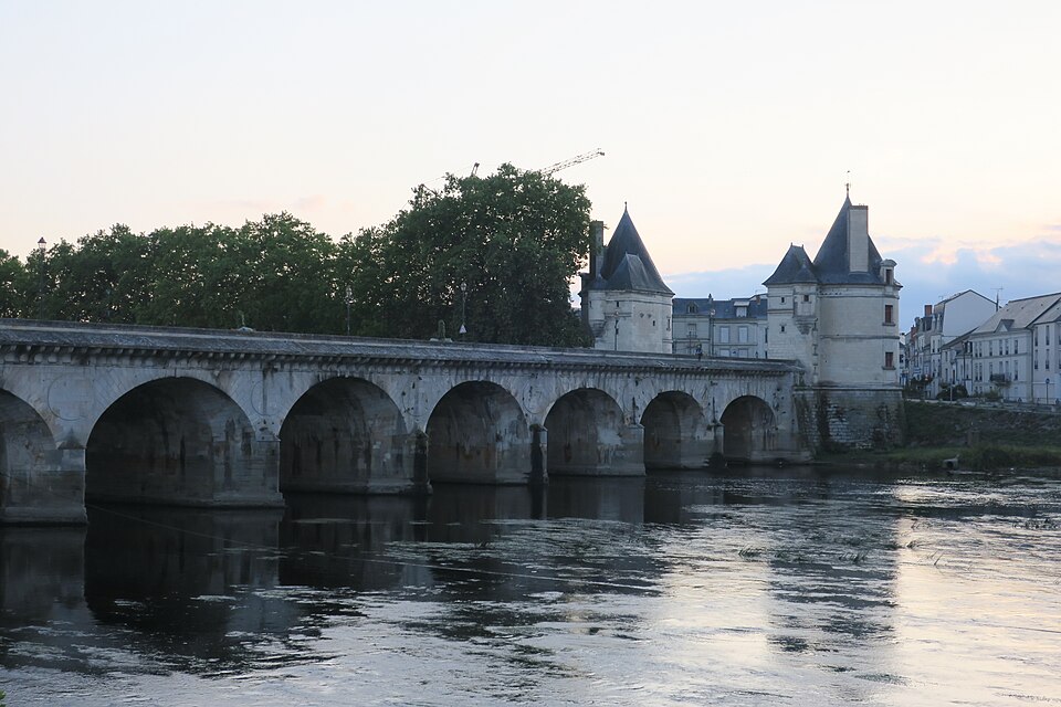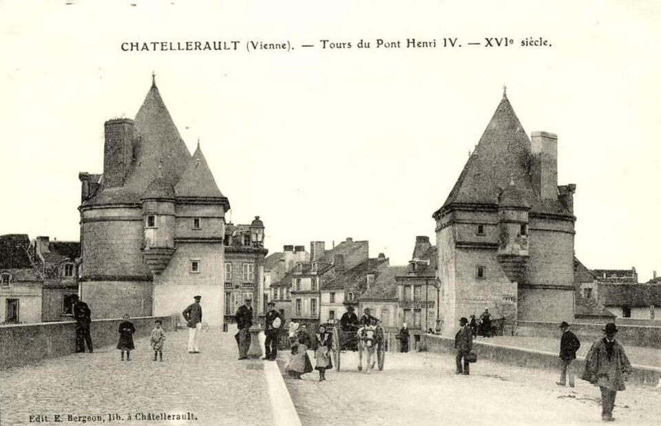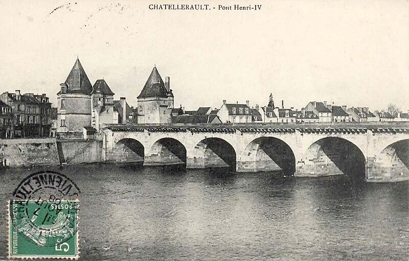Le pont Henri-IV, en maçonnerie, a été construit entre 1565 et 1609 pour franchir la Vienne à Châtellerault ; il s’étend sur environ 144 mètres et sa plateforme droite, large de 21 mètres, est équipée de trottoirs surélevés. La ville s’était développée au confluent de la Vienne et du Clain autour d’un gué mentionné dès 952, et le franchissement a d’abord été assuré par un pont en bois élevé au début du XIe siècle. En 1058, une arche du pont fut donnée aux chanoines de la collégiale Saint-Nicolas de Poitiers pour y installer un moulin, et une construction en pierre est intervenue au XIIe siècle, liée à l’urbanisation de la rive gauche. Le pont fut progressivement fortifié et équipé de tours aux extrémités, notamment vers 1350, mais il sortit très endommagé de la guerre de Cent Ans et subit de nombreuses réparations par la suite. En 1482 la ville et son pont furent intégrées au domaine royal ; le passage constituait alors un axe important reliant plusieurs provinces et routes commerciales. Des inondations, notamment celle de 1556 qui emporta le pont en bois, conduisirent le roi Henri II à ordonner une reconstruction en pierre, projet interrompu par sa mort. À partir de 1564 les habitants demandèrent la reconstruction et le roi chargea deux maîtres-architectes, Laurent Joguet et Gaschon Belle, d’étudier l’emplacement et les matériaux ; des plans et devis furent dressés et l’exploitation de carrières locales fut décidée. Les travaux commencèrent en 1565 mais furent perturbés par les guerres de religion et par des difficultés financières répétées, entraînant alternance de réparations provisoires en bois et d’avancées sur l’ouvrage de pierre. Plusieurs maîtres d’œuvre et entrepreneurs se succédèrent : Robert Blondin fut nommé pour le chantier en 1575, Charles Androuet du Cerceau prit la direction en 1594 puis, après sa mort en 1606, son fils René Androuet du Cerceau acheva l’ouvrage. Des crédits royaux furent affectés à diverses reprises et des adjudications permirent d’achever les dernières arches et les travaux de pavage au début du XVIIe siècle ; les travaux furent réputés terminés en 1609. En 1611 René Androuet du Cerceau fit édifier un pavillon entre les deux tours sur la rive gauche. Menacé de destruction lors de la retraite allemande en 1944, le pont fut sauvé les 31 août et 1er septembre par l’action du commissaire de police et lieutenant FFI Charles Bichat et par les négociations du sous-préfet Pierre-Marcel Wiltzer. Le pont permet l’accès à la ville et présente des tours rondes encore en place côté Châteauneuf ; des tours carrées situées côté ville ont disparu. Ces tours n’ont pas eu de rôle défensif permanent mais ont pu servir ponctuellement au contrôle des entrées en période d’épidémie ou de troubles ; un petit pont de trois travées côté Châteauneuf, précédé d’un pont-levis, franchissait autrefois une dérivation de la Vienne. Les travées sont appuyées sur des piles épaisses flanquées d’avant-becs et d’arrière-becs triangulaires, et les voûtes, en anse de panier, présentent des profils décroissants vers les culées avec de larges ressauts en amont et en aval. À l’instar d’autres ponts neufs construits sous Henri IV, aucune maison n’a été bâtie sur le pont malgré sa largeur. L’ouvrage est classé au titre des monuments historiques depuis 1913.