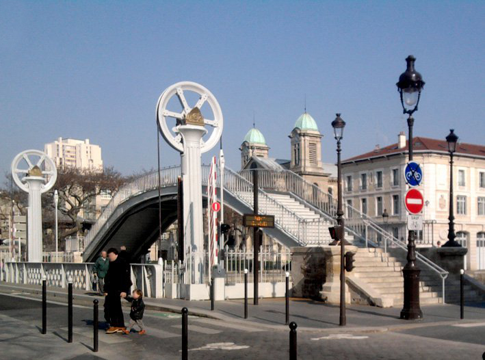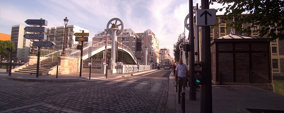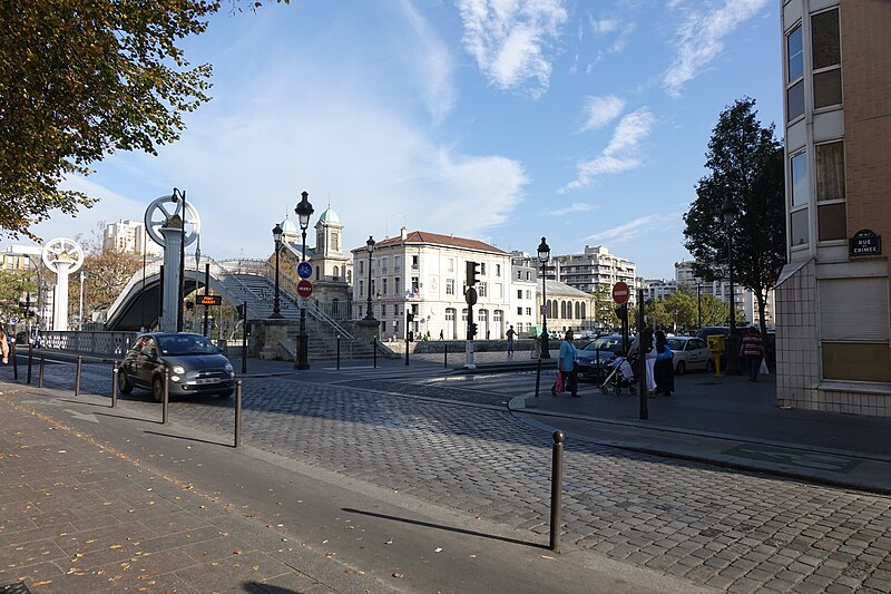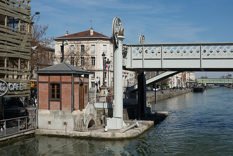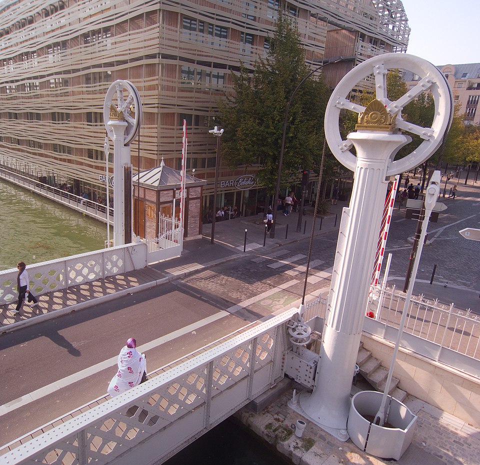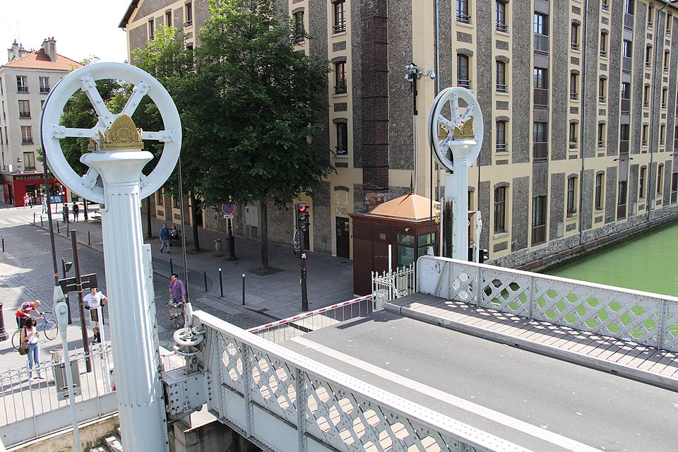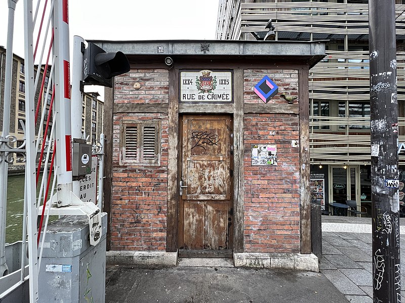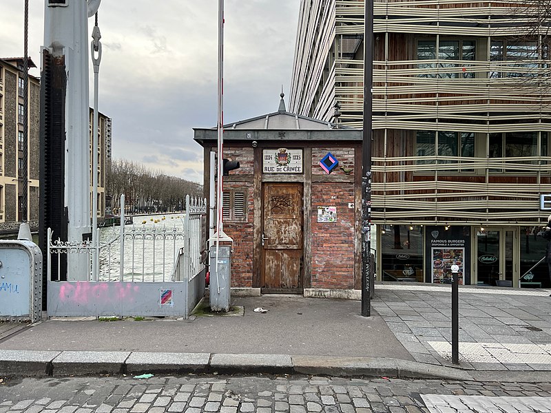 Le pont levant de la rue de Crimée se situe à l'intersection du bassin de la Villette et du canal de l'Ourcq, dans le 19e arrondissement de Paris, et relie le quai de l'Oise au quai de la Marne en prolongeant la rue de Crimée. Mis en service en 1885, il est aujourd'hui le dernier pont levant de Paris et effectue encore près de 9 000 manœuvres par an. Une passerelle piétonne fixe et surélevée, accolée au pont, permet aux piétons de traverser lorsque le tablier est relevé. Le site est desservi par les stations de métro Crimée, Riquet, Ourcq et Laumière. Un premier pont tournant, construit en 1874 pour remplacer un ouvrage en bois incendié en 1871, occupait auparavant cet emplacement. Ce pont tournant, long de 17,80 m et large de 7,60 m, disposait d'une seule volée et d'une passe pour bateaux de 7,94 m ; sa manœuvre était assurée par une machinerie hydraulique alimentée par le réservoir de Ménilmontant, avec possibilité d'actionnement manuel en cas de panne. La décision de remplacer ce pont par un pont levant s'inscrit dans un programme de rehaussement du tirant d'eau et d'amélioration de la navigation entre les bassins du port de la Villette, engagé après le rachat des canaux par la ville et l'augmentation de la profondeur à 3,20 m. Après étude des différentes solutions, le choix se porta sur un pont levant conçu sous la direction de l'ingénieur en chef Edmond Humblot, avec l'ingénieur Louis Le Chatelier et l'assistance du conducteur Briolet. Le constructeur Fives-Lille répondit seul à l'appel d'offres et proposa un ouvrage équilibré par quatre contrepoids d'angle évoluant dans des puits étanches sous le plan d'eau ; la partie apparente du mécanisme fut réduite aux chaînes, poulies d'équilibre et supports décoratifs en fonte. Fives-Lille déposa un brevet sur ce procédé le 14 décembre 1883 et sa proposition fut acceptée par le conseil municipal le 31 mars 1884. Le chantier a dû traiter des contraintes particulières, notamment l'abaissement d'un important collecteur situé sous la rue de Crimée pour tenir compte de la nouvelle profondeur du bassin, sans interrompre les services qu'il contenait. À l'époque de sa construction, l'ouvrage était le troisième pont levant construit en France. Le pont levant et la passerelle attenante ont été inscrits au titre des monuments historiques par un arrêté du 12 février 1993. L'ensemble a été entièrement rénové en 2010-2011 : la centrale hydraulique a été modernisée pour réduire la consommation d'eau potable (2 m3 par manœuvre auparavant), et la télégestion a été installée depuis le poste de commande de la première écluse du canal Saint-Denis ; le coût de l'opération a été estimé à 3,8 millions d'euros. On peut encore observer les éléments constitutifs du site, notamment la passerelle piétonne, le système de levage et le bâtiment annexe portant une plaque mentionnant la date de construction et le blason de Paris. À proximité se trouvent la place de l'Édit-de-Nantes, le centre de secours Bitche de la brigade de sapeurs-pompiers de Paris, le square Serge-Reggiani avec son kiosque à musique, l'église Saint-Jacques-Saint-Christophe de la Villette et le marché de Joinville.