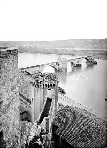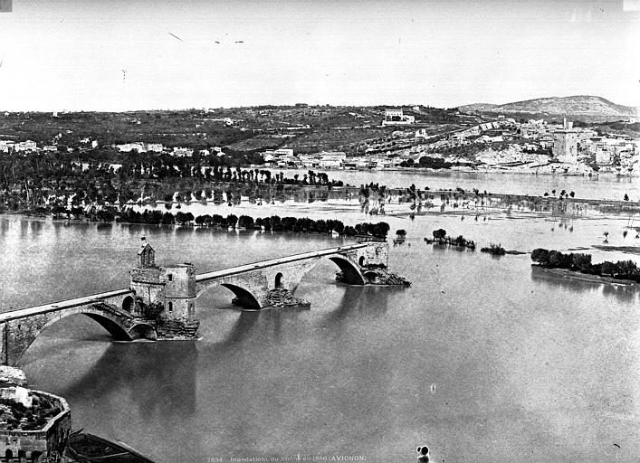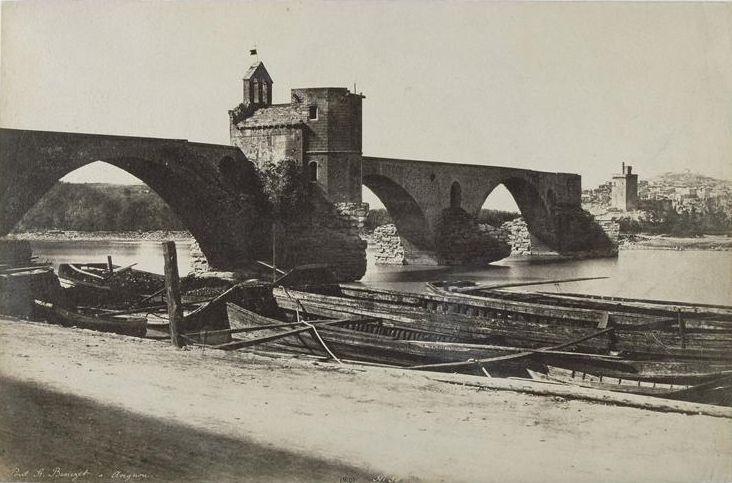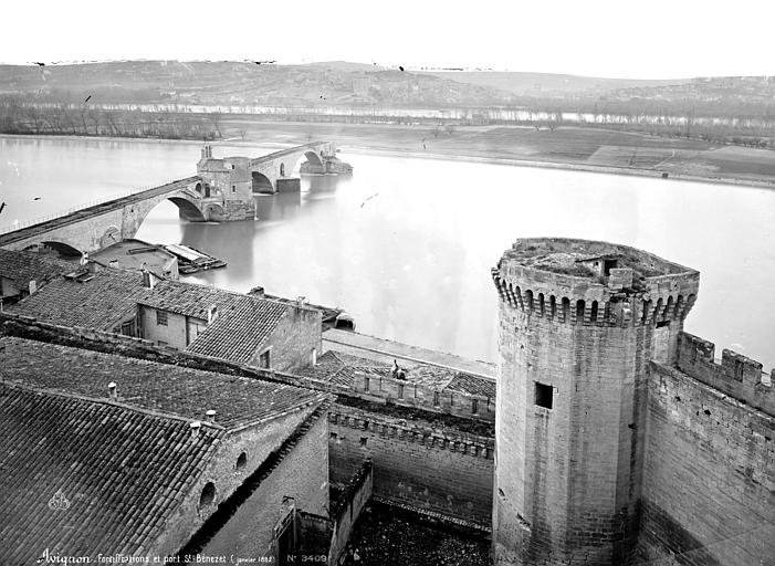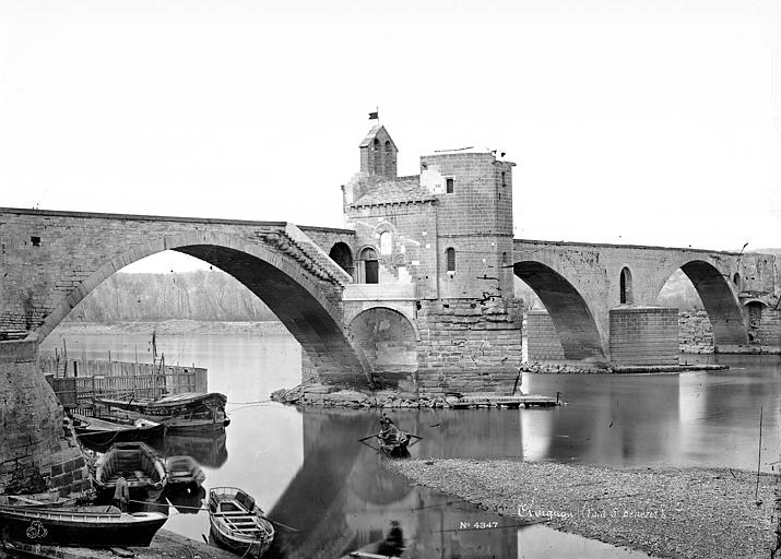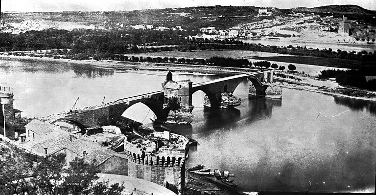 Le pont Saint‑Bénézet, couramment appelé pont d'Avignon, est un vestige rattaché à la rive gauche du Rhône composé de quatre arches encore en élévation. Il part du nord d'Avignon en direction du Gard, mais ne permet plus de traverser le fleuve : du pont originel long d'environ 900 mètres, détruit en grande partie par le Rhône, il ne subsiste qu'environ 120 mètres. Sur l'un des piliers subsistants sont édifiées la chapelle Saint‑Bénézet et, au‑dessus, la chapelle Saint‑Nicolas. Selon la tradition, Saint Bénézet entreprit la construction en 1177 sur des culées romaines ; achevé en 1185, l'ouvrage comportait vingt‑deux arches formant une ligne courbe d'environ 920 mètres pour une largeur de quatre mètres. Pendant longtemps, il fut l'un des rares points de franchissement du Rhône entre Lyon et la mer Méditerranée. Sa faible largeur empêchait le croisement des charrettes, de sorte que le transport de marchandises s'effectuait principalement par barque ou barge. En revanche, le pont jouait un rôle de poste‑frontière entre l'État pontifical et le royaume de France, permettant de contrôler le trafic et de percevoir des péages. Endommagé par les crues et les conflits, il fut reconstruit à plusieurs reprises, notamment entre 1234 et 1237. En 1479, des inondations détruisirent deux arches ; le roi Louis XI ordonna leur réparation par lettres patentes datées du 10 octobre. À l'époque du petit âge glaciaire, la modification du lit du Rhône entraîna de nouveaux effondrements : une arche en 1603, trois autres en 1605, puis la reconstruction d'au moins quatre d'entre elles vers 1628. Après la réouverture, deux arches s'effondrèrent de nouveau en 1633. Une crue en 1669 emporta plusieurs autres arches, ne laissant pratiquement que celles visibles aujourd'hui. Le pont a inspiré de nombreux artistes et figures culturelles : il est au centre de la chanson populaire "Sur le pont d'Avignon" et figurait dans l'ancien logotype de la ville, stylisé en jaune ocre. Plusieurs peintres ont représenté l'ensemble Rhône, pont et palais des papes — parmi eux James Carroll Beckwith, Paul Signac et Adrian Stokes, qui ont choisi des compositions et des proportions différentes. Le pont apparaît également dans des œuvres de la fin du XXe siècle et du début du XXIe siècle, comme le feuilleton La Demoiselle d'Avignon (1972), la bande dessinée Hypocrite de Jean‑Claude Forest (1972), un timbre de l'île de Man émis en 1974, la série La Prophétie d'Avignon (2007) et une mention dans la série Les Repentis (1997). Des photographies et gravures anciennes, notamment une prise par Édouard Baldus en 1864, ainsi que des vues depuis le jardin des Doms, l'île de la Barthelasse ou la nuit, témoignent de l'importance du site pour les représentations visuelles. Aujourd'hui, le pont Saint‑Bénézet demeure un symbole architectural et patrimonial d'Avignon, illustrant les enjeux de franchissement, de contrôle et de reconstruction liés au Rhône.