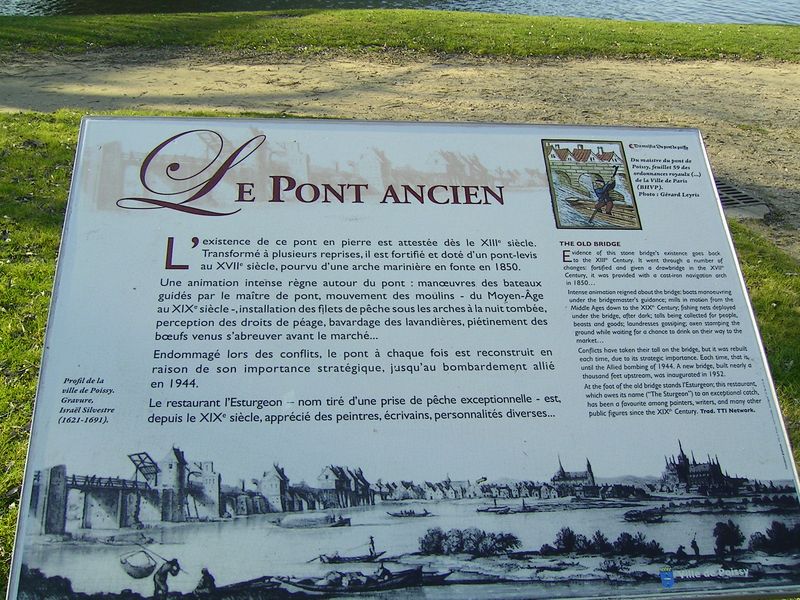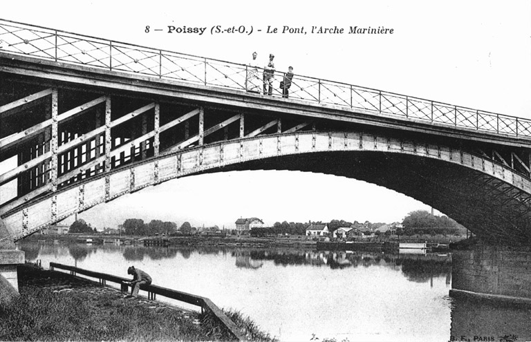 Le pont voûté en maçonnerie dit « ancien pont de Poissy » franchissait le bras principal de la Seine entre Poissy et Carrières-sous-Poissy, avec un franchissement du cours d'eau d'environ quatre cents mètres et une emprise proche d'un kilomètre entre les deux rives. Il se situe à proximité du pont moderne, à 330 mètres en aval de celui-ci et à 570 mètres en amont du pont de l'île de Migneaux. Voie de communication et d'échanges depuis le haut Moyen Âge, il desservait le marché aux bestiaux de Poissy et accueillait une activité portuaire, des pêcheries et des moulins implantés sur ses arches. Les origines du pont sont longtemps restées incertaines : les hypothèses évoquaient tour à tour une origine carolingienne, une reconstruction par saint Louis, un réemploi d'éléments anciens ou un ouvrage initial partiellement en bois, tandis que des archives montrent l'usage d'un bac en 1061 et des mentions d'un pont en bois en 1162. Des actes datés de 1209 et 1213 attestent en revanche de l'existence d'un pont en pierre vers 1200, avec la concession de moulins et l'autorisation d'établir une pêcherie sous l'arche maîtresse.