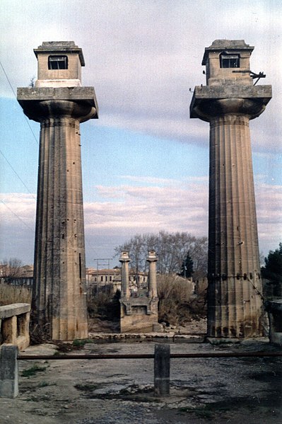 Sur chaque rive, ne subsistent que la culée, composée de deux colonnes doriques, et les maisons des gardiens.