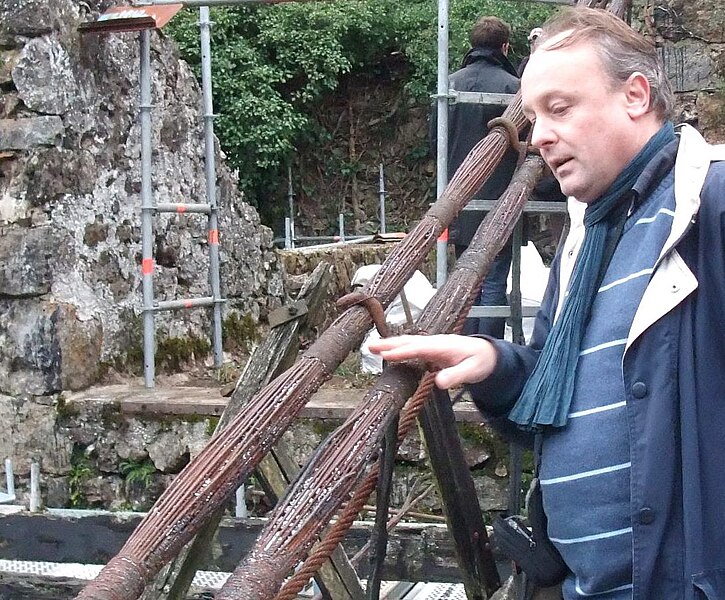 La restauration menée en 2012-2013 a cherché à reproduire fidèlement ces caractéristiques en conservant les piliers maçonnés et en procédant à une reprise des surfaces et des joints au mortier traditionnel. Chaque câble porteur a été reconstitué à partir d'un câble de fer doux de quatre kilomètres plié en va-et-vient pour obtenir cent brins parallèles ensuite ligaturés, puis galvanisés pour améliorer la résistance. Le plancher a été refait en chêne et suspendu par des suspentes métalliques identiques aux originales ; un grillage protecteur a été ajouté au garde-corps pour la sécurité des enfants. Les accès ont été repavés, le chemin depuis la route balisé et des panneaux explicatifs installés.