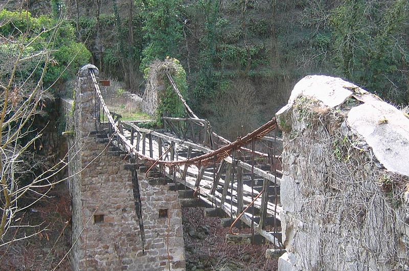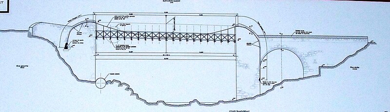 L'original de 1863 était construit selon la méthode des ponts en fils de fer : quatre câbles porteurs composés de fils parallèles, deux de chaque côté, ancrés dans la maçonnerie des rives, supportaient un tablier formé de traverses en chêne assemblées perpendiculairement et espacées d'environ 60 centimètres. Le tablier était suspendu aux câbles par des suspentes et bordé de garde-corps en bois.