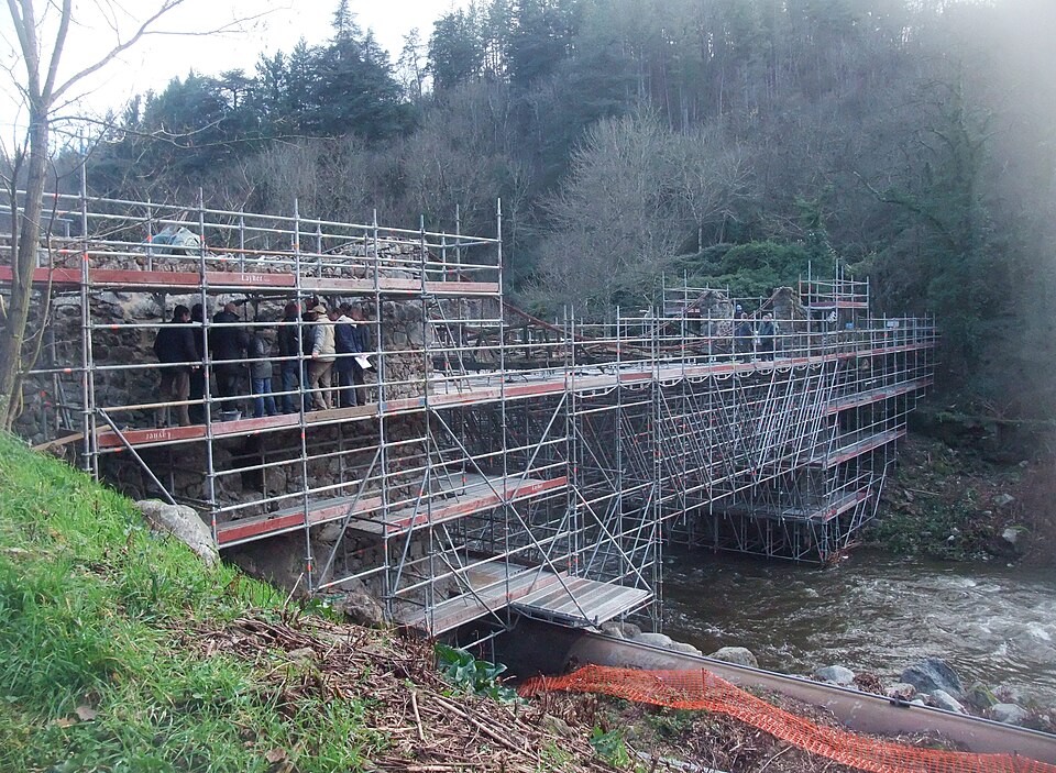 Le projet de restauration a été engagé par le Syndicat des Trois Rivières : les premières études ont débuté en 2003, le projet a été inscrit au contrat de rivière en 2004, la décision de restauration à l'identique a été prise en 2008 et le dossier technique finalisé en 2009. Les entreprises ont été consultées et choisies en 2010 et 2011, et les travaux se sont déroulés de octobre 2012 à octobre 2013 sous la maîtrise de l'architecte des Monuments historiques Olivier Naviglio. Le chantier a notamment nécessité la mise en place d'un échafaudage sous le tablier pour permettre le démontage et l'assemblage en sécurité.
