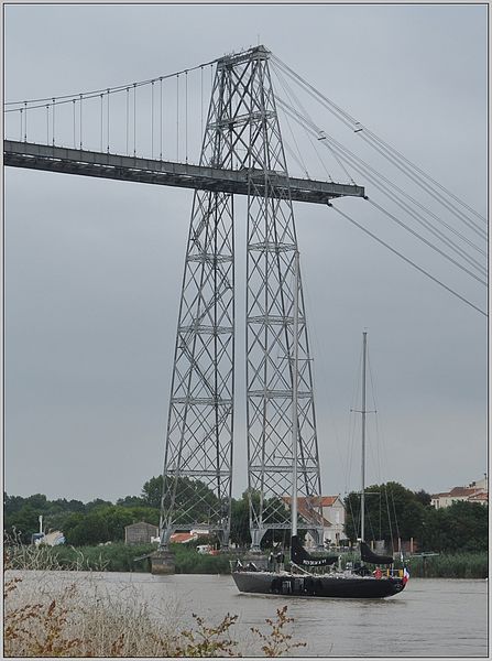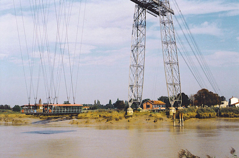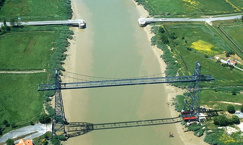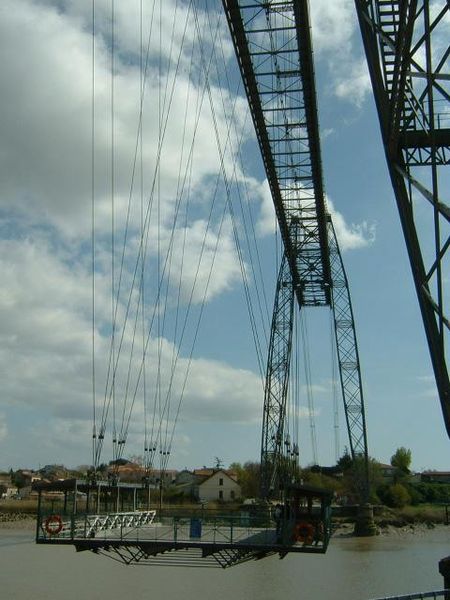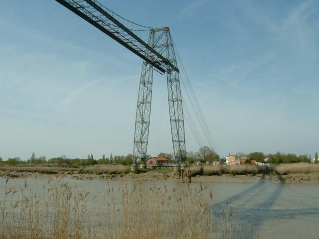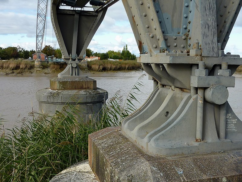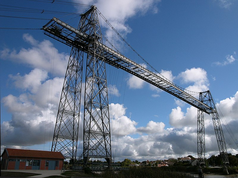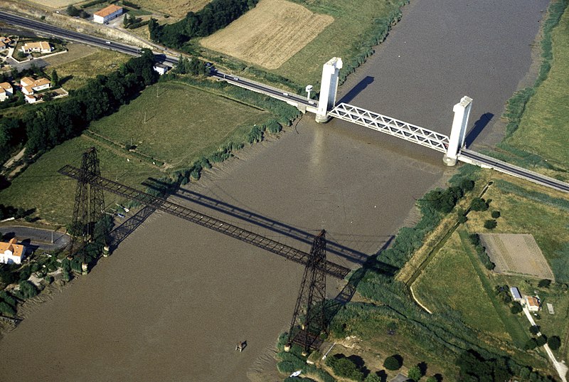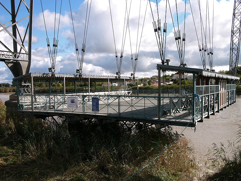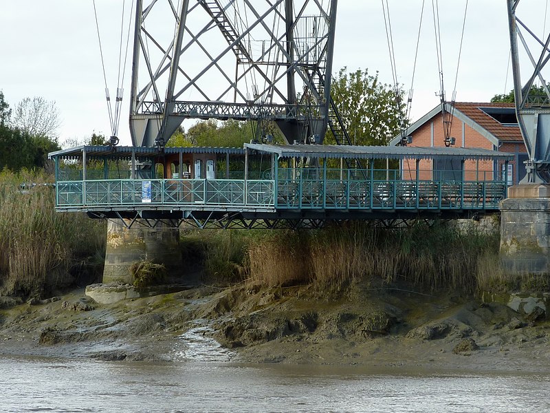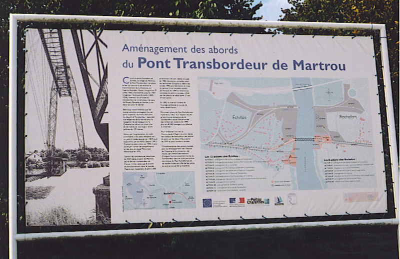 Le pont transbordeur du Martrou est le dernier pont transbordeur en fonctionnement en France et le seul témoin national de ce type d'ouvrage, les autres ayant été détruits. Conçu et réalisé par l'ingénieur Ferdinand Arnodin entre mars 1898 et juillet 1900, il relie Rochefort et Échillais en Charente-Maritime et a été inauguré le 29 juillet 1900. L'ouvrage repose sur huit piles en maçonnerie et quatre pylônes métalliques disposés deux par deux de chaque rive, hauts de 66,25 mètres. La travée entre pylônes mesure 139,75 mètres ; le tablier, long de 175,50 mètres, culmine à 50 mètres au‑dessus des plus hautes eaux. Les piles sont ancrées à 19,5 mètres de profondeur côté Rochefort et à 8,5 mètres côté Échillais ; l'espace entre piles est de 129 mètres et l'espace quai à quai de 150 mètres. Une nacelle suspendue permet la traversée de la Charente sans gêner la navigation des cargos desservant les ports locaux. Elle se déplace sur deux rails solidaires du tablier, suspendue par des câbles croisés et entraînée par un câble enroulé sur un treuil installé dans la machinerie côté Rochefort. L'énergie du treuil est fournie par un moteur électrique ; à l'origine la traction était assurée par un moteur à vapeur jusqu'en 1927. Conçu pour remplacer un bac devenu insuffisant, l'ouvrage a coûté 586 500 francs de l'époque. À l'ouverture, la nacelle pouvait transporter par traversée neuf voitures à cheval à deux attelages et cinquante piétons, ou deux cents piétons seuls ; sa charge nominale était alors de 14 tonnes et la traversée durait 75 secondes hors embarquement. En 1912, Lucien Deneau passa sous le tablier à bord de son avion. Des travaux de consolidation menés en 1933–1934 par l'entreprise Fives‑Lille‑Cail ont remplacé et modifié des poutres du tablier et porté la capacité de la nacelle à 16 tonnes. Après la Seconde Guerre mondiale, de nouvelles consolidations ont été réalisées, mais l'accroissement du trafic routier allongeait les temps d'attente. Un pont à tablier levant a été construit en aval en 1967, rendant l'usage du transbordeur moins adapté, et un projet de démolition est envisagé en 1975. Classé monument historique le 30 avril 1976, le pont échappe à la démolition. Entre 1980 et 1994, grâce à des financements de la Communauté économique européenne, l'ouvrage a été réhabilité pour un montant de 7 millions de francs : remplacement d'éléments métalliques, rénovation du platelage de la nacelle, contrôle de l'ossature et de la câblerie, et mise en peinture. Réinauguré, il est depuis exploité principalement à des fins touristiques et permet de nouveau le passage des véhicules non immatriculés, des vélos, des cyclomoteurs et des piétons. Le pont levant en aval a été remplacé par le viaduc de Martrou inauguré en 1991 ; le pont levant a été détruit quelques mois plus tard, ne laissant que la base des piles en béton armé. De 2016 à 2020, une nouvelle restauration a remplacé le tablier à âmes pleines datant de 1933 par un tablier à treillis conforme à l'origine ; les traversées ont été interrompues pendant les travaux et la réouverture a été programmée pour l'anniversaire des 120 ans. Le transbordeur a servi de décor à la scène inaugurale du film Les Demoiselles de Rochefort de Jacques Demy en 1966 ; Demy avait envisagé de le faire peindre en rose, proposition refusée par les habitants. Il apparaît également dans le téléfilm La boule noire (2014) de Denis Malleval. Des vues illustrent le pont depuis les rives nord et sud, la nacelle en translation au‑dessus du fleuve, le local machinerie, les piles de fondation et les massifs d'ancrage qui assurent l'équilibre de l'ouvrage.
