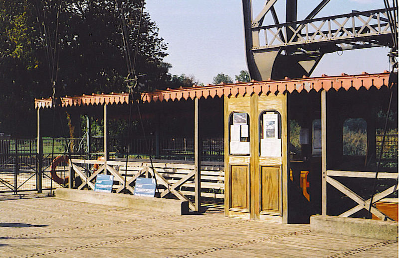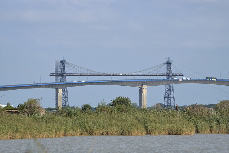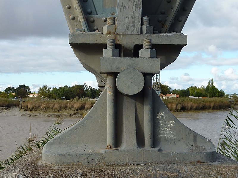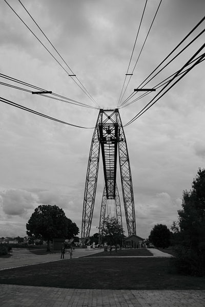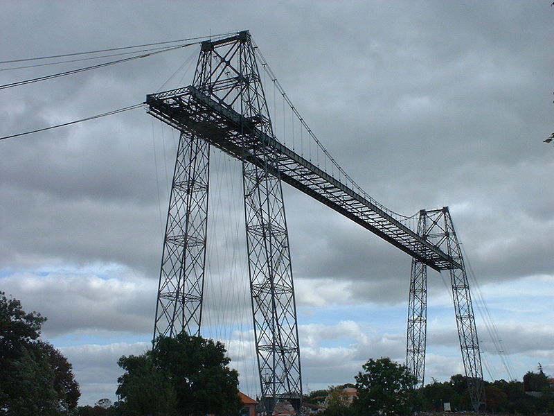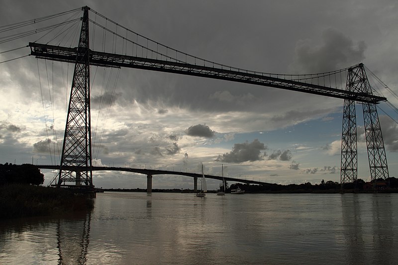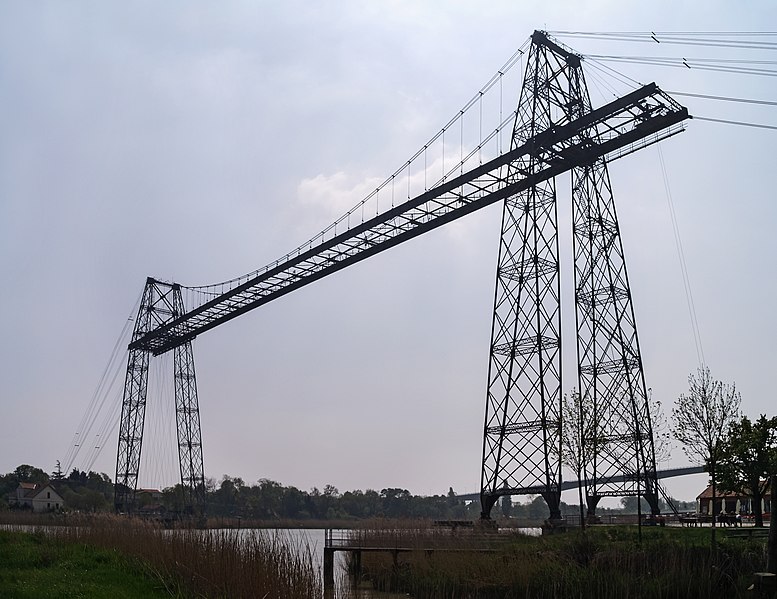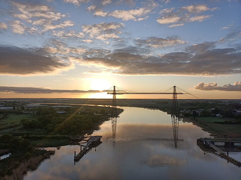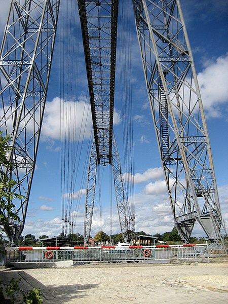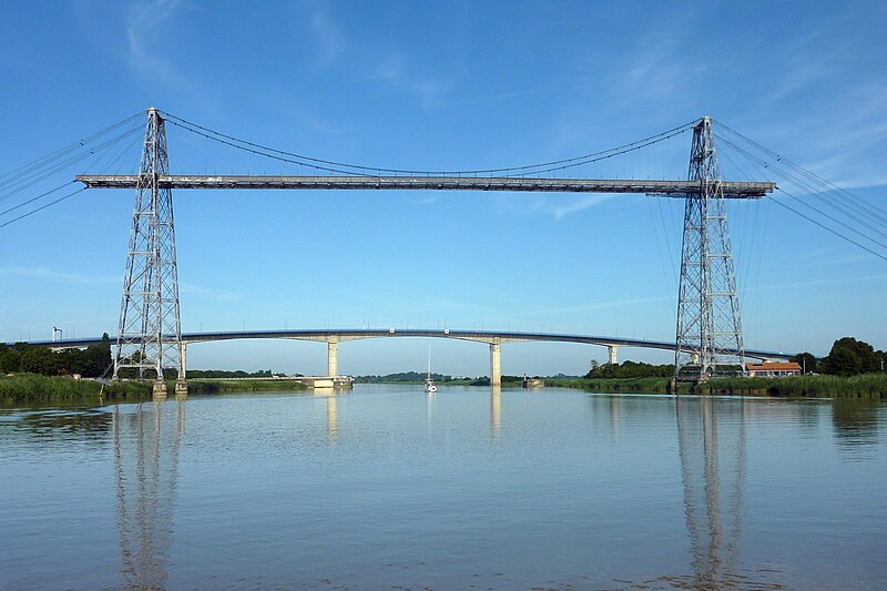 Le pont transbordeur du Martrou est le dernier pont transbordeur en fonctionnement en France et le seul témoin national de ce type d'ouvrage, les autres ayant été détruits. Conçu et réalisé par l'ingénieur Ferdinand Arnodin entre mars 1898 et juillet 1900, il relie Rochefort et Échillais en Charente-Maritime et a été inauguré le 29 juillet 1900. L'ouvrage repose sur huit piles en maçonnerie et quatre pylônes métalliques disposés deux par deux de chaque rive, hauts de 66,25 mètres. La travée entre pylônes mesure 139,75 mètres ; le tablier, long de 175,50 mètres, culmine à 50 mètres au‑dessus des plus hautes eaux. Les piles sont ancrées à 19,5 mètres de profondeur côté Rochefort et à 8,5 mètres côté Échillais ; l'espace entre piles est de 129 mètres et l'espace quai à quai de 150 mètres. Une nacelle suspendue permet la traversée de la Charente sans gêner la navigation des cargos desservant les ports locaux. Elle se déplace sur deux rails solidaires du tablier, suspendue par des câbles croisés et entraînée par un câble enroulé sur un treuil installé dans la machinerie côté Rochefort. L'énergie du treuil est fournie par un moteur électrique ; à l'origine la traction était assurée par un moteur à vapeur jusqu'en 1927. Conçu pour remplacer un bac devenu insuffisant, l'ouvrage a coûté 586 500 francs de l'époque. À l'ouverture, la nacelle pouvait transporter par traversée neuf voitures à cheval à deux attelages et cinquante piétons, ou deux cents piétons seuls ; sa charge nominale était alors de 14 tonnes et la traversée durait 75 secondes hors embarquement. En 1912, Lucien Deneau passa sous le tablier à bord de son avion. Des travaux de consolidation menés en 1933–1934 par l'entreprise Fives‑Lille‑Cail ont remplacé et modifié des poutres du tablier et porté la capacité de la nacelle à 16 tonnes. Après la Seconde Guerre mondiale, de nouvelles consolidations ont été réalisées, mais l'accroissement du trafic routier allongeait les temps d'attente. Un pont à tablier levant a été construit en aval en 1967, rendant l'usage du transbordeur moins adapté, et un projet de démolition est envisagé en 1975. Classé monument historique le 30 avril 1976, le pont échappe à la démolition. Entre 1980 et 1994, grâce à des financements de la Communauté économique européenne, l'ouvrage a été réhabilité pour un montant de 7 millions de francs : remplacement d'éléments métalliques, rénovation du platelage de la nacelle, contrôle de l'ossature et de la câblerie, et mise en peinture. Réinauguré, il est depuis exploité principalement à des fins touristiques et permet de nouveau le passage des véhicules non immatriculés, des vélos, des cyclomoteurs et des piétons. Le pont levant en aval a été remplacé par le viaduc de Martrou inauguré en 1991 ; le pont levant a été détruit quelques mois plus tard, ne laissant que la base des piles en béton armé. De 2016 à 2020, une nouvelle restauration a remplacé le tablier à âmes pleines datant de 1933 par un tablier à treillis conforme à l'origine ; les traversées ont été interrompues pendant les travaux et la réouverture a été programmée pour l'anniversaire des 120 ans. Le transbordeur a servi de décor à la scène inaugurale du film Les Demoiselles de Rochefort de Jacques Demy en 1966 ; Demy avait envisagé de le faire peindre en rose, proposition refusée par les habitants. Il apparaît également dans le téléfilm La boule noire (2014) de Denis Malleval. Des vues illustrent le pont depuis les rives nord et sud, la nacelle en translation au‑dessus du fleuve, le local machinerie, les piles de fondation et les massifs d'ancrage qui assurent l'équilibre de l'ouvrage.