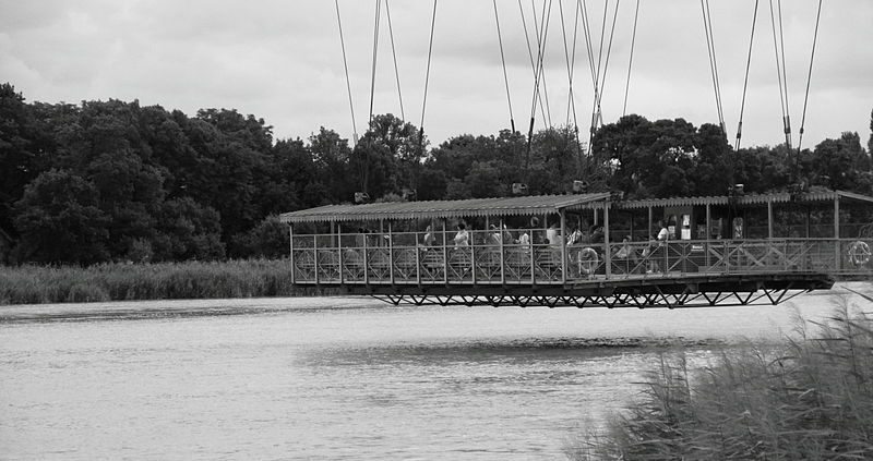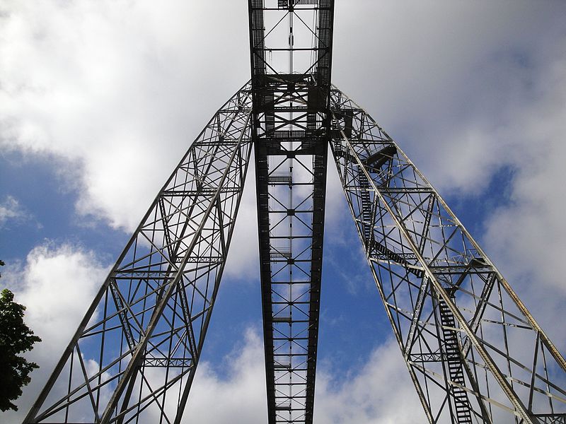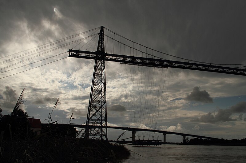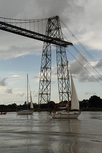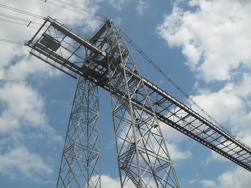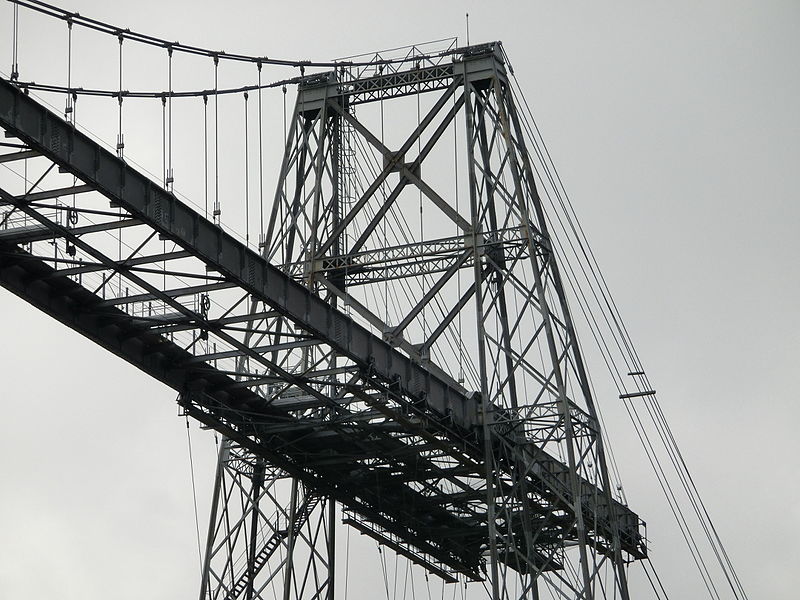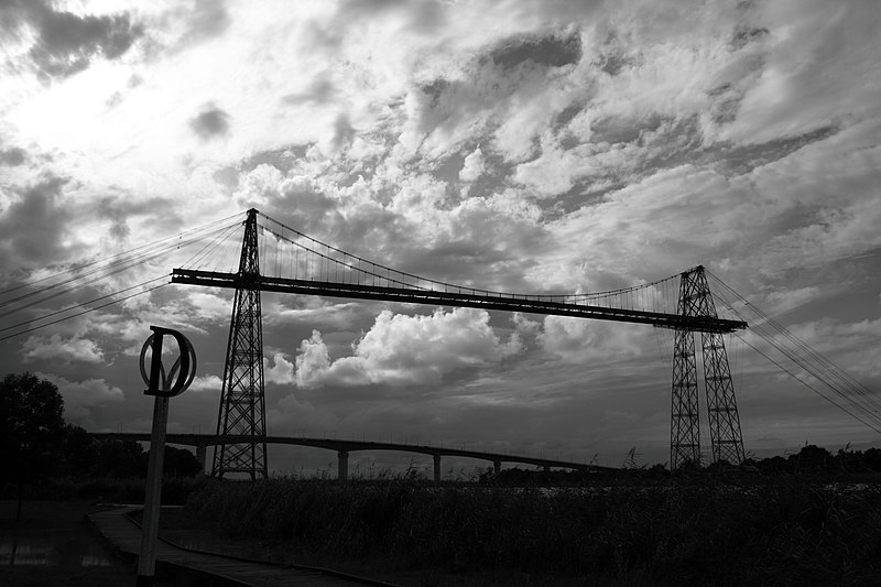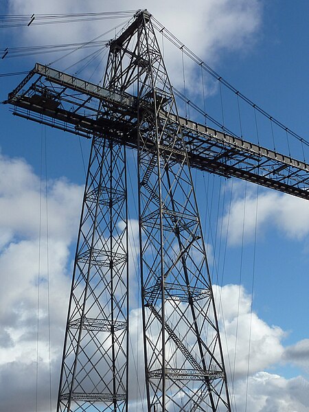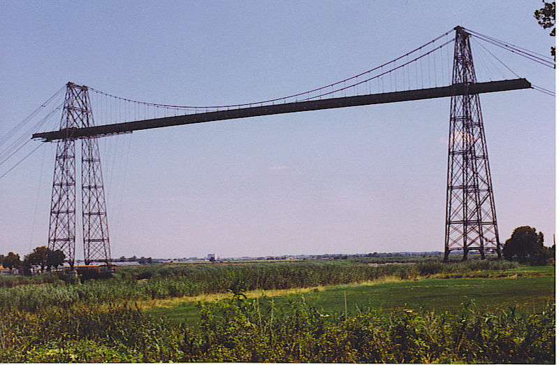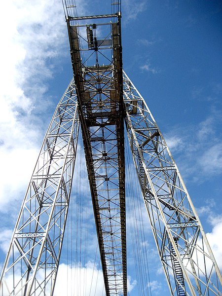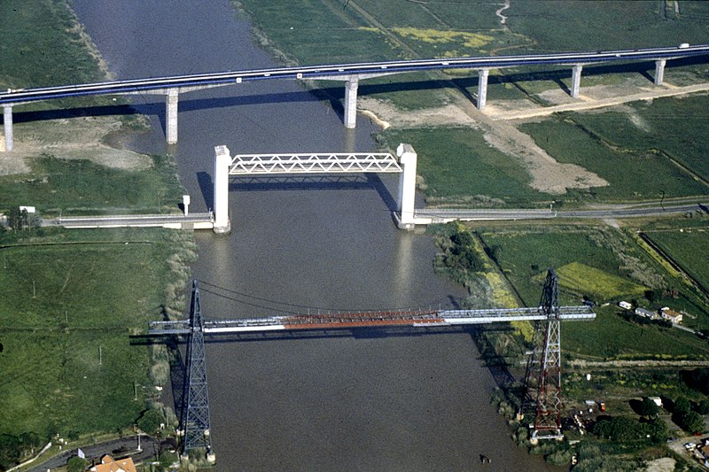 Le pont transbordeur du Martrou est le dernier pont transbordeur en fonctionnement en France et le seul témoin national de ce type d'ouvrage, les autres ayant été détruits. Conçu et réalisé par l'ingénieur Ferdinand Arnodin entre mars 1898 et juillet 1900, il relie Rochefort et Échillais en Charente-Maritime et a été inauguré le 29 juillet 1900. L'ouvrage repose sur huit piles en maçonnerie et quatre pylônes métalliques disposés deux par deux de chaque rive, hauts de 66,25 mètres. La travée entre pylônes mesure 139,75 mètres ; le tablier, long de 175,50 mètres, culmine à 50 mètres au‑dessus des plus hautes eaux. Les piles sont ancrées à 19,5 mètres de profondeur côté Rochefort et à 8,5 mètres côté Échillais ; l'espace entre piles est de 129 mètres et l'espace quai à quai de 150 mètres. Une nacelle suspendue permet la traversée de la Charente sans gêner la navigation des cargos desservant les ports locaux. Elle se déplace sur deux rails solidaires du tablier, suspendue par des câbles croisés et entraînée par un câble enroulé sur un treuil installé dans la machinerie côté Rochefort. L'énergie du treuil est fournie par un moteur électrique ; à l'origine la traction était assurée par un moteur à vapeur jusqu'en 1927. Conçu pour remplacer un bac devenu insuffisant, l'ouvrage a coûté 586 500 francs de l'époque. À l'ouverture, la nacelle pouvait transporter par traversée neuf voitures à cheval à deux attelages et cinquante piétons, ou deux cents piétons seuls ; sa charge nominale était alors de 14 tonnes et la traversée durait 75 secondes hors embarquement. En 1912, Lucien Deneau passa sous le tablier à bord de son avion. Des travaux de consolidation menés en 1933–1934 par l'entreprise Fives‑Lille‑Cail ont remplacé et modifié des poutres du tablier et porté la capacité de la nacelle à 16 tonnes. Après la Seconde Guerre mondiale, de nouvelles consolidations ont été réalisées, mais l'accroissement du trafic routier allongeait les temps d'attente. Un pont à tablier levant a été construit en aval en 1967, rendant l'usage du transbordeur moins adapté, et un projet de démolition est envisagé en 1975. Classé monument historique le 30 avril 1976, le pont échappe à la démolition. Entre 1980 et 1994, grâce à des financements de la Communauté économique européenne, l'ouvrage a été réhabilité pour un montant de 7 millions de francs : remplacement d'éléments métalliques, rénovation du platelage de la nacelle, contrôle de l'ossature et de la câblerie, et mise en peinture. Réinauguré, il est depuis exploité principalement à des fins touristiques et permet de nouveau le passage des véhicules non immatriculés, des vélos, des cyclomoteurs et des piétons. Le pont levant en aval a été remplacé par le viaduc de Martrou inauguré en 1991 ; le pont levant a été détruit quelques mois plus tard, ne laissant que la base des piles en béton armé. De 2016 à 2020, une nouvelle restauration a remplacé le tablier à âmes pleines datant de 1933 par un tablier à treillis conforme à l'origine ; les traversées ont été interrompues pendant les travaux et la réouverture a été programmée pour l'anniversaire des 120 ans. Le transbordeur a servi de décor à la scène inaugurale du film Les Demoiselles de Rochefort de Jacques Demy en 1966 ; Demy avait envisagé de le faire peindre en rose, proposition refusée par les habitants. Il apparaît également dans le téléfilm La boule noire (2014) de Denis Malleval. Des vues illustrent le pont depuis les rives nord et sud, la nacelle en translation au‑dessus du fleuve, le local machinerie, les piles de fondation et les massifs d'ancrage qui assurent l'équilibre de l'ouvrage.