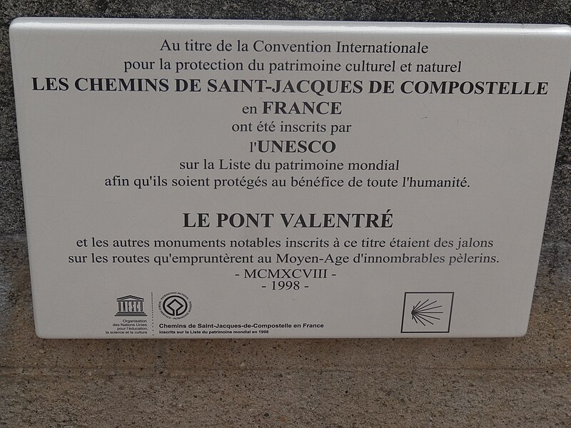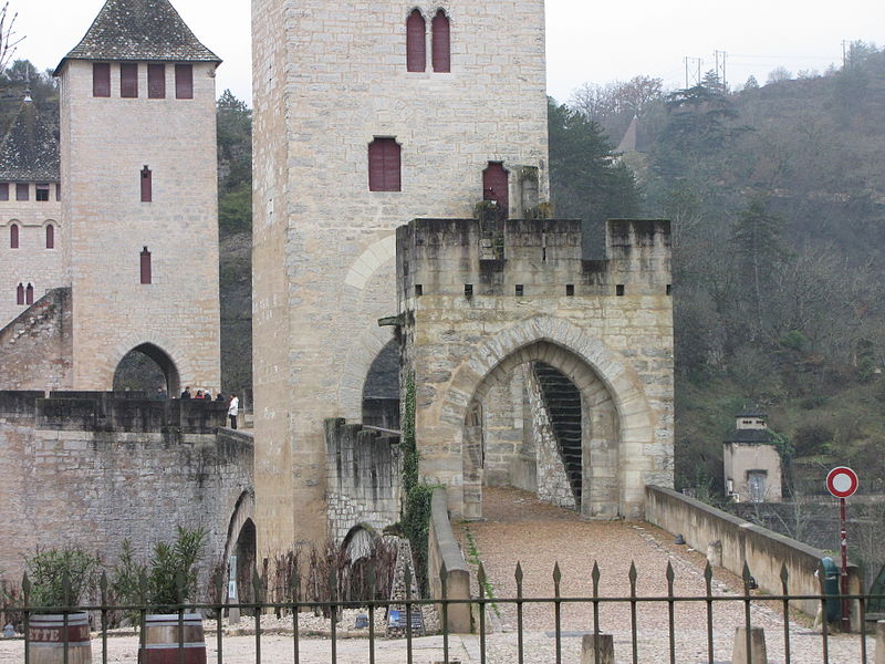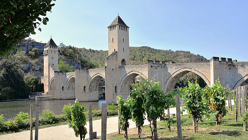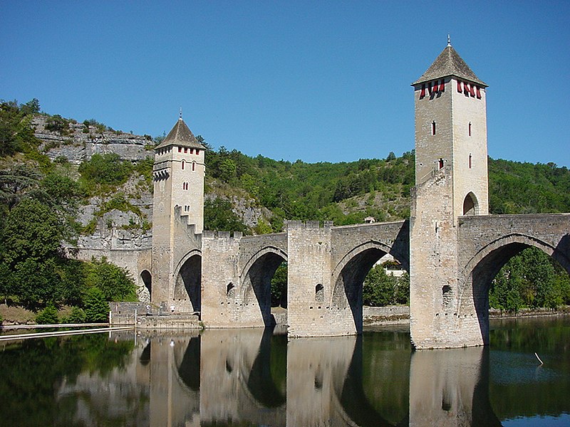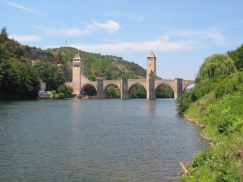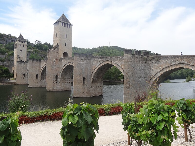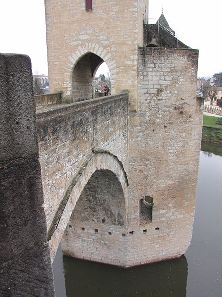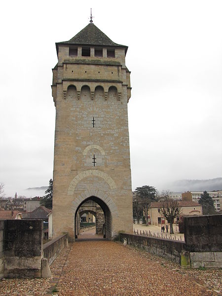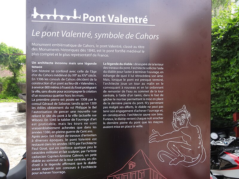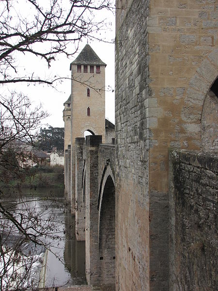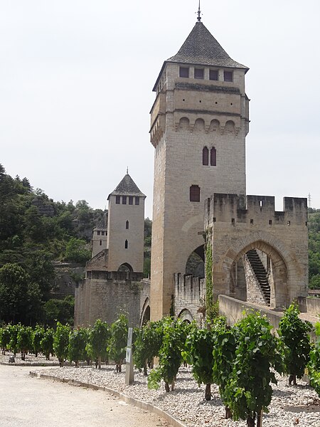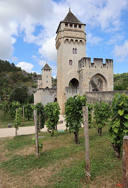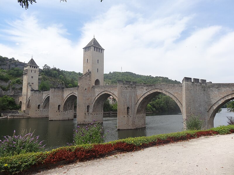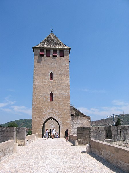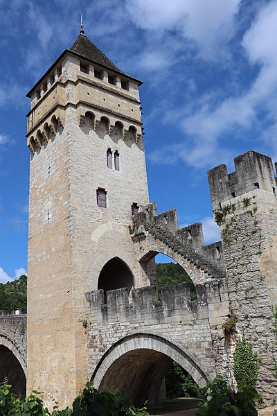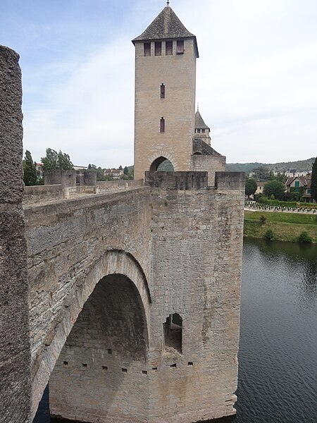 Le pont Valentré, appelé en occitan pont de Balandras et surnommé pont du Diable, est un pont fortifié du XIVe siècle qui enjambe le Lot à l'ouest de Cahors. Exemplaire de l'architecture militaire médiévale, il est caractérisé par ses six arches ogivales précédées de becs aigus et par ses trois tours carrées crénelées dotées de mâchicoulis. De forme en dos-d'âne, il mesure 138 mètres de longueur ; chaque grande arche s'ouvre sur 16,50 mètres et les tours dominent l'eau sur 40 mètres. Construit à l'origine pour défendre la ville et modifier l'axe commercial vers un tracé est-ouest, il était autrefois flanqué de deux barbacanes, dont seule celle du côté est a été conservée, et sa protection spirituelle était assurée par une chapelle dédiée à la Vierge dans le châtelet occidental. Les travaux, décidés par les consuls, ont débuté en 1308 et se sont achevés en 1378 ; la restauration conduite en 1879 a toutefois sensiblement modifié son aspect initial. Classé parmi les monuments historiques dès 1840, il figure depuis 1998 au patrimoine mondial de l'UNESCO au titre des chemins de Saint-Jacques-de-Compostelle en France et fait depuis 2012 partie du réseau des ponts remarquables du sud de la France. Le pont est aujourd'hui réservé à la circulation piétonne et se situe sur la Via Podiensis ainsi que sur le sentier de grande randonnée GR 36. L'origine du nom Valentré reste incertaine : il pourrait dériver de balandra, désignant soit une salamandre, soit une barque à fond plat utilisée avant la construction du pont. La popularité de la longue construction a engendré la légende du maître d'œuvre ayant conclu un pacte avec le Diable ; selon ce récit, Satan fut trompé par une demande absurde et, pour se venger, envoya chaque nuit un diablotin desceller la dernière pierre de la tour centrale, d'où la durée exceptionnelle du chantier. Lors de la restauration de 1879, l'architecte Paul Gout fit apposer dans l'emplacement vide une pierre sculptée à l'effigie d'un diablotin, œuvre du sculpteur Calmon. Le musée de Cahors Henri-Martin conserve de nombreuses représentations du pont — armoiries, dessins, gravures, peintures et photographies d'artistes variés — ainsi qu'une cage découverte au pied de l'ouvrage à la fin du XIXe siècle. Le pont a été reproduit sur plusieurs timbres, émis notamment en 1955 (réédité en 1957), en 2008 pour le 700e anniversaire du début de sa construction, et par la Poste andorrane en 1974. Il est également présent dans des collections miniatures et dans de nombreuses publications consacrées au patrimoine local. Le passage sur le pont est gratuit : le comptage fixe a enregistré 231 500 visiteurs en 2017 et 250 000 visiteurs en 2020.