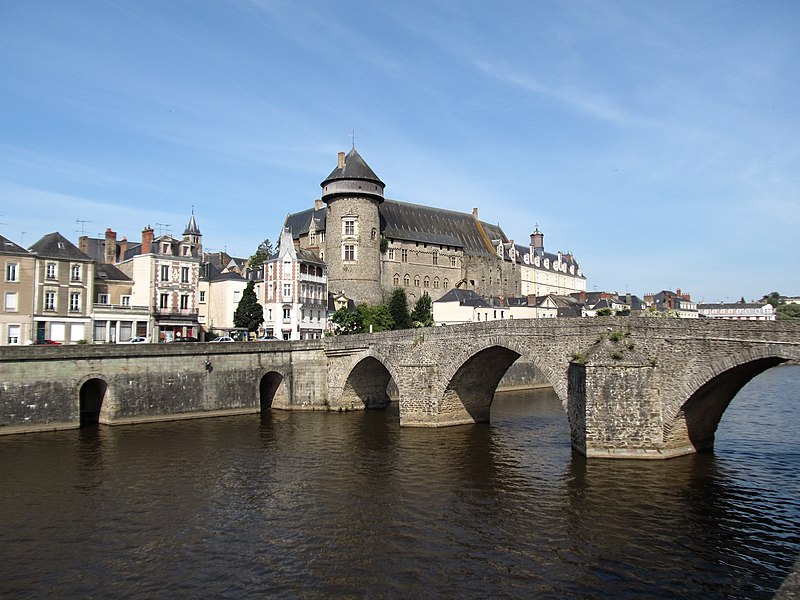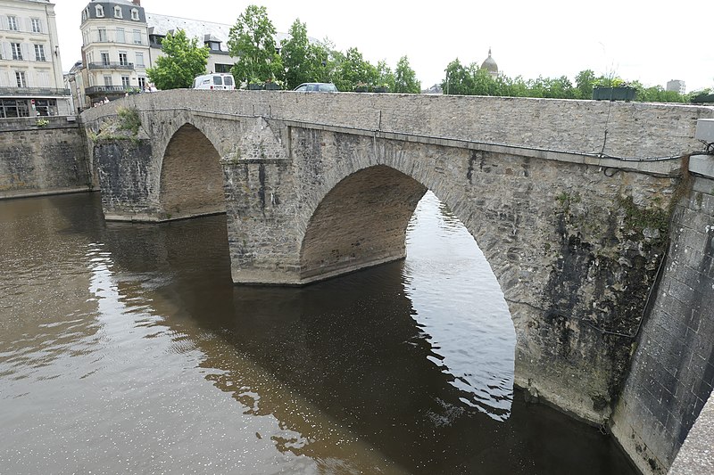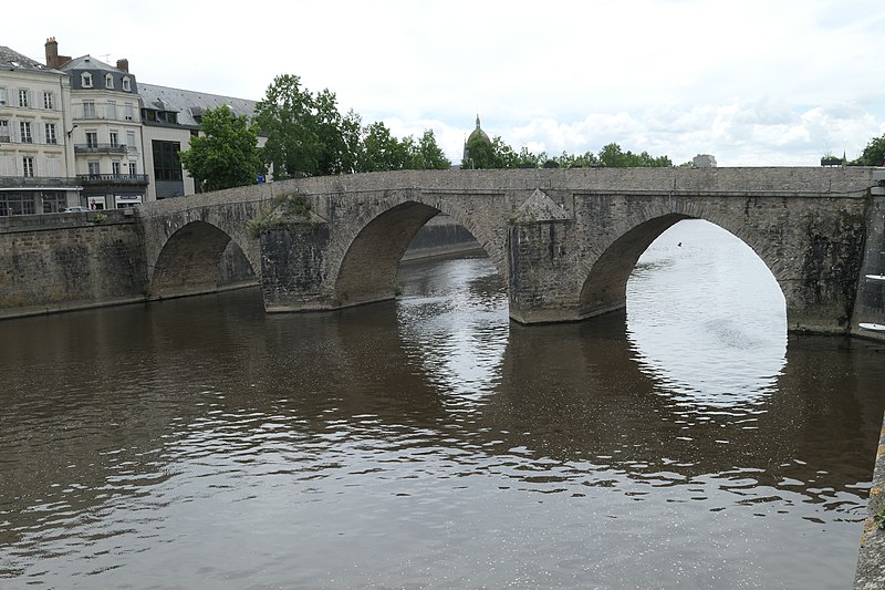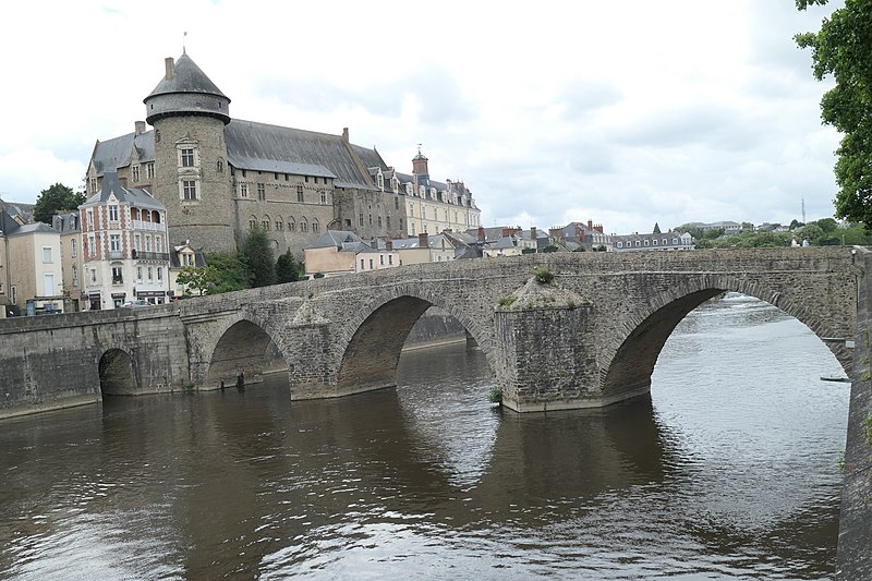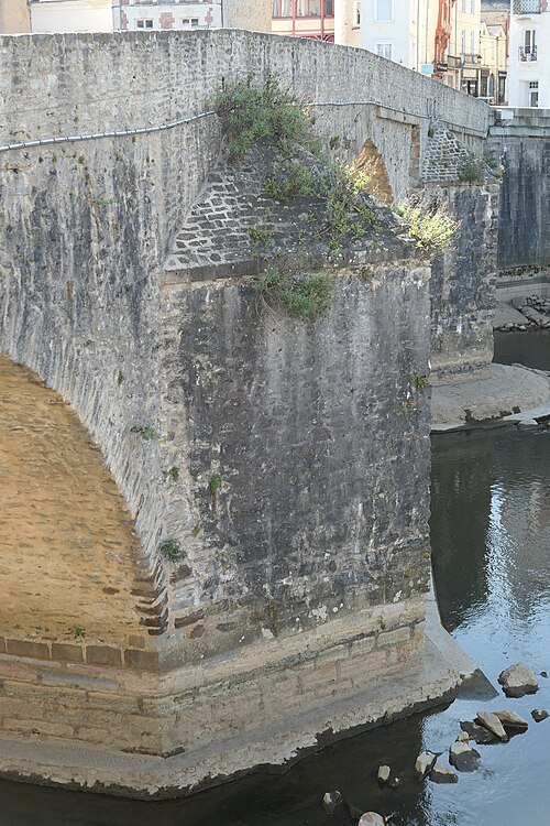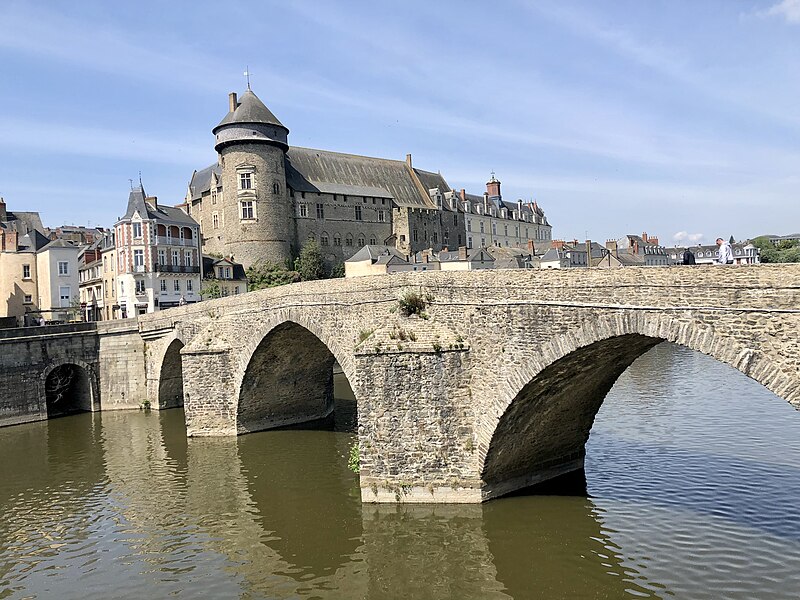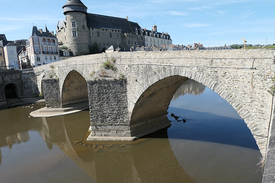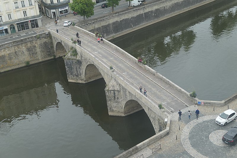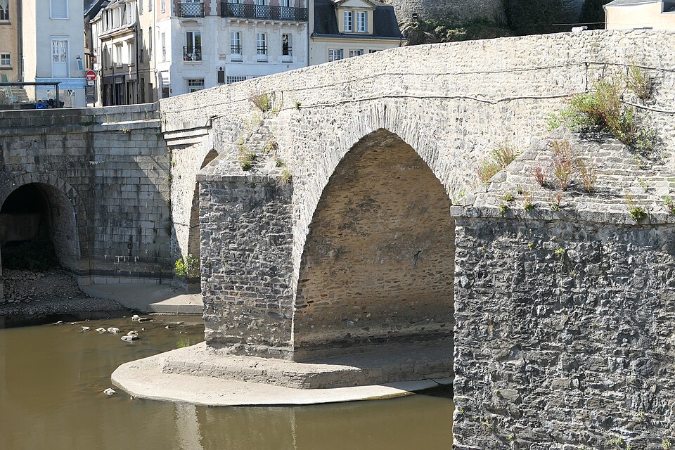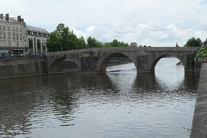 Le Vieux pont sur la Mayenne, à Laval, a été construit au XIIIe siècle près d'un ancien gué et s'est implanté sur la voie romaine entre Le Mans et Corseul. Il commandait l'accès à la Bretagne et jouait un rôle stratégique et commercial important. Sa construction avait été rendue nécessaire après l'édification d'un barrage pour alimenter des moulins, qui avait élevé le niveau de la rivière et submergé le gué. Des travaux de réfection ont eu lieu en 1528, puis à d'autres reprises. À l'origine, l'ouvrage comportait une porte fortifiée, dite Porte du pont Saint-Julien ou Porte du Pont de Mayenne, un pont-levis et des maisons à colombages bâties de part et d'autre de la voie, ce qui rendait la traversée très étroite. La porte et la plupart de ces maisons furent détruites en 1779. La construction d'un second pont fut envisagée à la même époque et aboutit au début du XIXe siècle avec l'édification du Pont Aristide-Briand (ou « Pont Neuf »), au nord du Vieux pont, qui permit de désengorger la vieille-ville. Au XIXe siècle, lors de l'aménagement des quais le long de la Mayenne, le pont fut à nouveau remanié : les dernières maisons médiévales disparurent et sa quatrième arche se retrouva intégrée au quai ouest. Le 6 août 1944, pendant la Libération de Laval, le pont fut partiellement dynamité par les Allemands, puis restauré par la suite. Le Vieux pont est inscrit au titre des Monuments historiques depuis 1926. Il relie la rue du Pont de Mayenne, rive gauche, à la Grande rue, rive droite. Construit en moellons de schiste, il présente trois arches en arc brisé reposant sur des piles à bec.