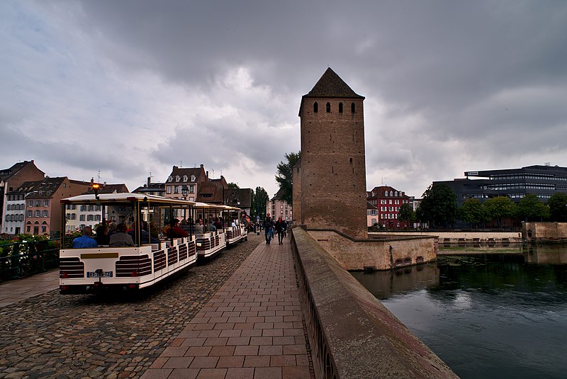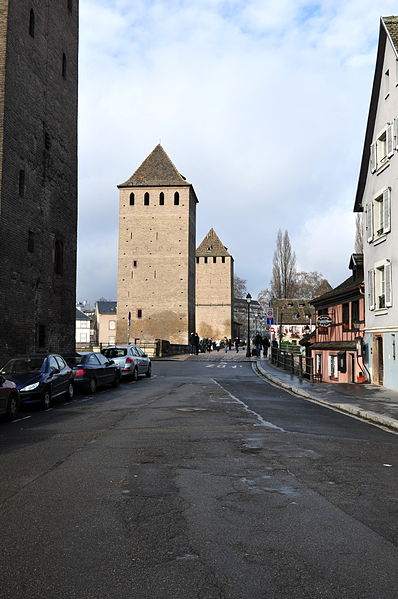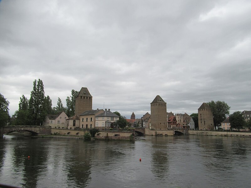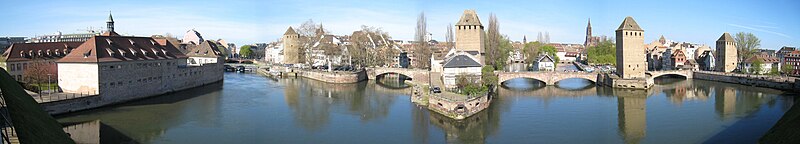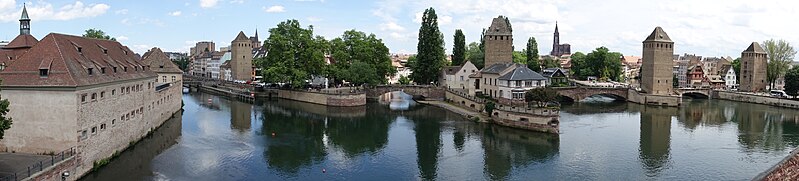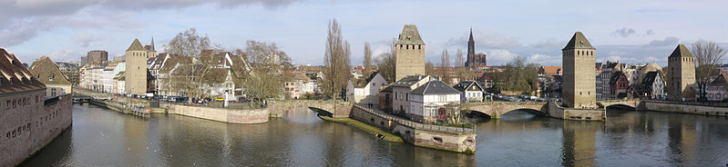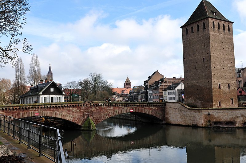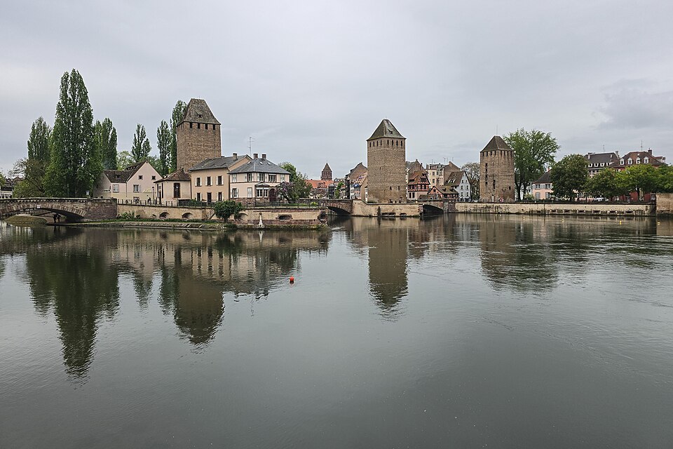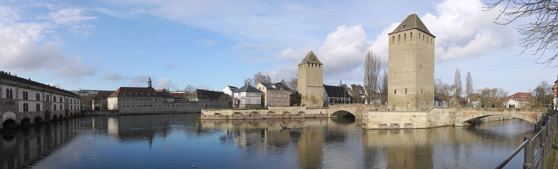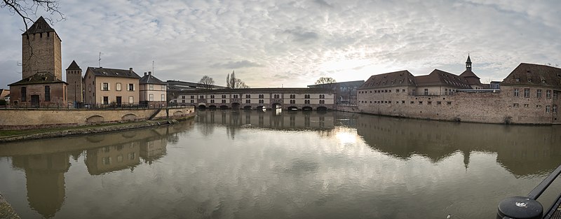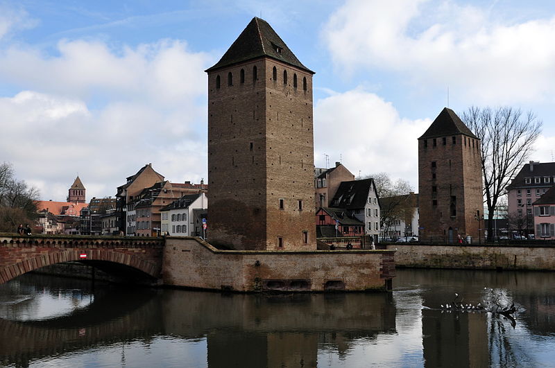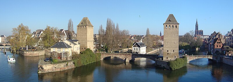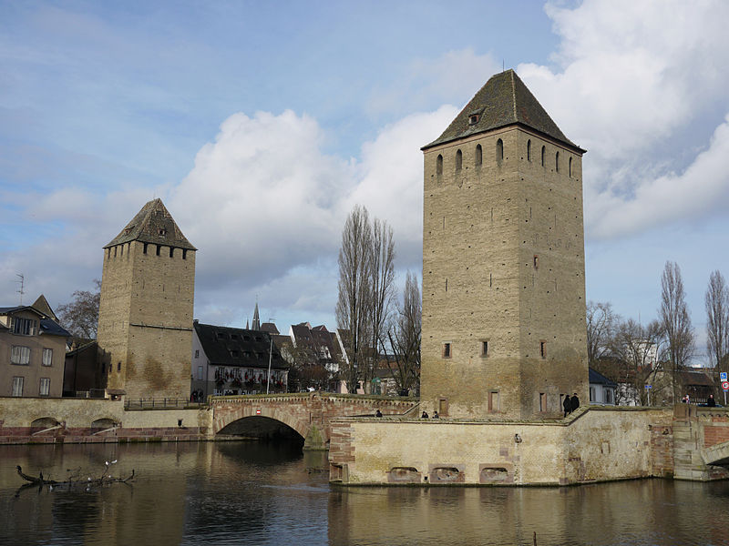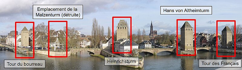 Les Ponts couverts de Strasbourg forment un ensemble de trois ponts en arc franchissant l'Ill au cœur du quartier de la Petite France ; ils ont conservé ce nom alors qu'ils ne sont plus couverts. À l'origine, entre le XIIIe et le XVIIIe siècle, quatre ponts occupaient cet emplacement ; ils furent édifiés principalement pour défendre la ville en fermant l'accès par l'Ill. Entre 1230 et 1250, quatre ponts furent construits par les bourgeois de Strasbourg, et en 1332 les piles en bois furent remplacées par des piles en maçonnerie. À partir du XIVe siècle, ces ponts se succédaient sous forme de galeries couvertes avec, côté extérieur, des parois en bois percées de meurtrières pour l'artillerie ; au XVIe siècle Daniel Specklin améliora le dispositif défensif. Vers 1570 des herses en fer furent installées pour condamner l'accès depuis la rivière. Entre 1681 et 1688 Jacques Tarade construisit, d'après les plans de Vauban, le barrage dit barrage Vauban une centaine de mètres en amont ; adapté aux techniques militaires de l'époque, il fut utilisé en 1870 pour inonder la zone située en amont. En 1784 les toitures des galeries furent retirées, puis en 1865 les ponts en bois furent démolis et reconstruits entièrement en pierre dans leur configuration actuelle. La tour dite Malzenturm fut rasée en 1869 à la suite d'un incendie en 1863 ; les quatre autres tours doivent leur conservation à leur emploi comme prisons jusqu'à l'ouverture de la maison d'arrêt de la rue du Fil en 1823. Les cinq tours primitives, disposées du nord au sud, portent les noms Stöckelsturm ou Henkersturm (Tour du Bourreau), Malzenturm (détruite), Heinrichsturm (Tour de l'Éclusier ou Tour Henri), Hans von Altheimturm (Tour Jean de Altheim) et Französische Turm (Tour des Français). La Stöckelsturm, située un peu à l'écart près du pont de l'Abattoir, ne conserve pas de structure interne en bois antérieure au début du XVIIIe siècle ; son réaménagement date de 1746 et la prison y ferma en 1823. La Heinrichsturm est la seule à conserver des bois d'œuvre primitifs dont une datation dendrochronologique situe l'origine en 1229 ; une première cellule fut installée au troisième étage en 1351 et la charpente de sa toiture est datée de 1408 ; en 1529 trois nouvelles cellules furent créées au second étage. La Hans von Altheimturm fut entièrement reconstruite dans ses structures internes en bois en 1696 à la suite d'un incendie et perdit ses fonctions militaires au profit de celles d'incarcération dès 1686 lors de la construction du barrage-écluse. La charpente de la Französische Turm est similaire à celle des autres tours conservées, sans datation précise fournie ici. Les trois ponts actuels sont des ponts en arc : le « pont couvert I » franchit le canal de navigation de l'Ill par une arche, le « pont couvert II » comprend deux arches franchissant le canal du Moulin dit Spitzmühle sous l'arche rive gauche et le canal Dinsenmühle sous l'arche rive droite, et le « pont couvert III » franchit le canal du Moulin dit Zornmühle par une arche. Les tours en briques mesurent 8,60 mètres de côté et environ 19 mètres de hauteur, comportent cinq niveaux séparés par des planchers et s'ouvrent par des portes en grès à l'arrière ; l'accès se faisait au premier niveau pour la tour numéro 4 et au second niveau pour les tours 1, 3 et 5. À des fins militaires, chaque tour était percée, sur les trois côtés exposés, de six à neuf meurtrières par étage réparties sur trois niveaux, certaines inclinées pour mieux orienter les tirs, et le sommet comportait des ouvertures à la manière d'un crénelage. Sur les parois des cellules, les détenus ont gravé environ 500 graffitis et une vingtaine de millésimes datés entre 1530 et 1595. Après la fermeture des prisons en 1823, les tours connurent diverses affectations temporaires et ne furent restaurées pour leurs façades qu'une fois, entre 1977 et 1981. Les quatre tours conservées sont classées aux monuments historiques depuis 1928.