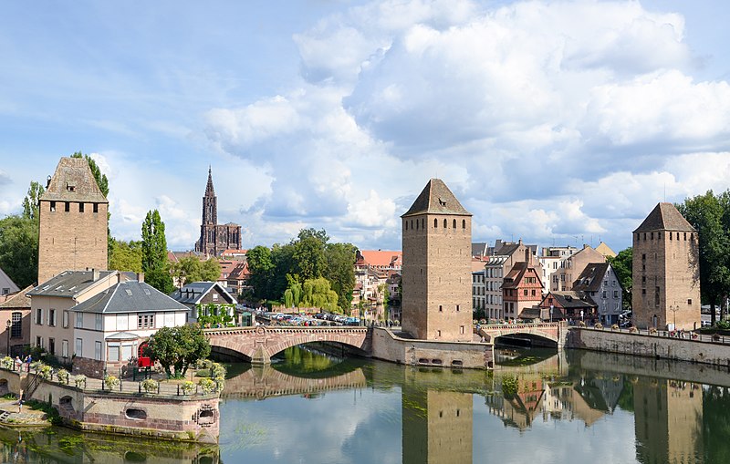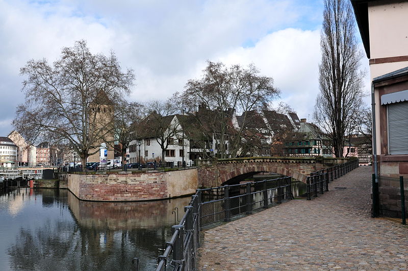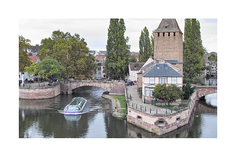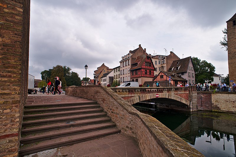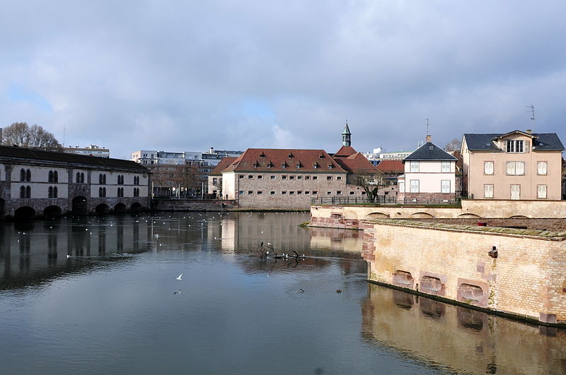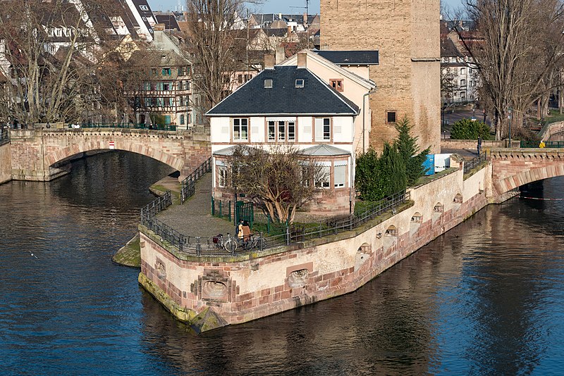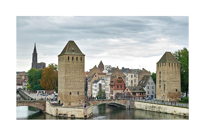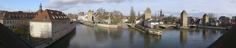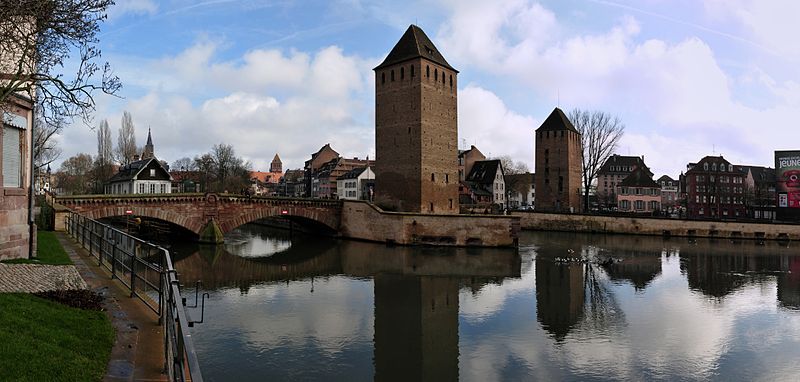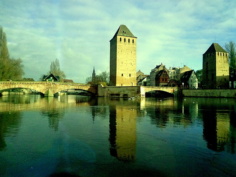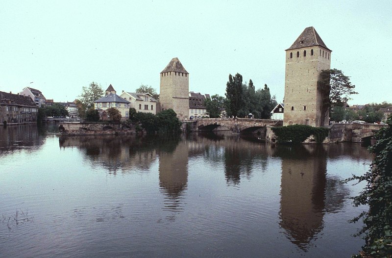 Les Ponts couverts de Strasbourg forment un ensemble de trois ponts en arc franchissant l'Ill au cœur du quartier de la Petite France ; ils ont conservé ce nom alors qu'ils ne sont plus couverts. À l'origine, entre le XIIIe et le XVIIIe siècle, quatre ponts occupaient cet emplacement ; ils furent édifiés principalement pour défendre la ville en fermant l'accès par l'Ill. Entre 1230 et 1250, quatre ponts furent construits par les bourgeois de Strasbourg, et en 1332 les piles en bois furent remplacées par des piles en maçonnerie. À partir du XIVe siècle, ces ponts se succédaient sous forme de galeries couvertes avec, côté extérieur, des parois en bois percées de meurtrières pour l'artillerie ; au XVIe siècle Daniel Specklin améliora le dispositif défensif. Vers 1570 des herses en fer furent installées pour condamner l'accès depuis la rivière. Entre 1681 et 1688 Jacques Tarade construisit, d'après les plans de Vauban, le barrage dit barrage Vauban une centaine de mètres en amont ; adapté aux techniques militaires de l'époque, il fut utilisé en 1870 pour inonder la zone située en amont. En 1784 les toitures des galeries furent retirées, puis en 1865 les ponts en bois furent démolis et reconstruits entièrement en pierre dans leur configuration actuelle. La tour dite Malzenturm fut rasée en 1869 à la suite d'un incendie en 1863 ; les quatre autres tours doivent leur conservation à leur emploi comme prisons jusqu'à l'ouverture de la maison d'arrêt de la rue du Fil en 1823. Les cinq tours primitives, disposées du nord au sud, portent les noms Stöckelsturm ou Henkersturm (Tour du Bourreau), Malzenturm (détruite), Heinrichsturm (Tour de l'Éclusier ou Tour Henri), Hans von Altheimturm (Tour Jean de Altheim) et Französische Turm (Tour des Français). La Stöckelsturm, située un peu à l'écart près du pont de l'Abattoir, ne conserve pas de structure interne en bois antérieure au début du XVIIIe siècle ; son réaménagement date de 1746 et la prison y ferma en 1823. La Heinrichsturm est la seule à conserver des bois d'œuvre primitifs dont une datation dendrochronologique situe l'origine en 1229 ; une première cellule fut installée au troisième étage en 1351 et la charpente de sa toiture est datée de 1408 ; en 1529 trois nouvelles cellules furent créées au second étage. La Hans von Altheimturm fut entièrement reconstruite dans ses structures internes en bois en 1696 à la suite d'un incendie et perdit ses fonctions militaires au profit de celles d'incarcération dès 1686 lors de la construction du barrage-écluse. La charpente de la Französische Turm est similaire à celle des autres tours conservées, sans datation précise fournie ici. Les trois ponts actuels sont des ponts en arc : le « pont couvert I » franchit le canal de navigation de l'Ill par une arche, le « pont couvert II » comprend deux arches franchissant le canal du Moulin dit Spitzmühle sous l'arche rive gauche et le canal Dinsenmühle sous l'arche rive droite, et le « pont couvert III » franchit le canal du Moulin dit Zornmühle par une arche. Les tours en briques mesurent 8,60 mètres de côté et environ 19 mètres de hauteur, comportent cinq niveaux séparés par des planchers et s'ouvrent par des portes en grès à l'arrière ; l'accès se faisait au premier niveau pour la tour numéro 4 et au second niveau pour les tours 1, 3 et 5. À des fins militaires, chaque tour était percée, sur les trois côtés exposés, de six à neuf meurtrières par étage réparties sur trois niveaux, certaines inclinées pour mieux orienter les tirs, et le sommet comportait des ouvertures à la manière d'un crénelage. Sur les parois des cellules, les détenus ont gravé environ 500 graffitis et une vingtaine de millésimes datés entre 1530 et 1595. Après la fermeture des prisons en 1823, les tours connurent diverses affectations temporaires et ne furent restaurées pour leurs façades qu'une fois, entre 1977 et 1981. Les quatre tours conservées sont classées aux monuments historiques depuis 1928.