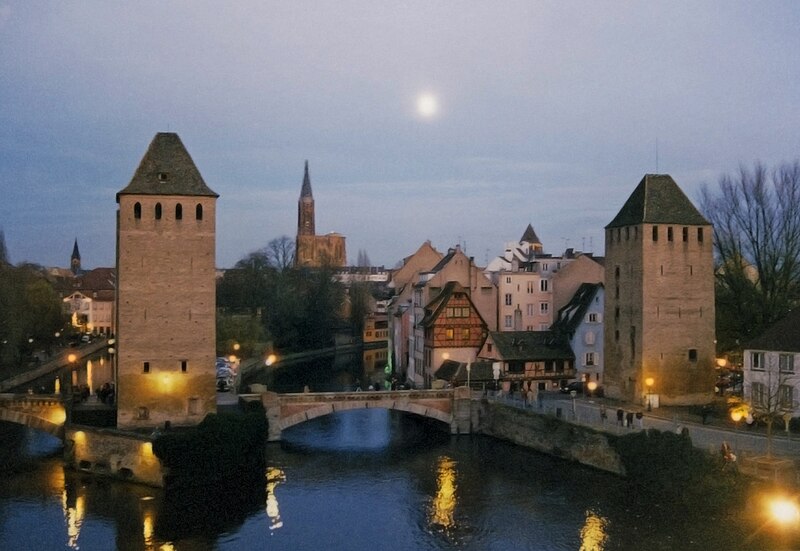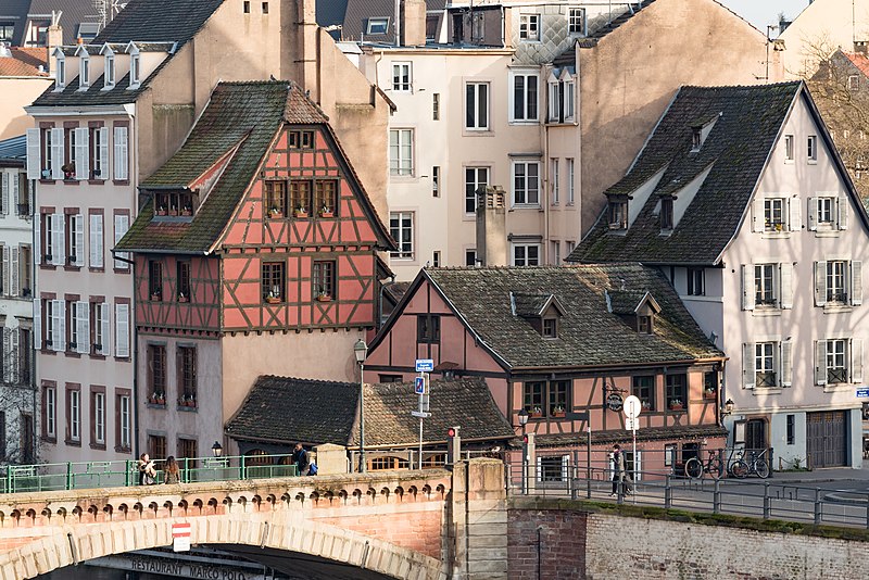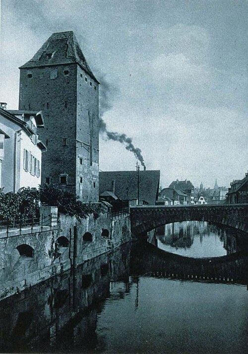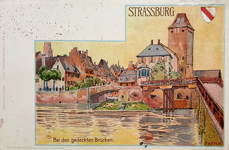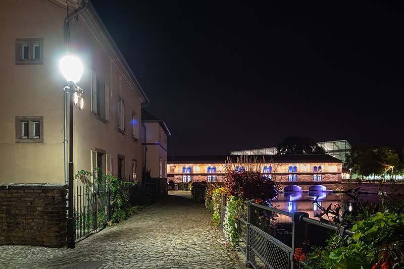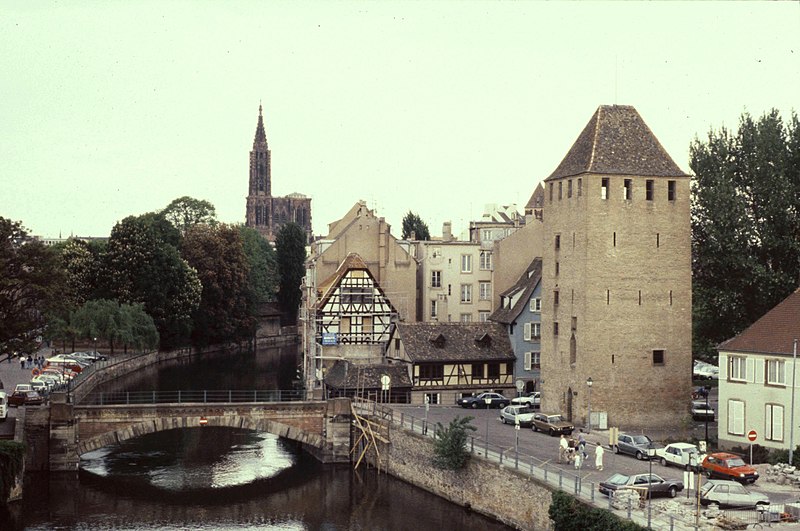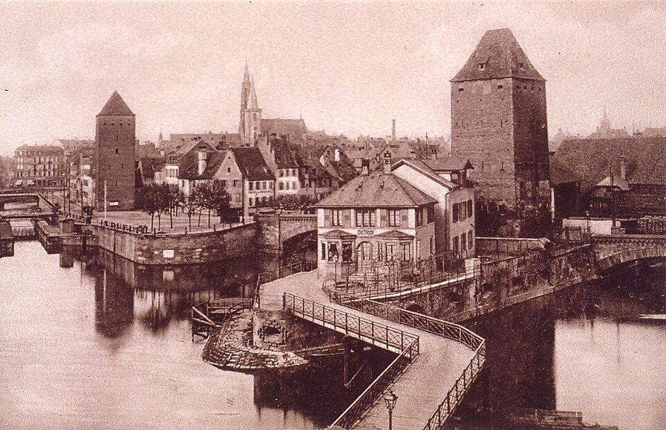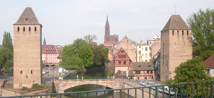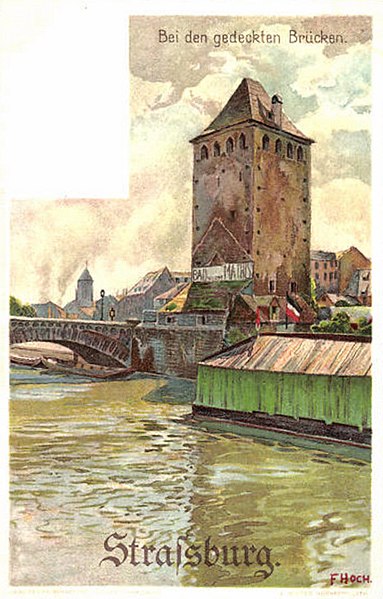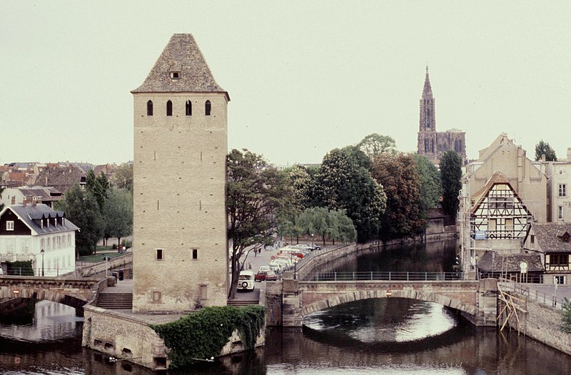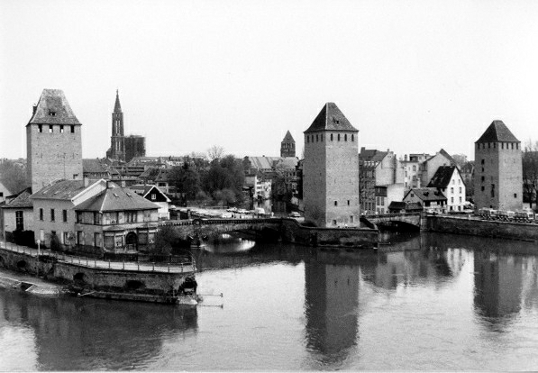 Les Ponts couverts de Strasbourg forment un ensemble de trois ponts en arc franchissant l'Ill au cœur du quartier de la Petite France ; ils ont conservé ce nom alors qu'ils ne sont plus couverts. À l'origine, entre le XIIIe et le XVIIIe siècle, quatre ponts occupaient cet emplacement ; ils furent édifiés principalement pour défendre la ville en fermant l'accès par l'Ill. Entre 1230 et 1250, quatre ponts furent construits par les bourgeois de Strasbourg, et en 1332 les piles en bois furent remplacées par des piles en maçonnerie. À partir du XIVe siècle, ces ponts se succédaient sous forme de galeries couvertes avec, côté extérieur, des parois en bois percées de meurtrières pour l'artillerie ; au XVIe siècle Daniel Specklin améliora le dispositif défensif. Vers 1570 des herses en fer furent installées pour condamner l'accès depuis la rivière. Entre 1681 et 1688 Jacques Tarade construisit, d'après les plans de Vauban, le barrage dit barrage Vauban une centaine de mètres en amont ; adapté aux techniques militaires de l'époque, il fut utilisé en 1870 pour inonder la zone située en amont. En 1784 les toitures des galeries furent retirées, puis en 1865 les ponts en bois furent démolis et reconstruits entièrement en pierre dans leur configuration actuelle. La tour dite Malzenturm fut rasée en 1869 à la suite d'un incendie en 1863 ; les quatre autres tours doivent leur conservation à leur emploi comme prisons jusqu'à l'ouverture de la maison d'arrêt de la rue du Fil en 1823. Les cinq tours primitives, disposées du nord au sud, portent les noms Stöckelsturm ou Henkersturm (Tour du Bourreau), Malzenturm (détruite), Heinrichsturm (Tour de l'Éclusier ou Tour Henri), Hans von Altheimturm (Tour Jean de Altheim) et Französische Turm (Tour des Français). La Stöckelsturm, située un peu à l'écart près du pont de l'Abattoir, ne conserve pas de structure interne en bois antérieure au début du XVIIIe siècle ; son réaménagement date de 1746 et la prison y ferma en 1823. La Heinrichsturm est la seule à conserver des bois d'œuvre primitifs dont une datation dendrochronologique situe l'origine en 1229 ; une première cellule fut installée au troisième étage en 1351 et la charpente de sa toiture est datée de 1408 ; en 1529 trois nouvelles cellules furent créées au second étage. La Hans von Altheimturm fut entièrement reconstruite dans ses structures internes en bois en 1696 à la suite d'un incendie et perdit ses fonctions militaires au profit de celles d'incarcération dès 1686 lors de la construction du barrage-écluse. La charpente de la Französische Turm est similaire à celle des autres tours conservées, sans datation précise fournie ici. Les trois ponts actuels sont des ponts en arc : le « pont couvert I » franchit le canal de navigation de l'Ill par une arche, le « pont couvert II » comprend deux arches franchissant le canal du Moulin dit Spitzmühle sous l'arche rive gauche et le canal Dinsenmühle sous l'arche rive droite, et le « pont couvert III » franchit le canal du Moulin dit Zornmühle par une arche. Les tours en briques mesurent 8,60 mètres de côté et environ 19 mètres de hauteur, comportent cinq niveaux séparés par des planchers et s'ouvrent par des portes en grès à l'arrière ; l'accès se faisait au premier niveau pour la tour numéro 4 et au second niveau pour les tours 1, 3 et 5. À des fins militaires, chaque tour était percée, sur les trois côtés exposés, de six à neuf meurtrières par étage réparties sur trois niveaux, certaines inclinées pour mieux orienter les tirs, et le sommet comportait des ouvertures à la manière d'un crénelage. Sur les parois des cellules, les détenus ont gravé environ 500 graffitis et une vingtaine de millésimes datés entre 1530 et 1595. Après la fermeture des prisons en 1823, les tours connurent diverses affectations temporaires et ne furent restaurées pour leurs façades qu'une fois, entre 1977 et 1981. Les quatre tours conservées sont classées aux monuments historiques depuis 1928.