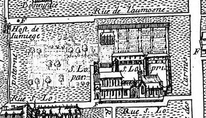L'ancien prieuré Saint-Lô se situe au cœur de la vieille ville de Rouen, à l'emplacement actuel du lycée Camille-Saint-Saëns ; son portail est inscrit au titre des monuments historiques depuis le 13 juillet 1926. Selon la légende, saint Mellon aurait fondé une église sur l'emplacement d'un temple gallo-romain dédié à Roth ; les fouilles de 1966 puis de 1991‑1993 ont montré que l'édifice a été établi sur les thermes antiques de la ville. Une première église, dédiée à saint Sauveur et à la Trinité, fut cédée en 913 par Rollon aux chanoines de la cathédrale de Coutances et entra ainsi dans l'« exemption de Coutances ». Après les invasions normandes, l'évêché s'y réfugia avec les reliques de saint Lô et de saint Romphaire et l'église devint la cathédrale Saint-Lô jusqu'au retour de l'évêque à Coutances en 1050. En 1143‑1144 la collégiale fut érigée en prieuré de chanoines réguliers par l'évêque Algare ; dans la seconde moitié du Xe siècle Hugues de Coutances avait déjà procédé à des agrandissements et les fondations de la « tour de Coutances », retrouvées en 1993, semblent dater de cette période. L'église était partagée entre le chœur du prieuré et la nef paroissiale ; dès le début du XIVe siècle des conflits opposèrent religieuses et paroissiens, puis la tour fut foudroyée en 1316 causant d'importants dégâts. En 1344 un mur sépara définitivement les deux espaces, et en 1346 le prieur Guillaume Le Bourg lança la construction d'une nouvelle église ; la tour fut reconstruite en 1362. Après le siège de 1418‑1419 l'ensemble conventuel et l'église risquèrent l'effondrement ; l'édifice fut reconstruit au milieu du XVe siècle et consacré par l'archevêque‑cardinal Guillaume d'Estouteville en 1455, puis agrandi en 1483 et de nouveau consacré en 1533. En 1562 les Huguenots pillèrent et brûlèrent le prieuré. Le logis prieural abrita entre 1580 et 1591 la première Chambre des comptes de Normandie, instituée par le roi Henri III. Au début du XVIIe siècle le prieuré était menacé de ruine et la « tour de Coutances » s'écroula en 1634 ; le 3 août 1639 le prieuré fut réformé et confié aux Génovéfains, le prieur disposant alors de l'autorité sur le prieuré et sur l'Hôtel‑Dieu. Supprimé en 1791, le prieuré fut réquisitionné pour servir de prison ; de 1793 à 1794 l'église fut utilisée comme temple protestant, puis en 1795 elle fut transformée en fabrique de salpêtre dite « Atelier de la Montagne » et s'effondra le 3 décembre 1798. La prison, trop vétuste, fut démolie après 1822. En 1829 une école normale d'instituteurs y fut installée et confiée aux Frères des Écoles chrétiennes jusqu'en avril 1880, puis, en 1886, une école primaire supérieure et professionnelle lui succéda. Aujourd'hui, le site est en grande partie occupé par le lycée Camille‑Saint‑Saëns ; du prieuré subsiste principalement le portail gothique de l'église prieurale. Les armes du prieuré sont d'or à un léopard de gueules, au chef endenté d'azur chargé de trois fleurs de lys d'or et de deux demi‑deniers d'or. De nombreux prieurs se sont succédé du Moyen Âge à l'époque moderne ; parmi ceux cités dans les sources figurent Osbert (venu de l'abbaye de Sainte‑Barbe‑en‑Auge), Adam (1205‑1219), Nicolas (1219‑1221), Richard des Osprais (†1256), Radulphe du Mesnil (1290‑), Guillaume Le Bourg (1411‑1455), Guillaume Le Moine (1455‑1483) et Pompilio d'Elmino (1536‑), premier prieur commendataire. Lieux de vie et de culte du centre‑ville, le prieuré et la paroisse conservent des traces d'événements notables : Jean II Restout, né le 26 mars 1692, fut baptisé le 28 mars 1692 avec pour parrain Jean Jouvenet, et plusieurs personnages y furent inhumés, notamment Gilbert de Rouen († avant 990), François de Marsillac († 1543), Marie‑Madeleine Jouvenet († 1698) et le peintre Jean Ier Restout, décédé le 21 octobre 1703 et inhumé dans la « chapelle de la ville » de Saint‑Lô en présence de son fils Jean II Restout.