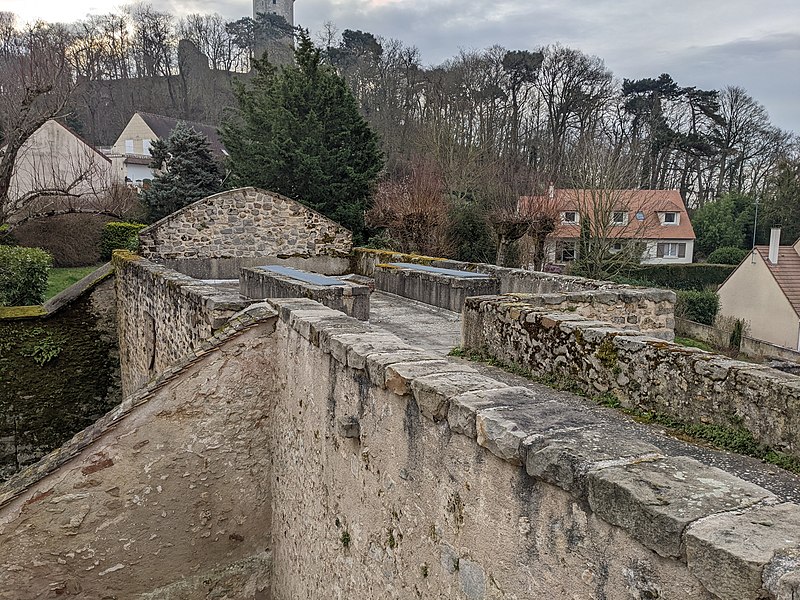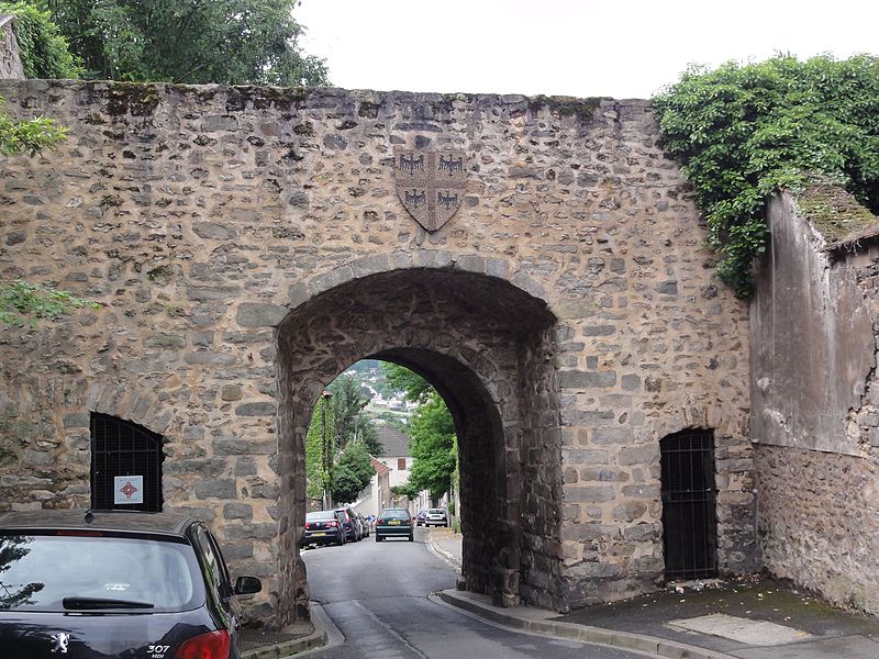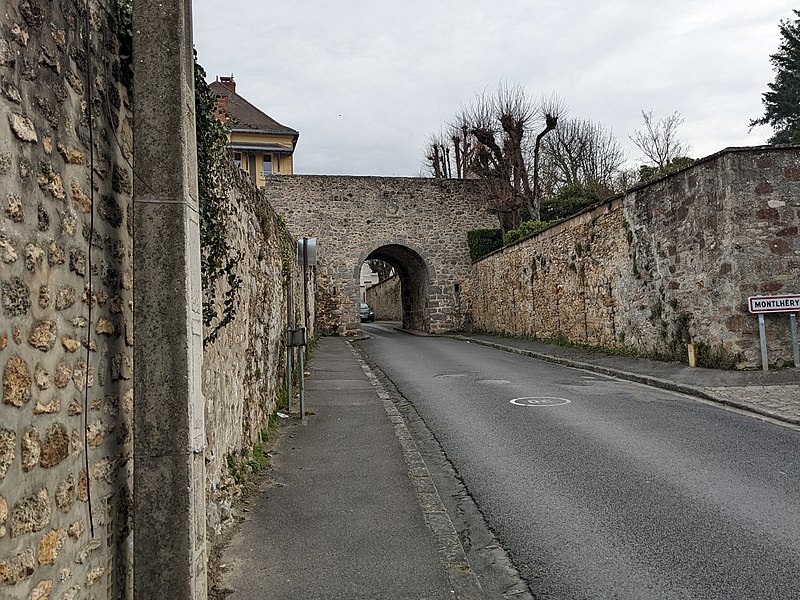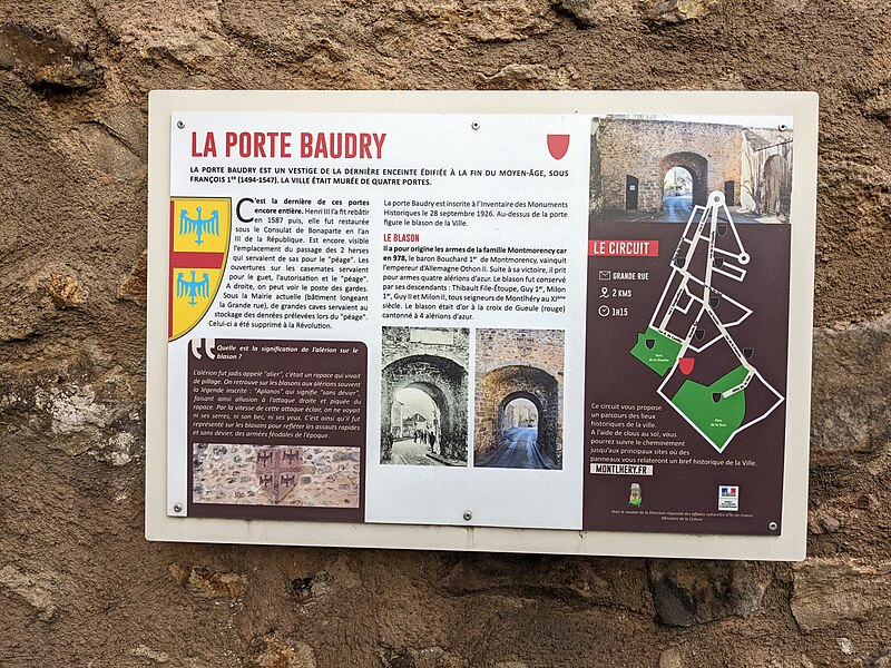 Sous François Ier, par lettres patentes du 9 juillet 1540, les habitants de Montlhéry reçurent l'autorisation d'entourer la ville de murailles munies de ponts-levis, de tours et de fossés. À l'exception de la porte Baudry, il ne subsistait alors aucune trace de la première enceinte qui, au début du XIe siècle (1015), reliait le château au bourg. Le bourg ayant souffert pendant les guerres de religion, Henri III, le 9 décembre 1587, ordonna aux habitants de réparer les fortifications. Les matériaux issus du démantèlement du château après 1591 servirent à achever les murs d'enceinte. Les fortifications apparaissent sur les gravures de Châtillon (début du XVIIe siècle) et de La Pointe (deuxième moitié du XVIIe siècle). Quatre portes donnaient accès à la ville : la porte Baudry, ouvrant sur la voie royale Paris‑Orléans, rebâtie sous Henri III en 1589 et restaurée en l'an VII puis en 1985 ; la porte de la Borde, côté Longpont, dont une tour a été reconstruite au XIXe siècle et intégrée aux bâtiments de l'institution Barbe ; la porte du Montoire, qui permettait de rejoindre la vallée de Marcoussis par un chemin très pentu ; et la porte de Paris, abattue en 1757 pour laisser passer les véhicules chargés de récoltes, dont des vestiges subsistèrent jusqu'au début du XXe siècle. Une cinquième porte, située sur l'actuelle rue Luisant, figure sur un plan de dîmage conservé aux Archives nationales. Les fossés furent transformés en jardins en 1767 et 1771. Des vestiges des murs d'enceinte subsistent dans le parc de la Souche et près de l'ancienne porte du Montoire. La porte Baudry, seule encore debout, a été inscrite à l'inventaire supplémentaire des monuments historiques en 1926.
