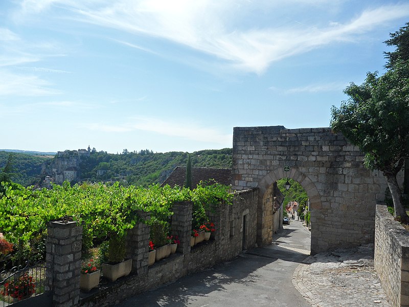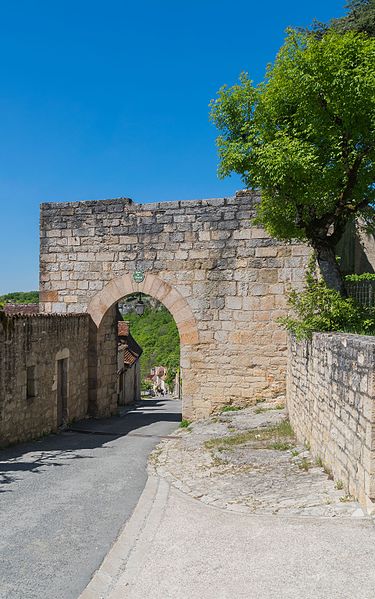 Venant de l'Hospitalet, les pèlerins empruntaient le Cami Roumiou pour franchir cette première porte fortifiée. Sa structure et son appareil sont comparables à ceux des autres portes de la ville, ce qui laisse à penser qu'elle appartient à l'ensemble vraisemblablement mis en place au XIIIe siècle, avant 1303. La dernière restauration a été réalisée en 1975-1976 (J. Rocacher, 1979, p. 239).