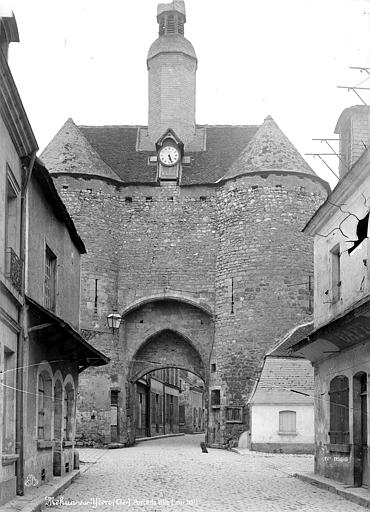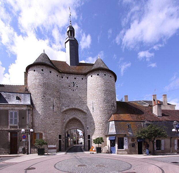 La porte de Ville dite Porte de l'Horloge est un édifice du XIIIe siècle situé à Mehun-sur-Yèvre (Cher), en région Centre-Val de Loire. À la fin du XIIIe siècle, la ville fut entourée de nouveaux remparts comportant deux portes ; la porte de l'Horloge, anciennement appelée porte de Bourges, est la seule à subsister. Elle fait partie des fortifications élevées en même temps que le château et la collégiale. L'édifice a connu quelques modifications au cours du XVIIIe siècle ; le lanternon, probablement ajouté à la même époque, abrite une cloche en bronze fondue par le duc Jean de Berry en 1394. Cette cloche a été classée au titre des objets des monuments historiques en 1943 et la porte elle‑même a été classée par arrêté le 26 avril 1893. L'ouvrage est construit en pierre de taille et en moellon de calcaire. La charpente, en chêne, est composée de chevrons formant une ferme et de deux fermes principales. Les tours sont couvertes d'éclisses de châtaignier, le passage de tuiles plates et le clocheton d'ardoises. Le passage s'ouvre par trois arcades, encadré par deux tours massives et surmonté du clocheton contenant la cloche en bronze. À l'étage, la salle de guet occupe l'espace des tours et la liaison qui les unit ; elle n'est accessible que par le chemin de ronde. Des ressources complémentaires figurent dans la base Mérimée, sur Structurae et sur les portails consacrés aux monuments historiques, à l'architecture et au département du Cher.