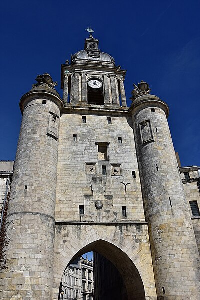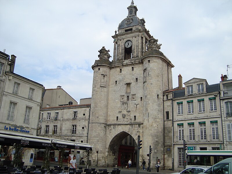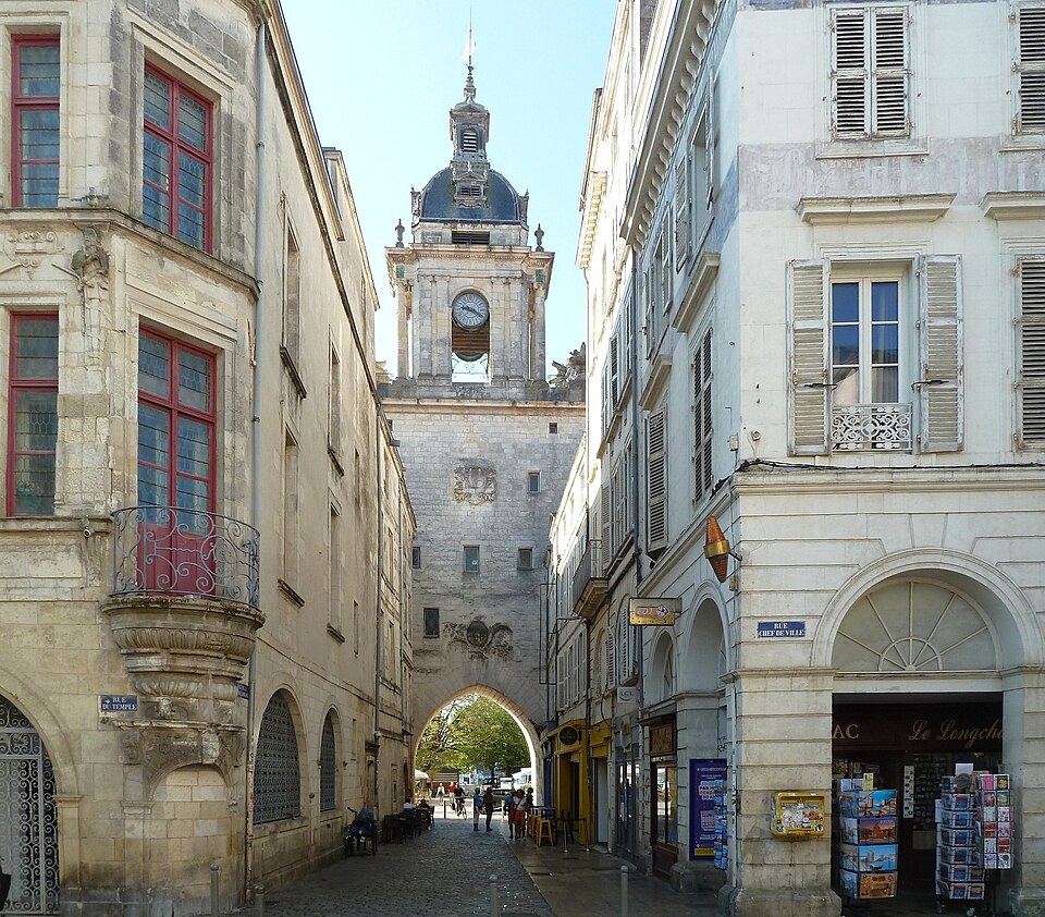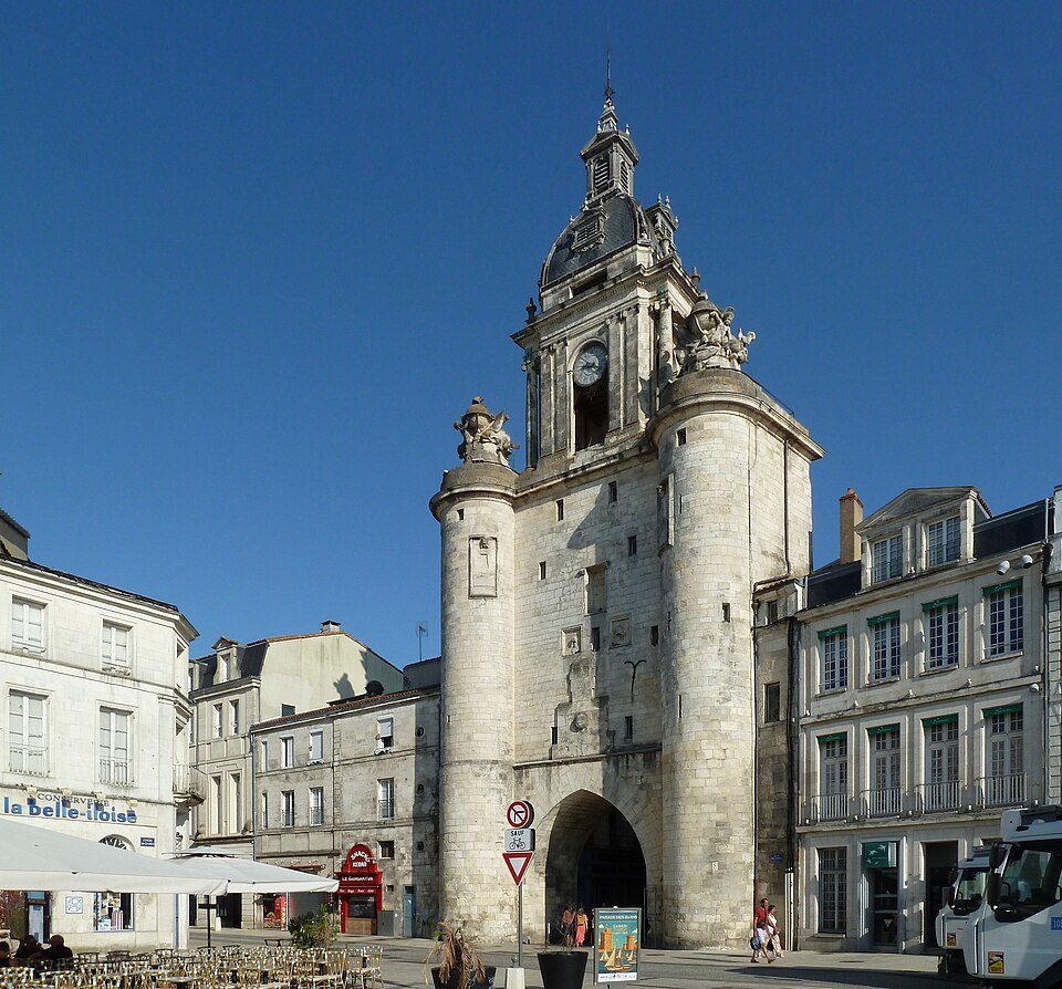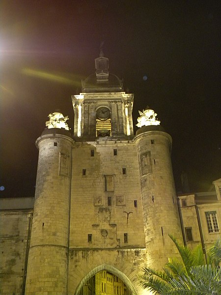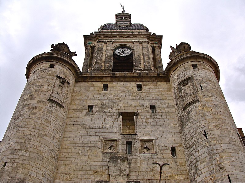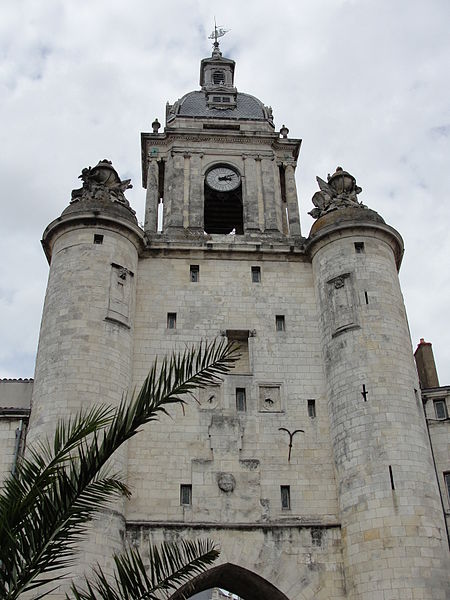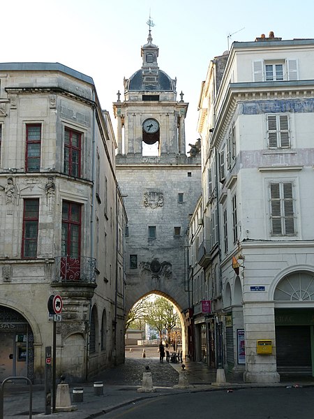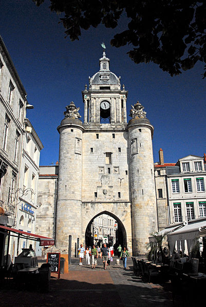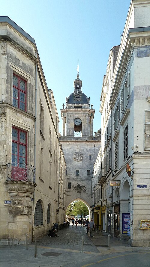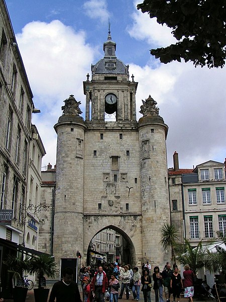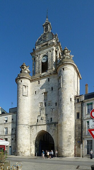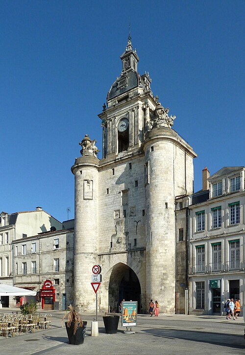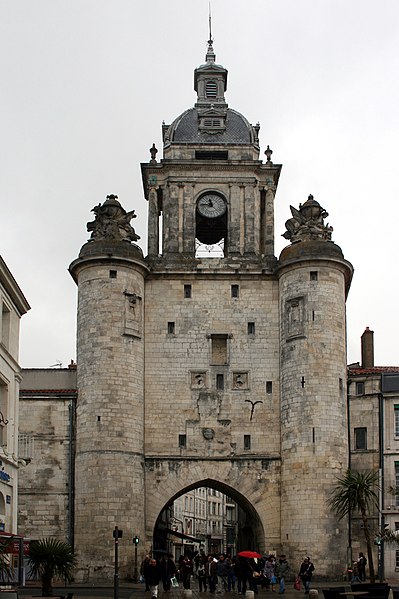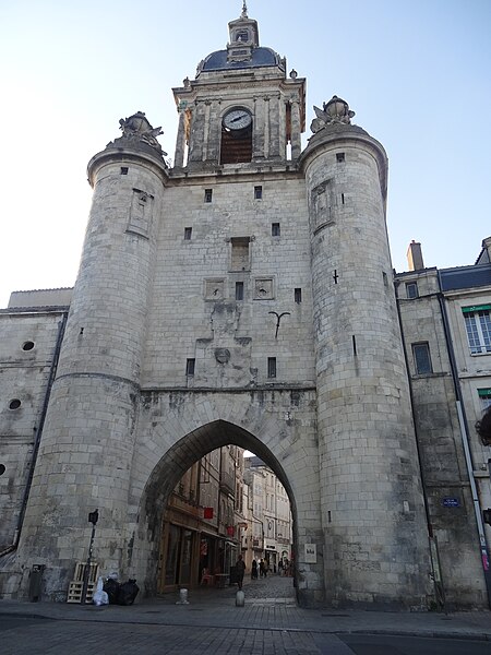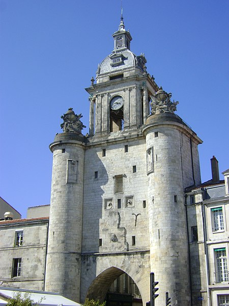 La Porte de la Grosse-Horloge reliait autrefois la vieille ville au port, appartenant à l'enceinte intérieure qui protégeait La Rochelle des incursions maritimes. Les sources évoquent ses origines médiévales, certaines la situant au début du XIIe siècle lors de la construction de la première enceinte, d'autres au début du XIVe siècle. Au XIVe siècle, l'édifice était rectangulaire, surmonté d'un campanile et flanqué de deux tourelles coiffées en poivrière, et il ouvrait par deux baies inégales sur le port et le faubourg du Perrot. En 1478 on y installa une cloche et une horloge, faisant de la porte le beffroi de la ville en remplacement de la porte de Mallevault. En 1594 le maire Jean Rochelle ordonna la reconstruction du campanile et d'une des tours. En 1672 l'architecte Moyse réunit les deux ouvertures en une seule arcade pour faciliter la circulation. Les parties hautes furent largement transformées entre 1744 et 1746 ; Gendrier, qui signe les devis à partir de 1743, est probablement l'auteur de cette transformation. Malgré ces réfections successives, les parties basses conservent l'allure médiévale d'origine. La tour quadrangulaire présente côté port des arêtes amorties en tourelles, initialement crénelées, puis coiffées au XVe siècle d'un faîtage conique à tuiles imbriquées. Le beffroi est percé d'une arcade en plein cintre sur chacune de ses faces ; des pilastres jumelés d'ordre ionique ornent les façades donnant sur le port et la ville, tandis que des colonnes à chapiteaux ioniques décorent les petits côtés. Un entablement à corniche débordante couronne la partie inférieure ; au-dessus, un attique supporte un dôme coiffé d'une lanterne percée de quatre arcades ornées de pilastres couplés d'ordre composite. Les deux anciennes tourelles qui flanquent la tour côté port sont couronnées de trophées représentant des allégories astronomiques et maritimes. Devenue moins utile après l'agrandissement de la ville, la porte est néanmoins restée un des principaux points de passage entre les quais et la vieille ville. Elle a aussi vu passer l'éphémère tramway de La Rochelle et a abrité pendant quelques années un musée archéologique consacré aux Templiers rochelais. La porte de la Grosse-Horloge est classée au titre des monuments historiques par arrêté du 13 décembre 1978.