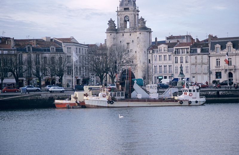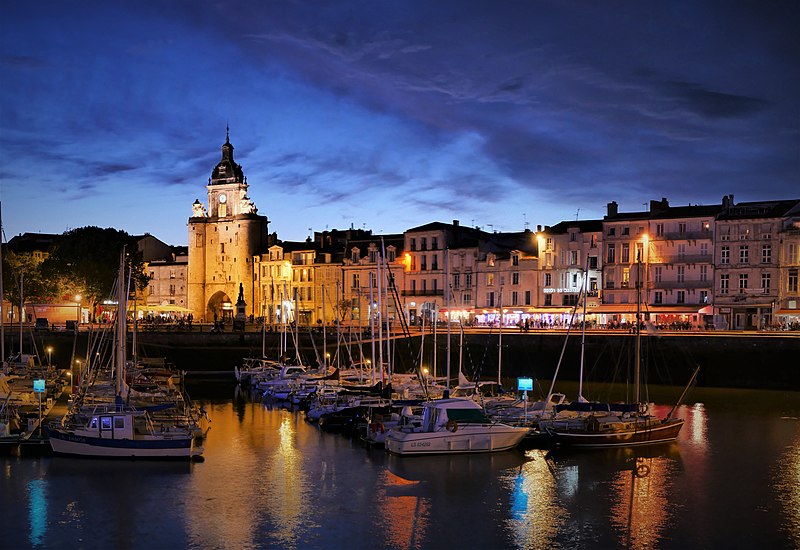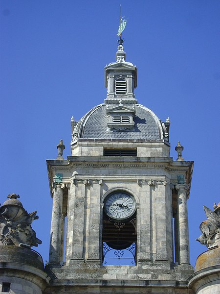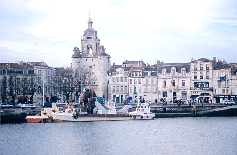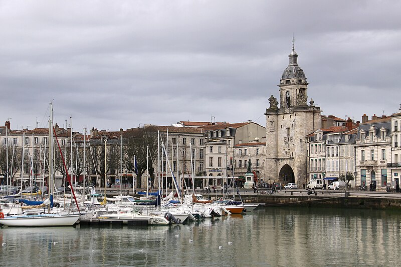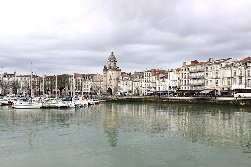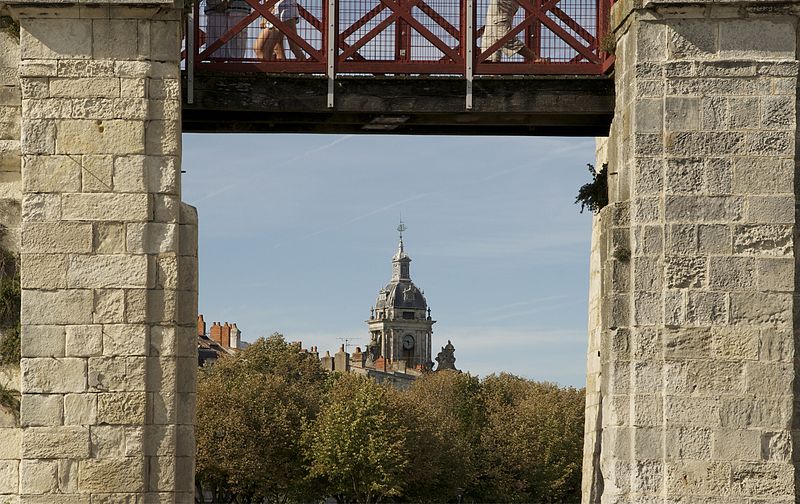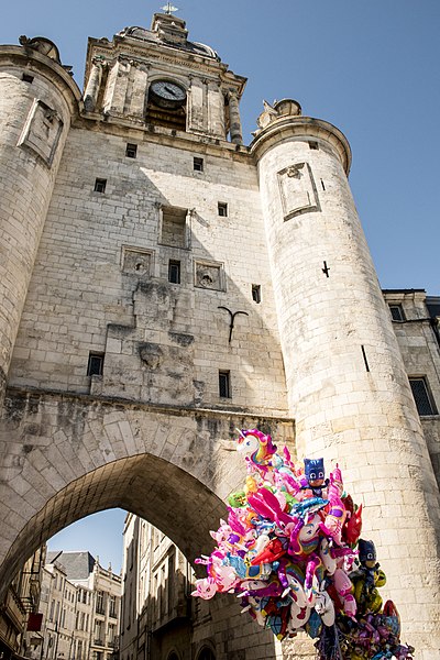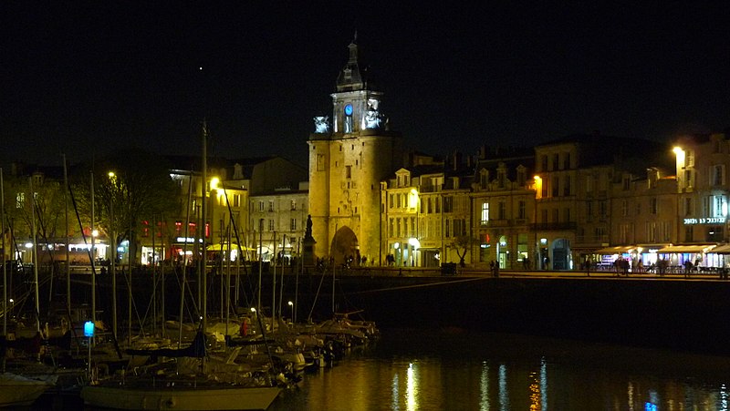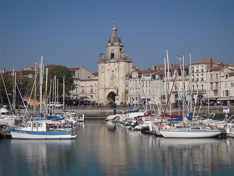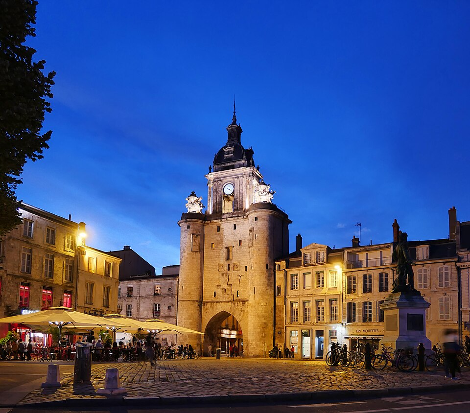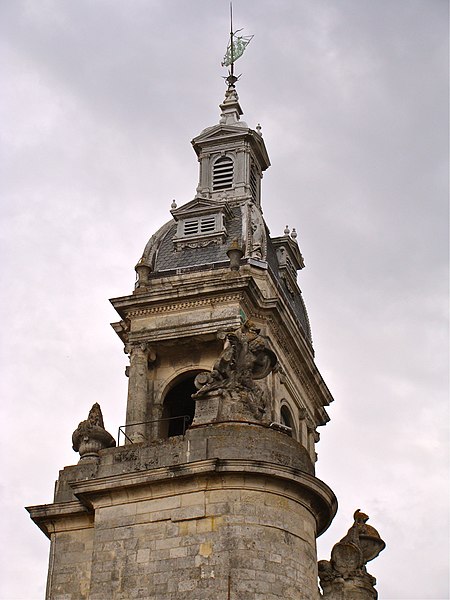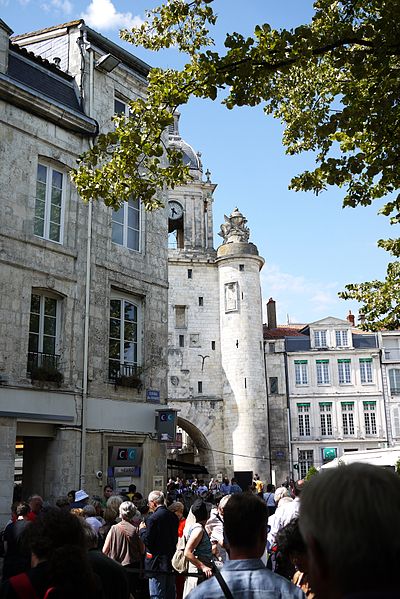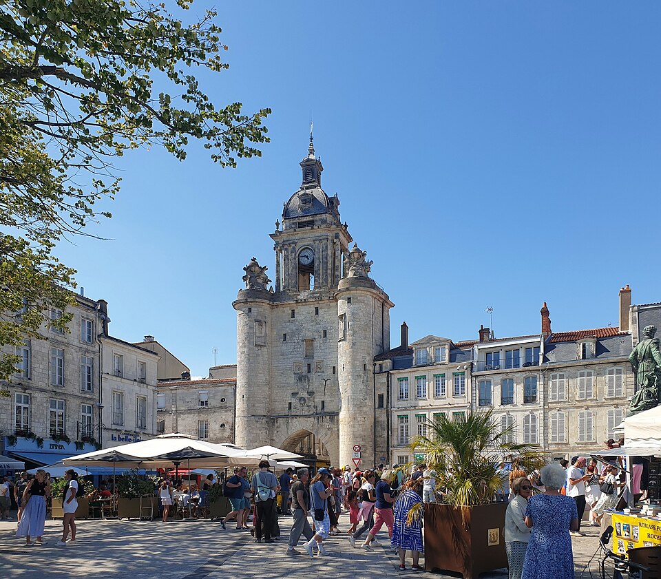 La Porte de la Grosse-Horloge reliait autrefois la vieille ville au port, appartenant à l'enceinte intérieure qui protégeait La Rochelle des incursions maritimes. Les sources évoquent ses origines médiévales, certaines la situant au début du XIIe siècle lors de la construction de la première enceinte, d'autres au début du XIVe siècle. Au XIVe siècle, l'édifice était rectangulaire, surmonté d'un campanile et flanqué de deux tourelles coiffées en poivrière, et il ouvrait par deux baies inégales sur le port et le faubourg du Perrot. En 1478 on y installa une cloche et une horloge, faisant de la porte le beffroi de la ville en remplacement de la porte de Mallevault. En 1594 le maire Jean Rochelle ordonna la reconstruction du campanile et d'une des tours. En 1672 l'architecte Moyse réunit les deux ouvertures en une seule arcade pour faciliter la circulation. Les parties hautes furent largement transformées entre 1744 et 1746 ; Gendrier, qui signe les devis à partir de 1743, est probablement l'auteur de cette transformation. Malgré ces réfections successives, les parties basses conservent l'allure médiévale d'origine. La tour quadrangulaire présente côté port des arêtes amorties en tourelles, initialement crénelées, puis coiffées au XVe siècle d'un faîtage conique à tuiles imbriquées. Le beffroi est percé d'une arcade en plein cintre sur chacune de ses faces ; des pilastres jumelés d'ordre ionique ornent les façades donnant sur le port et la ville, tandis que des colonnes à chapiteaux ioniques décorent les petits côtés. Un entablement à corniche débordante couronne la partie inférieure ; au-dessus, un attique supporte un dôme coiffé d'une lanterne percée de quatre arcades ornées de pilastres couplés d'ordre composite. Les deux anciennes tourelles qui flanquent la tour côté port sont couronnées de trophées représentant des allégories astronomiques et maritimes. Devenue moins utile après l'agrandissement de la ville, la porte est néanmoins restée un des principaux points de passage entre les quais et la vieille ville. Elle a aussi vu passer l'éphémère tramway de La Rochelle et a abrité pendant quelques années un musée archéologique consacré aux Templiers rochelais. La porte de la Grosse-Horloge est classée au titre des monuments historiques par arrêté du 13 décembre 1978.